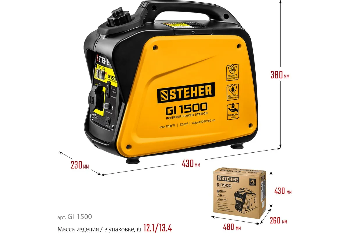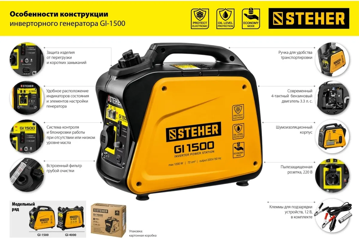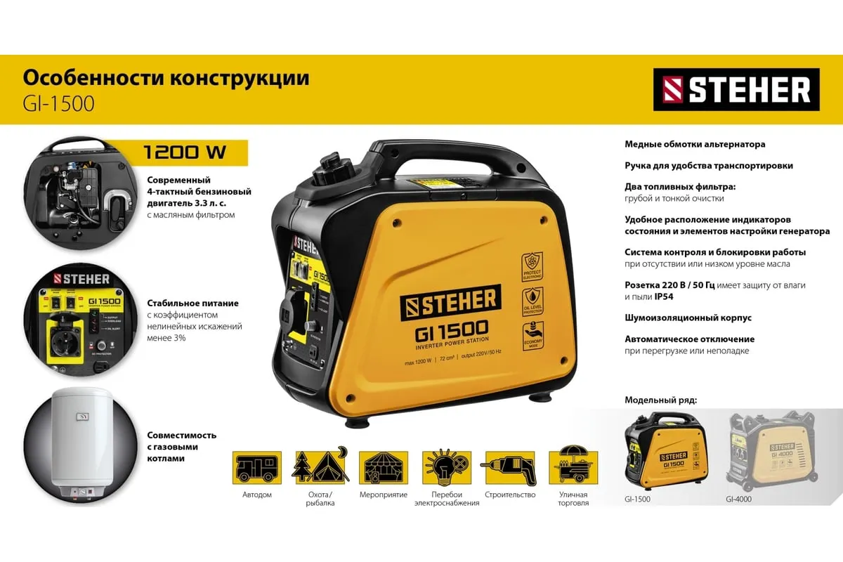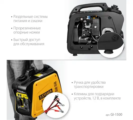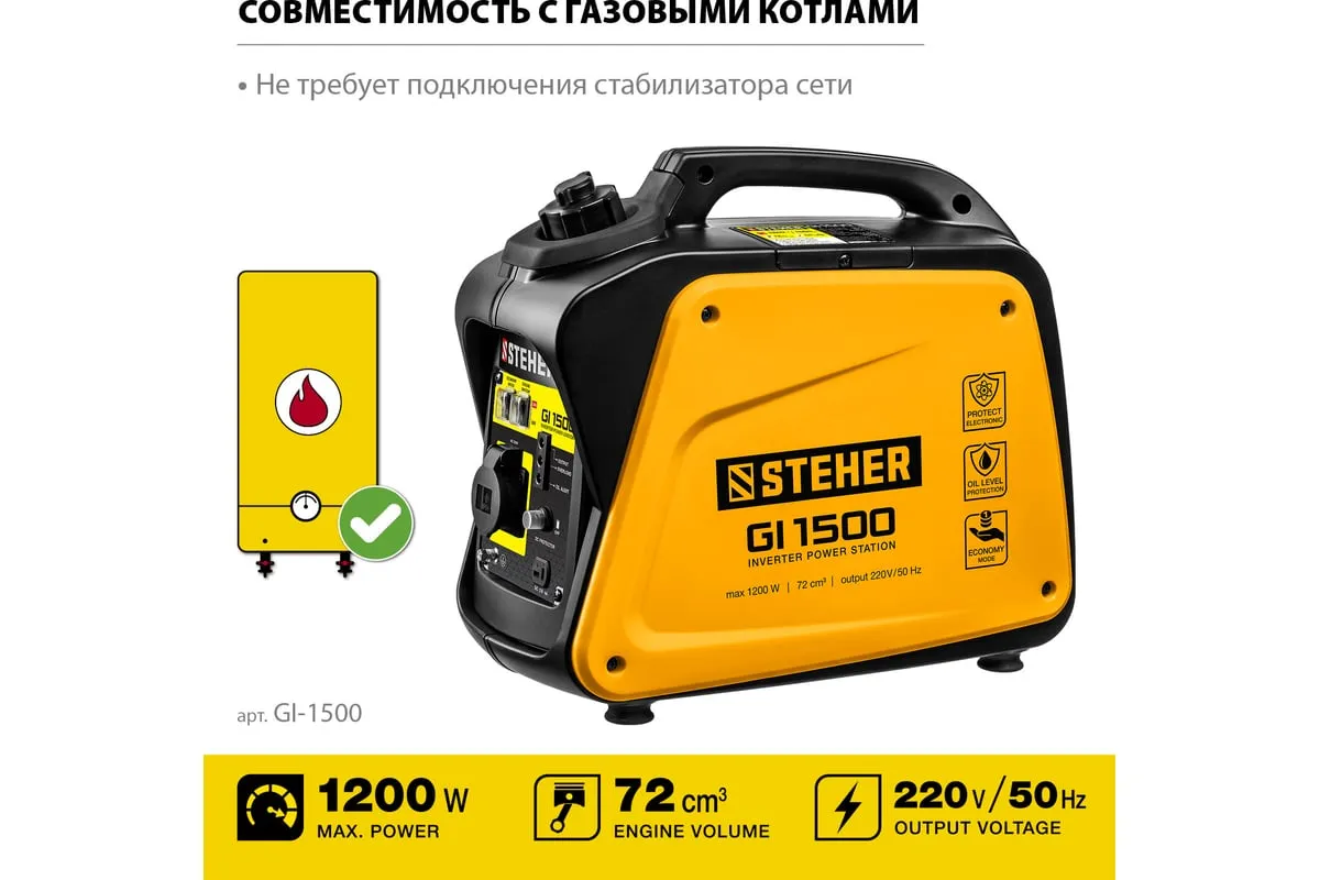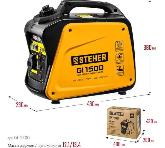 Инверторный генератор STEHER 1200 Вт GI-1500 отличается компактными размерами и небольшим весом, что позволяет использовать его в походе, в кемпинговом лагере, на рыбалке, на пляже. Модель с легкостью обеспечивает питание и зарядку гаджетов и мелкой бытовой техники. Инверторный принцип работы гарантирует идеальное качество вырабатываемой электроэнергии и позволяет использовать станцию без стабилизатора. Предусматривается дополнительный выход на 12 В для подзарядки аккумуляторов.