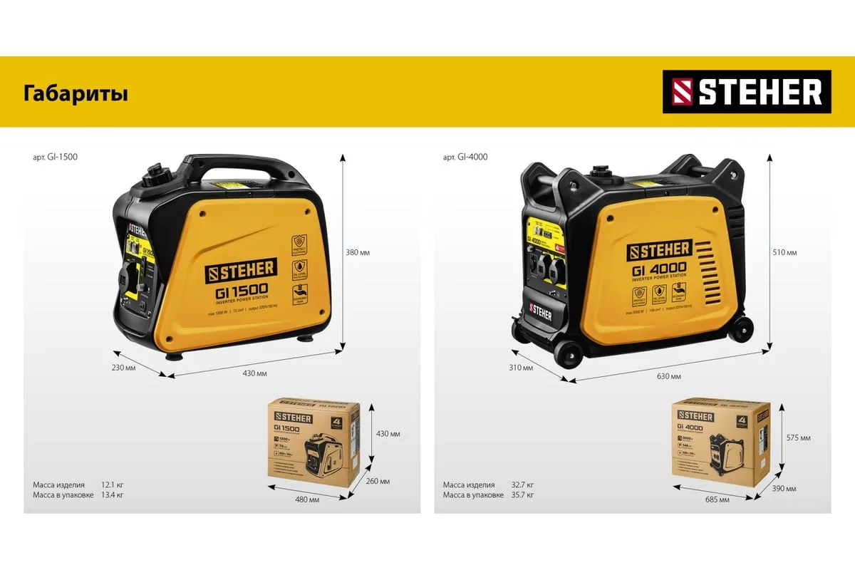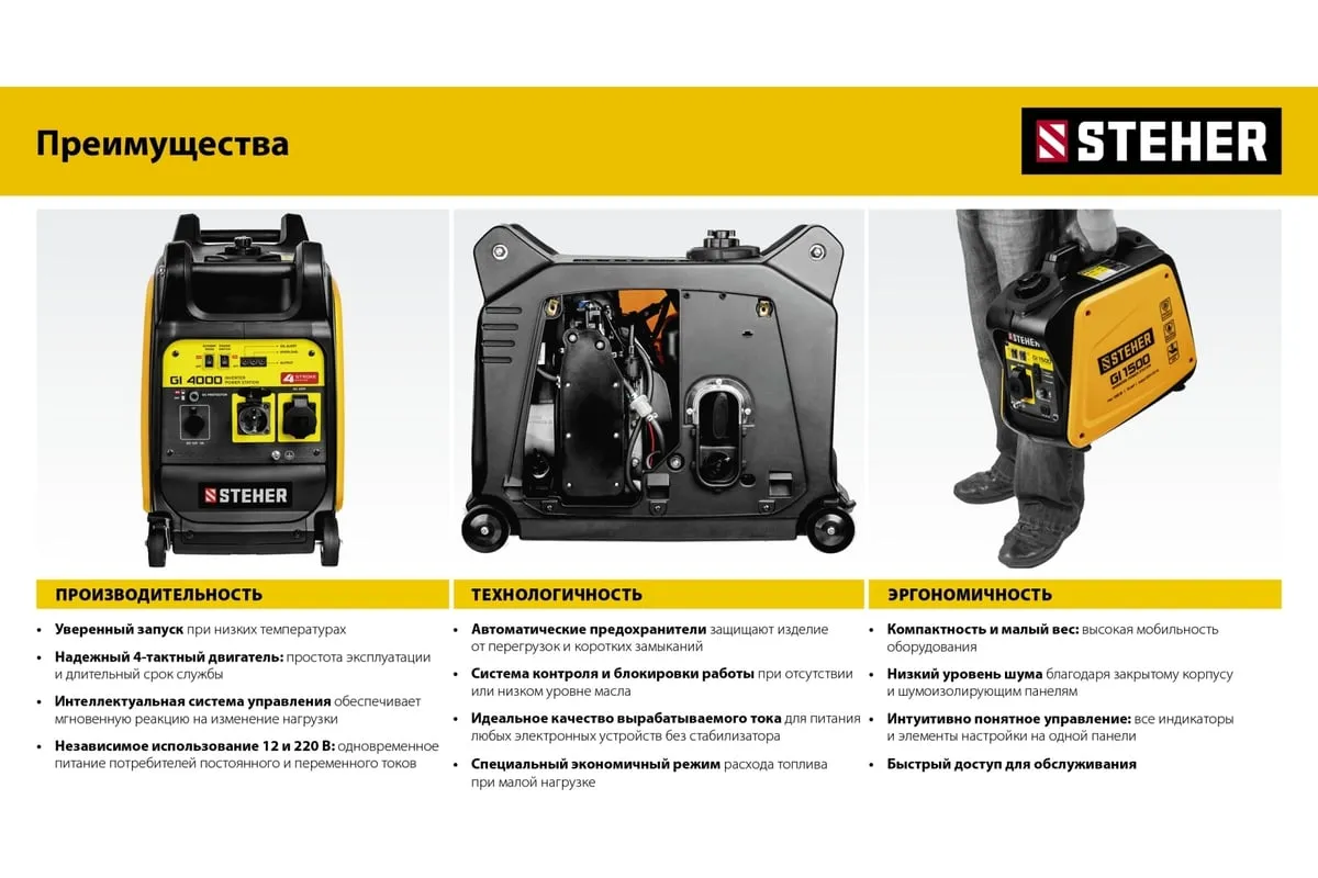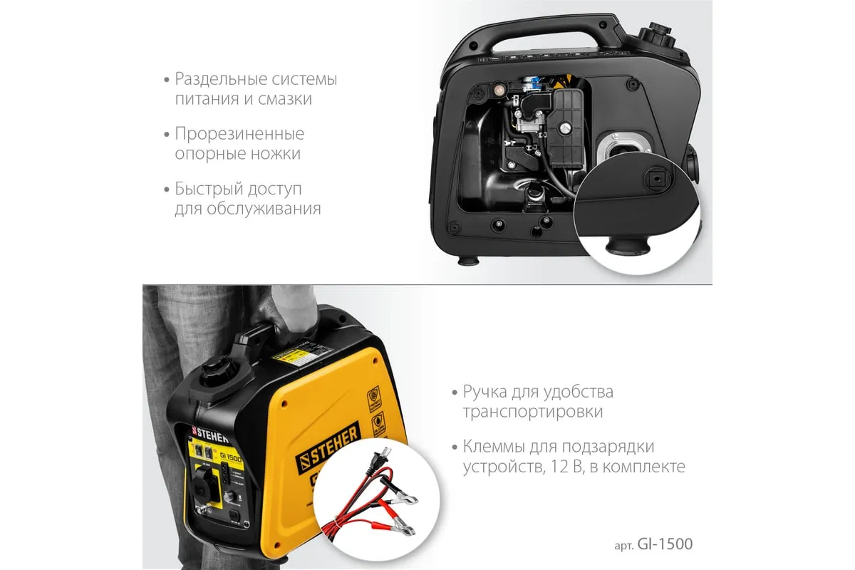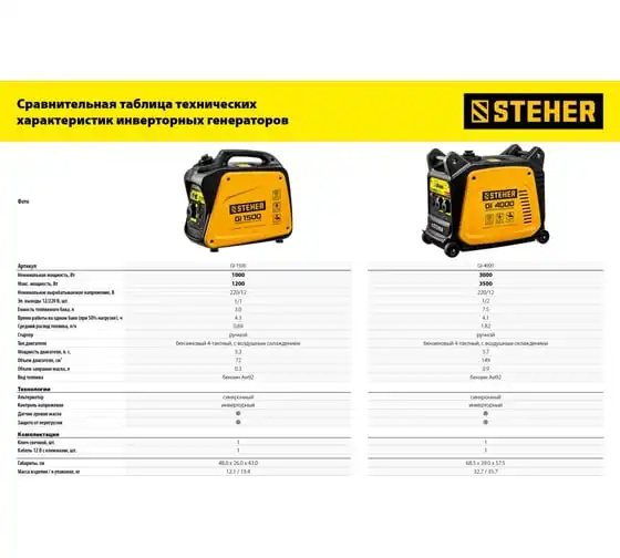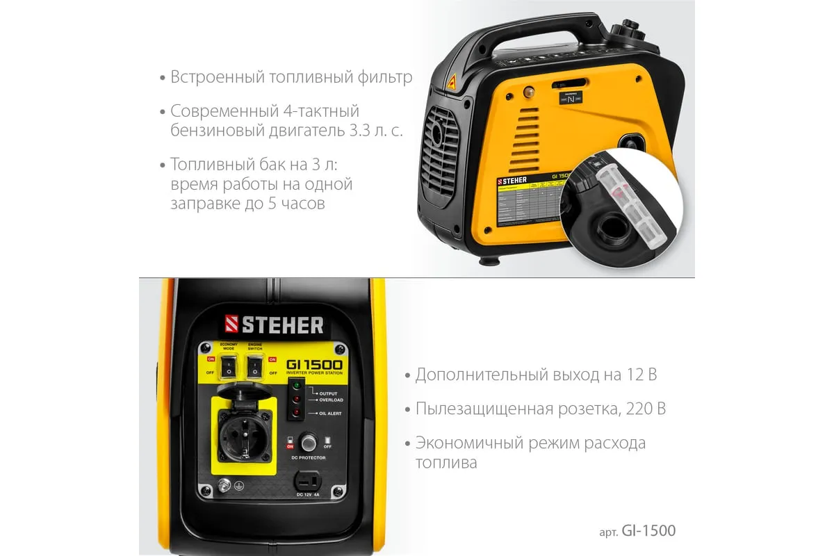 Инверторный генератор STEHER 1200 Вт GI-1500 отличается компактными размерами и небольшим весом, что позволяет использовать его в походе, в кемпинговом лагере, на рыбалке, на пляже. Модель с легкостью обеспечивает питание и зарядку гаджетов и мелкой бытовой техники. Инверторный принцип работы гарантирует идеальное качество вырабатываемой электроэнергии и позволяет использовать станцию без стабилизатора. Предусматривается дополнительный выход на 12 В для подзарядки аккумуляторов.