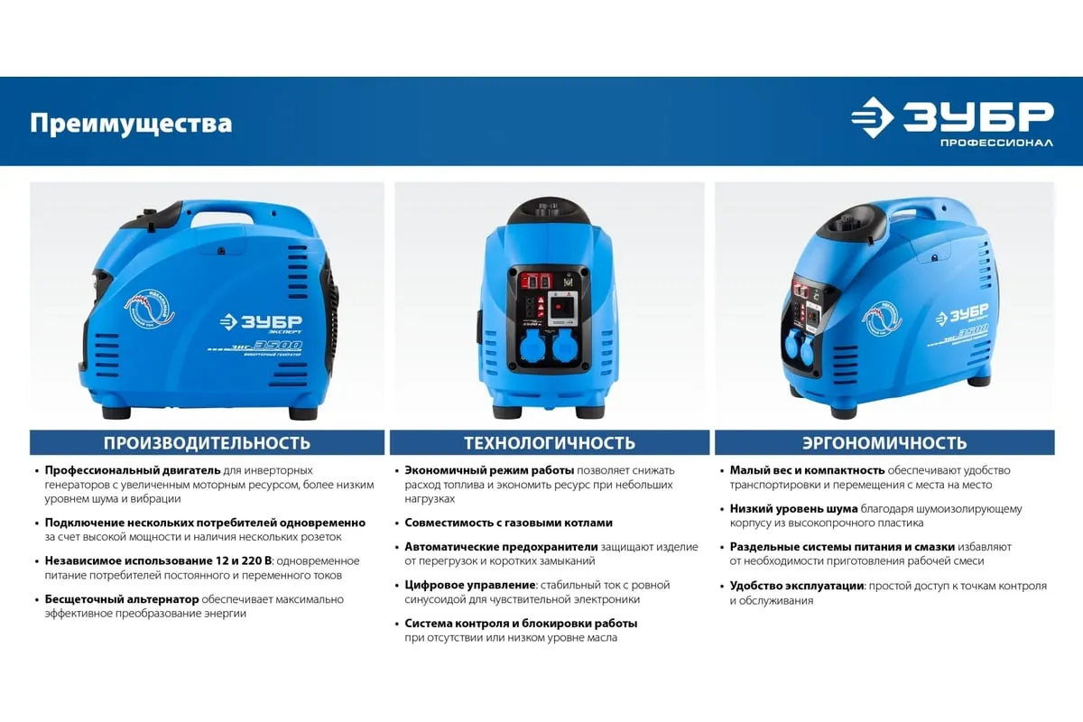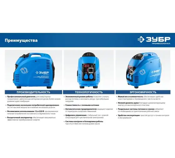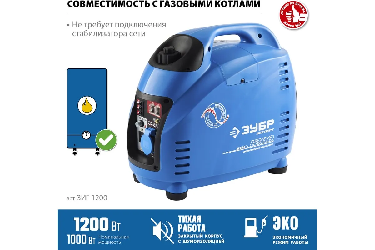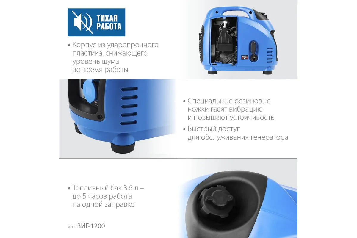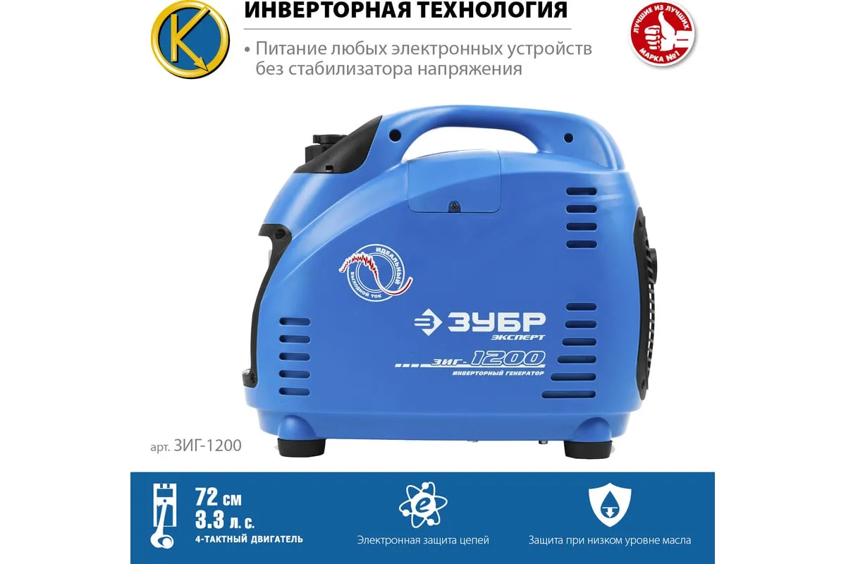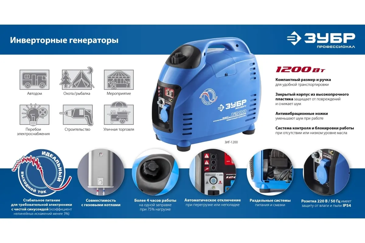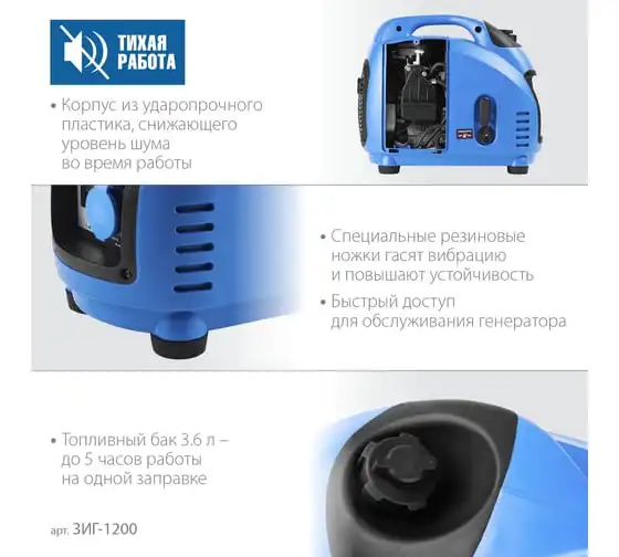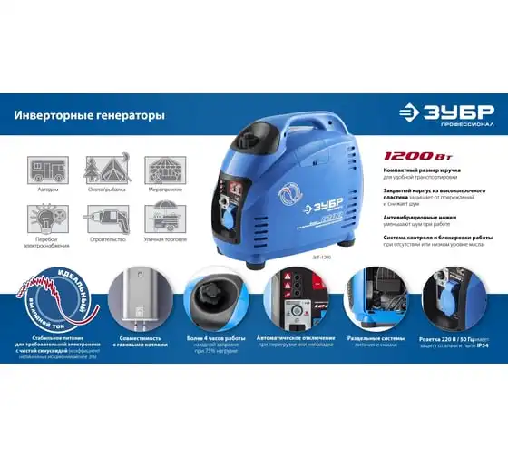 Инверторный генератор ЗУБР Профессионал 1200 Вт ЗИГ-1200 - это мобильное устройство, предназначенное для качественного энергоснабжения различных приборов мощностью до 1 кВт. Малый вес и компактный корпус позволяют брать станцию с собой на природу, в поход, на дачу и хранить дома. Пластиковый закрытый корпус хорошо поглощает шум. Инверторная технология, реализованная в данной модели, обеспечивает отличные характеристики генерируемого тока, что дает возможность использовать его для питания требовательных к качеству электричества приборов.