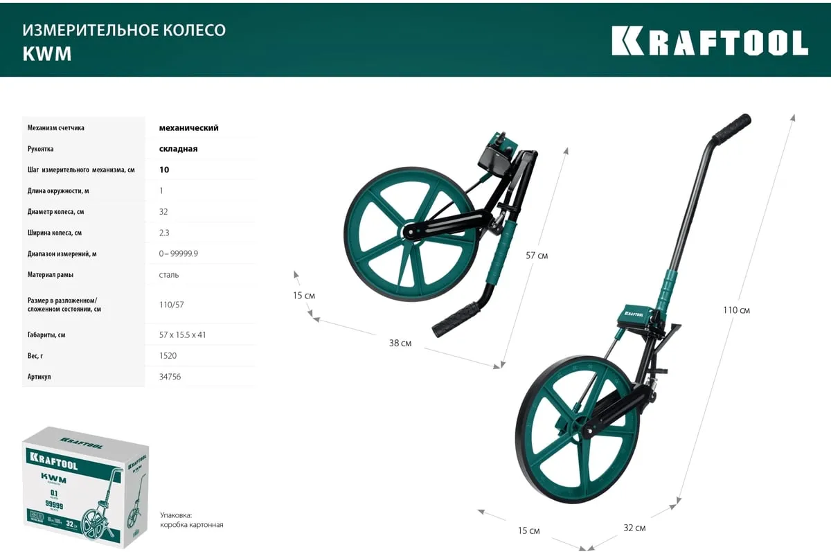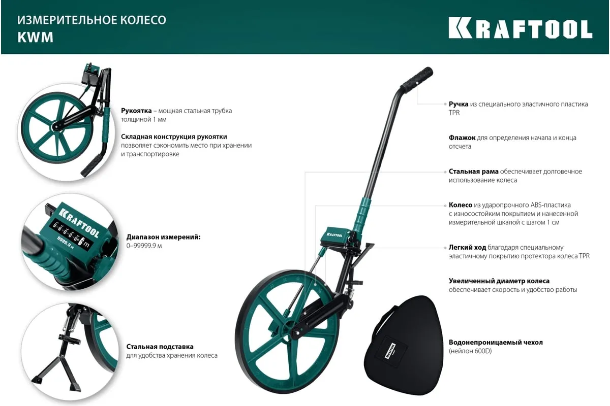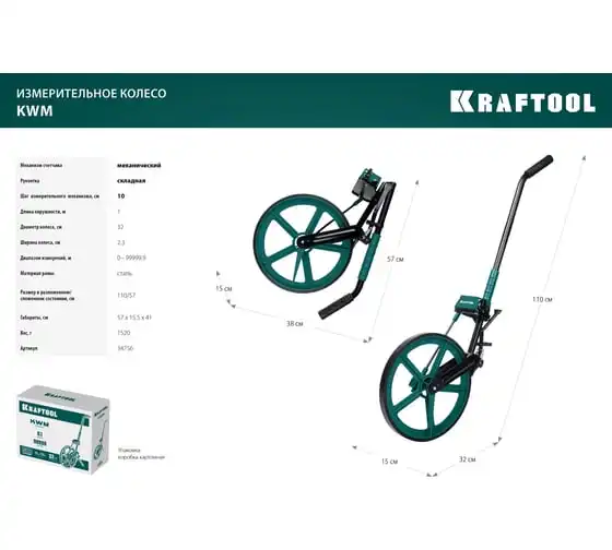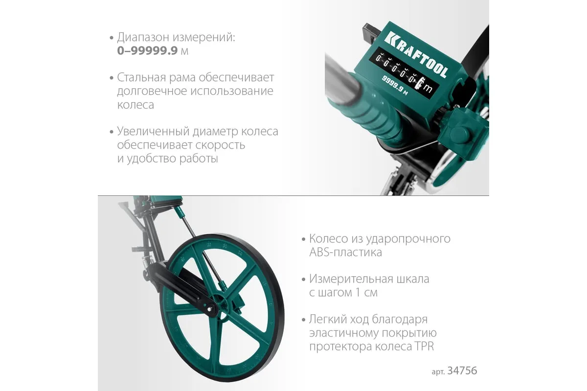 Измерительное колесо 99999 м KRAFTOOL 34756 - профессиональный инструмент для измерения больших расстояний при строительных работах, работах по прокладке кабелей, работах по землеустройству и незаменимо при составлении схем ДТП.
