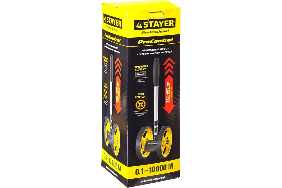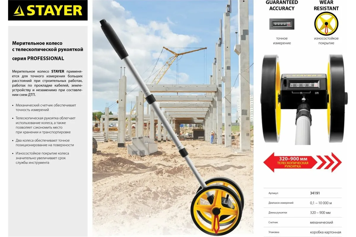 Измерительное колесо колесо STAYER PROFESSIONAL 34191 служит для измерения больших расстояний при проведении строительных работ, землеустройства, составлении схем ДТП. Имеет надежный механический счетчик. Телескопическая рукоятка регулируется в диапазоне 320-900 мм для удобства пользователя. Два колеса обеспечиваютточное позиционированиена поверхности.
