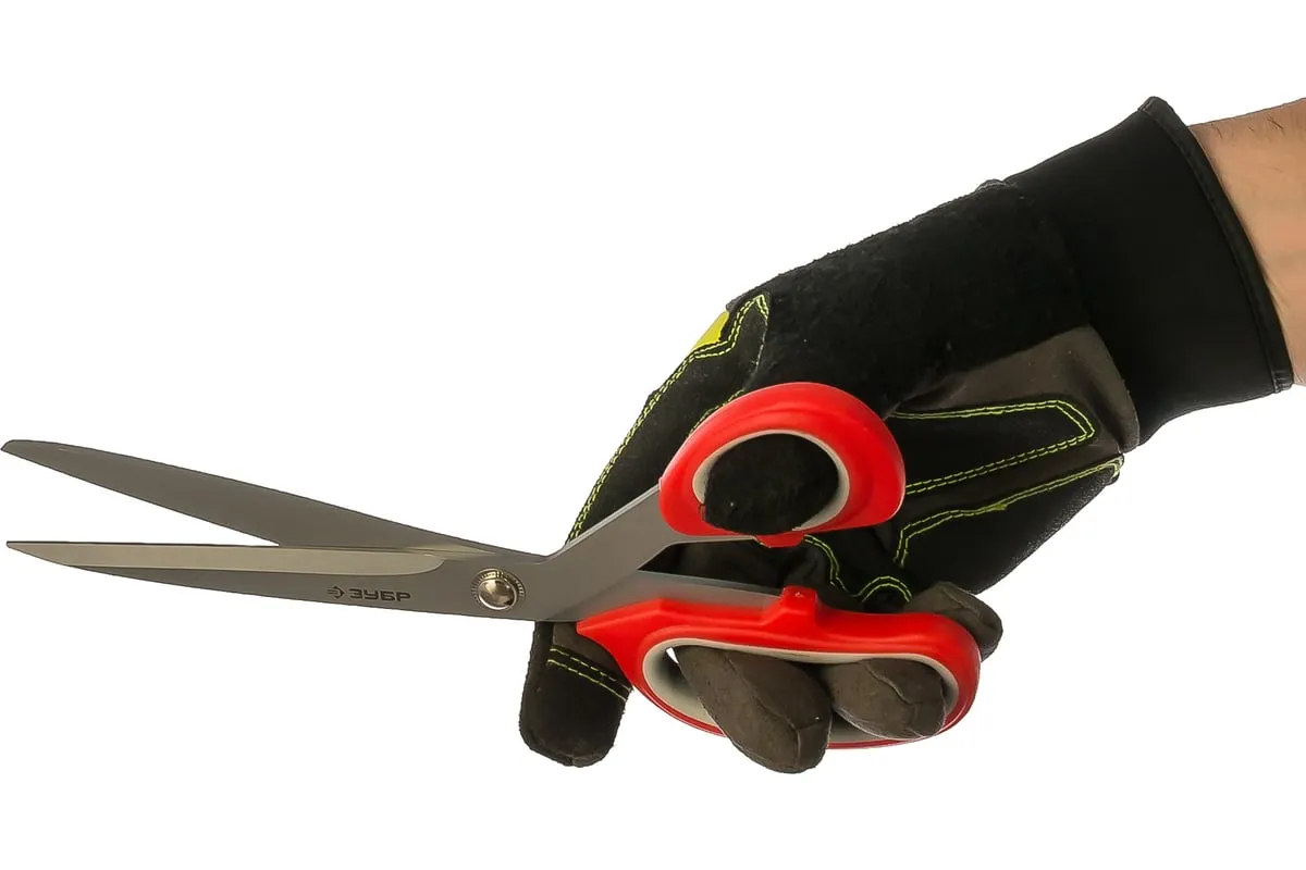 Изогнутые хозяйственные ножницы 230мм ЗУБР МАСТЕР 40442-24 - это профессиональный инструмент для разрезания тонких материалов, например, бумаги, плёнки, картона. Высокие режущие свойства сохраняются долгое время благодаря закалке лезвий. Изделие выполнено из нержавеющей стали для долгого срока службы.