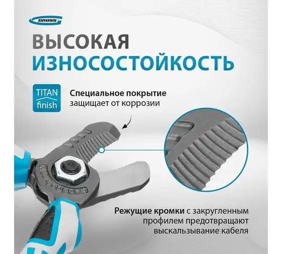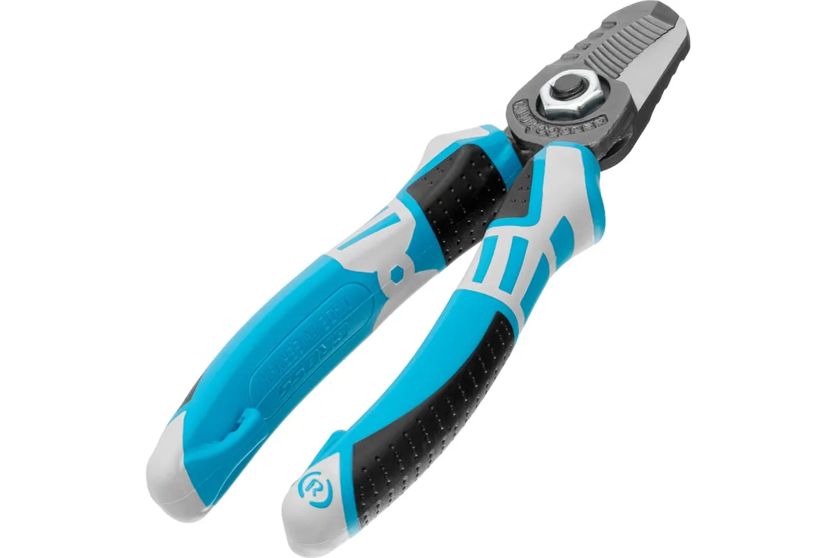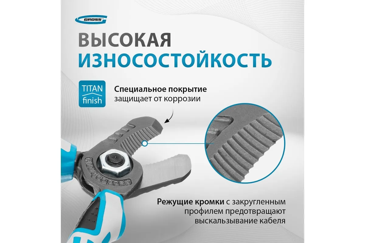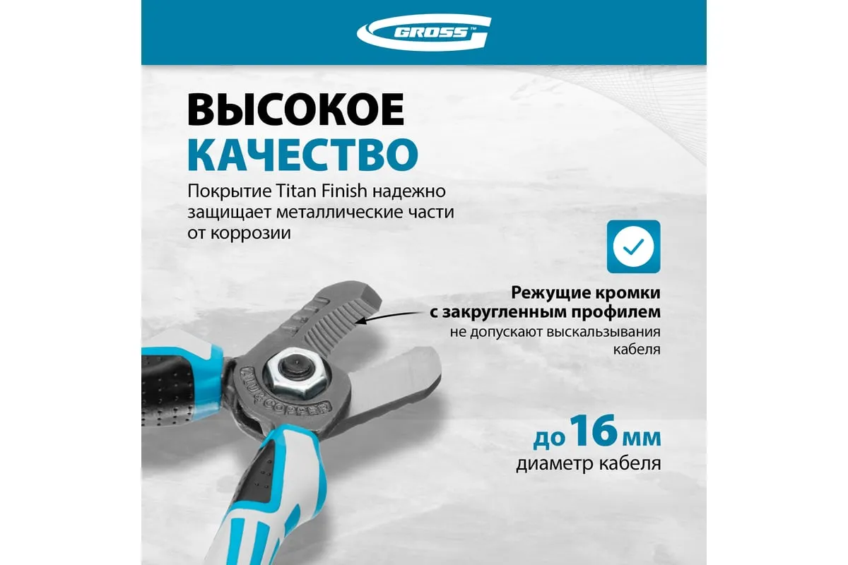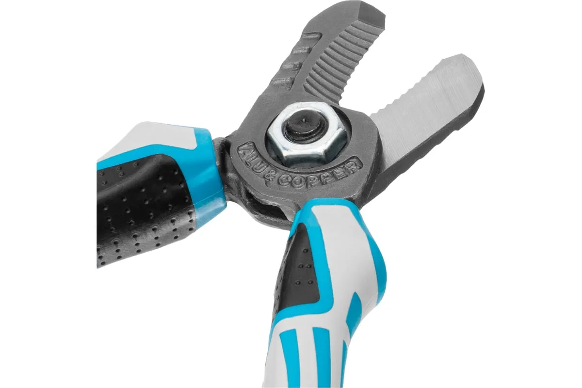 Кабелерез, 160 мм GROSS 17726 применяется для снятия изоляции и перекусывания алюминиевых и медных кабелей. Рекомендуется использовать инструмент для работ с одножильными и многожильными кабелями, имеющими сечение до 50 мм2 или диаметр до 16 мм. Изделие отличается прочностью и удобством в применении. ВАЖНО! Применяется только для МНОГОПРОВОЛОЧНЫХ ЖИЛ! Рабочая часть выполнена из стали и имеет защитное антикоррозийное покрытие. Эргономичные трехкомпонентные рукоятки не скользят в руке. Наличие закругленного профиля режущих кромок с зубцами увеличивает эффективность реза и исключает выскальзывание кабеля. Инструмент не предназначен для работ с холоднотянутыми медными проводами, алюминиевыми сплавами и стальной проволокой.