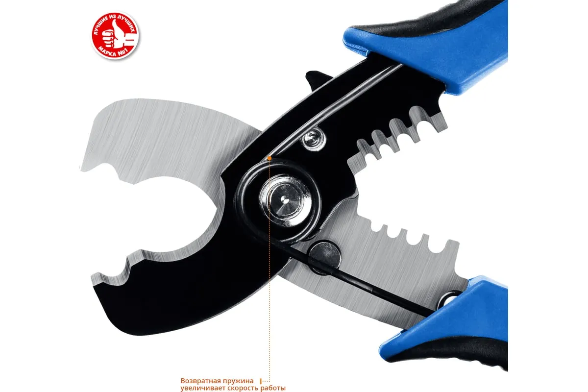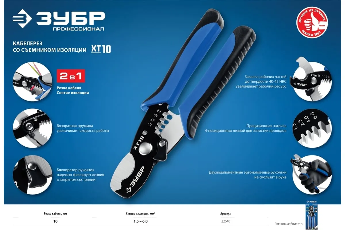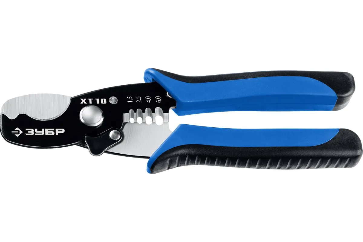 Кабельные ножницы 2в1 ЗУБР ХТ-10, 22640 предназначены для резки небронированного одножильного и многожильного кабеля из цветных металлов без деформации и замятия краев. Изготовлены из высококачественной стали, предназначены для профессионального применения. Обладают повышенным ресурсом, обеспечивают высокое качество электромонтажных работ. Применяются для снятия изоляции 1.5-6.0 мм2, а так же для резки кабеля толщиной до 10 мм. Данная модель оснащена возвратной пружиной, что значительно упрощает работу и увеличивает ее скорость. Рукоятки имеют специальный замок для блокировки лезвий в закрытом состоянии. Это обеспечивает безопасное хранение и транспортировку инструмента.