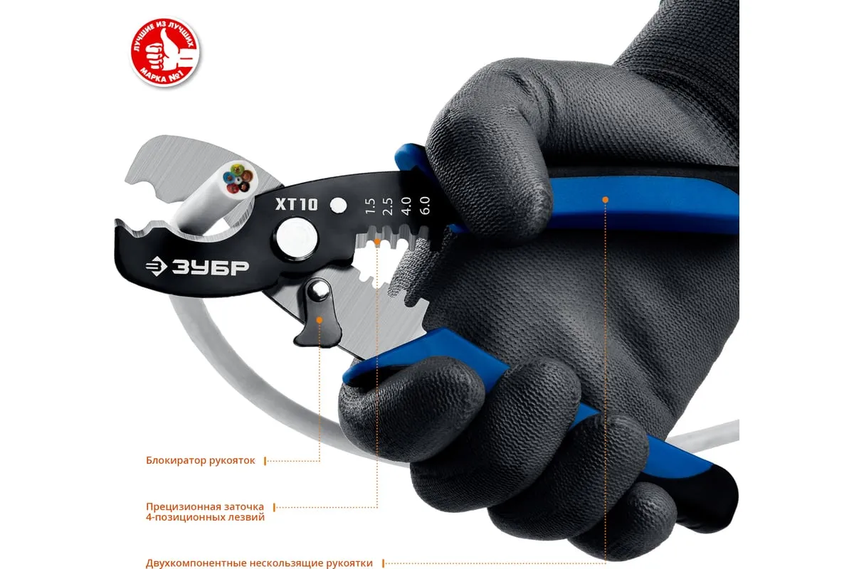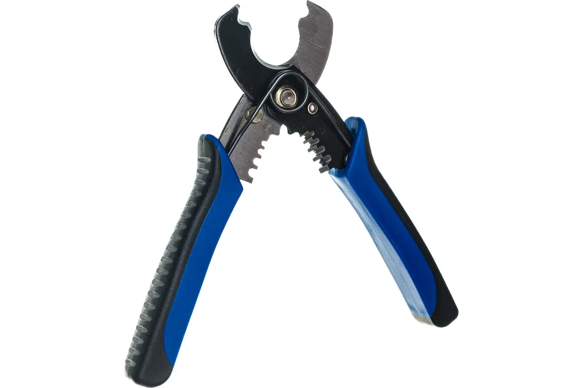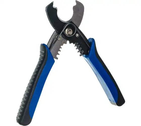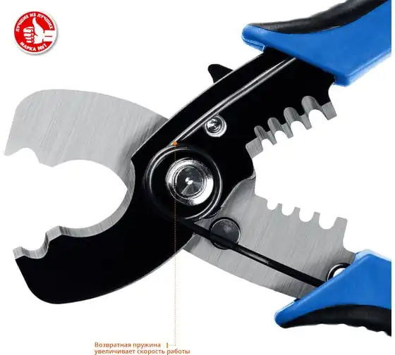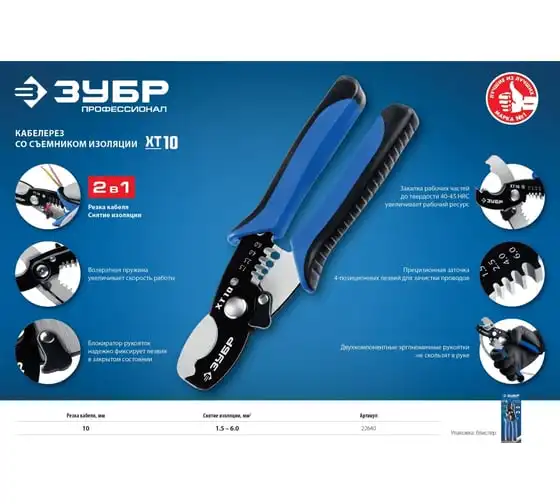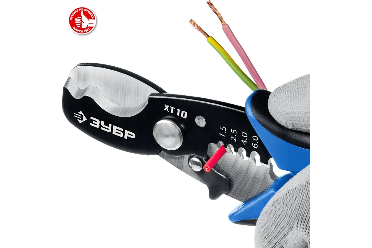 Кабельные ножницы 2в1 ЗУБР ХТ-10, 22640 предназначены для резки небронированного одножильного и многожильного кабеля из цветных металлов без деформации и замятия краев. Изготовлены из высококачественной стали, предназначены для профессионального применения. Обладают повышенным ресурсом, обеспечивают высокое качество электромонтажных работ. Применяются для снятия изоляции 1.5-6.0 мм2, а так же для резки кабеля толщиной до 10 мм. Данная модель оснащена возвратной пружиной, что значительно упрощает работу и увеличивает ее скорость. Рукоятки имеют специальный замок для блокировки лезвий в закрытом состоянии. Это обеспечивает безопасное хранение и транспортировку инструмента.