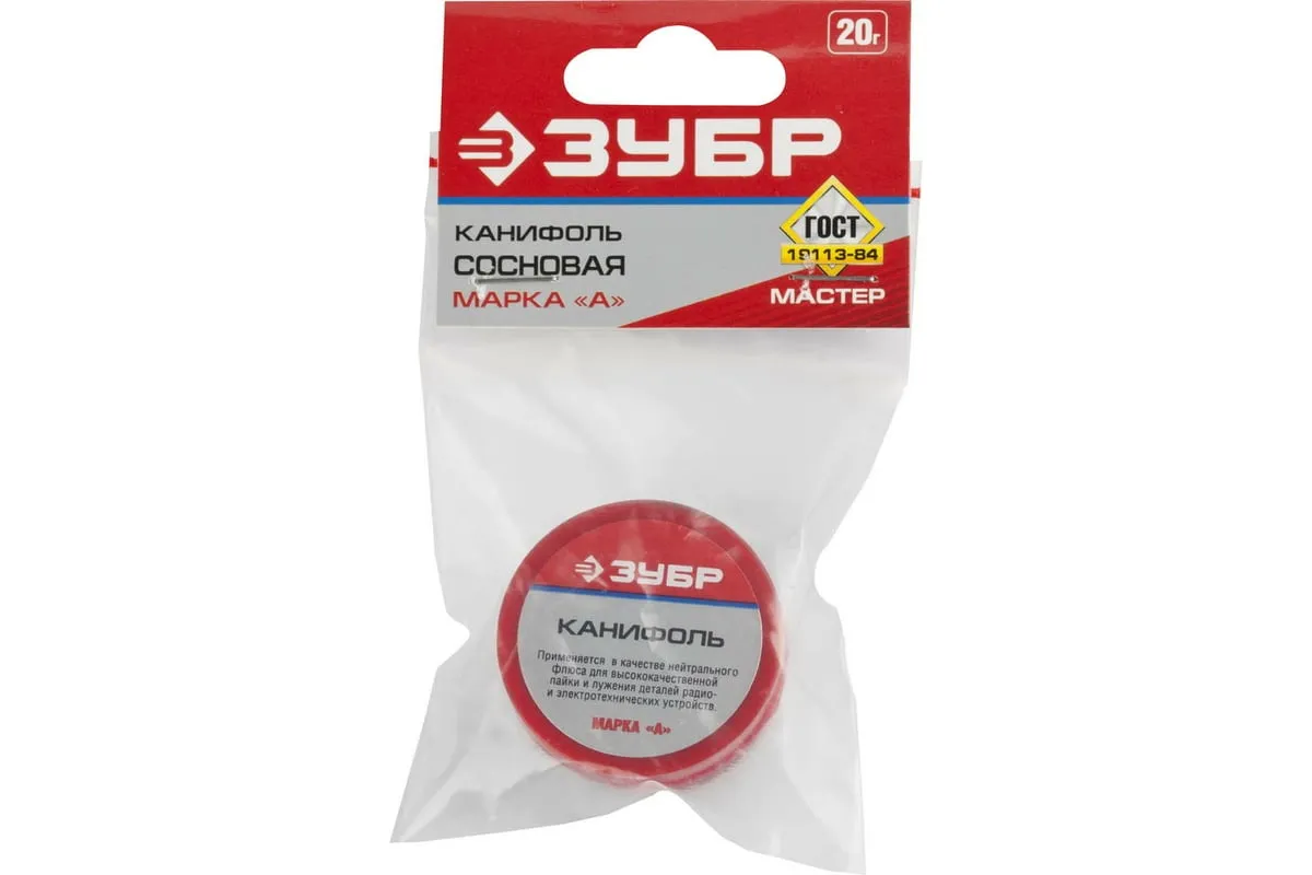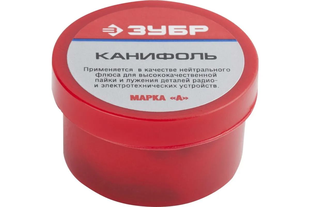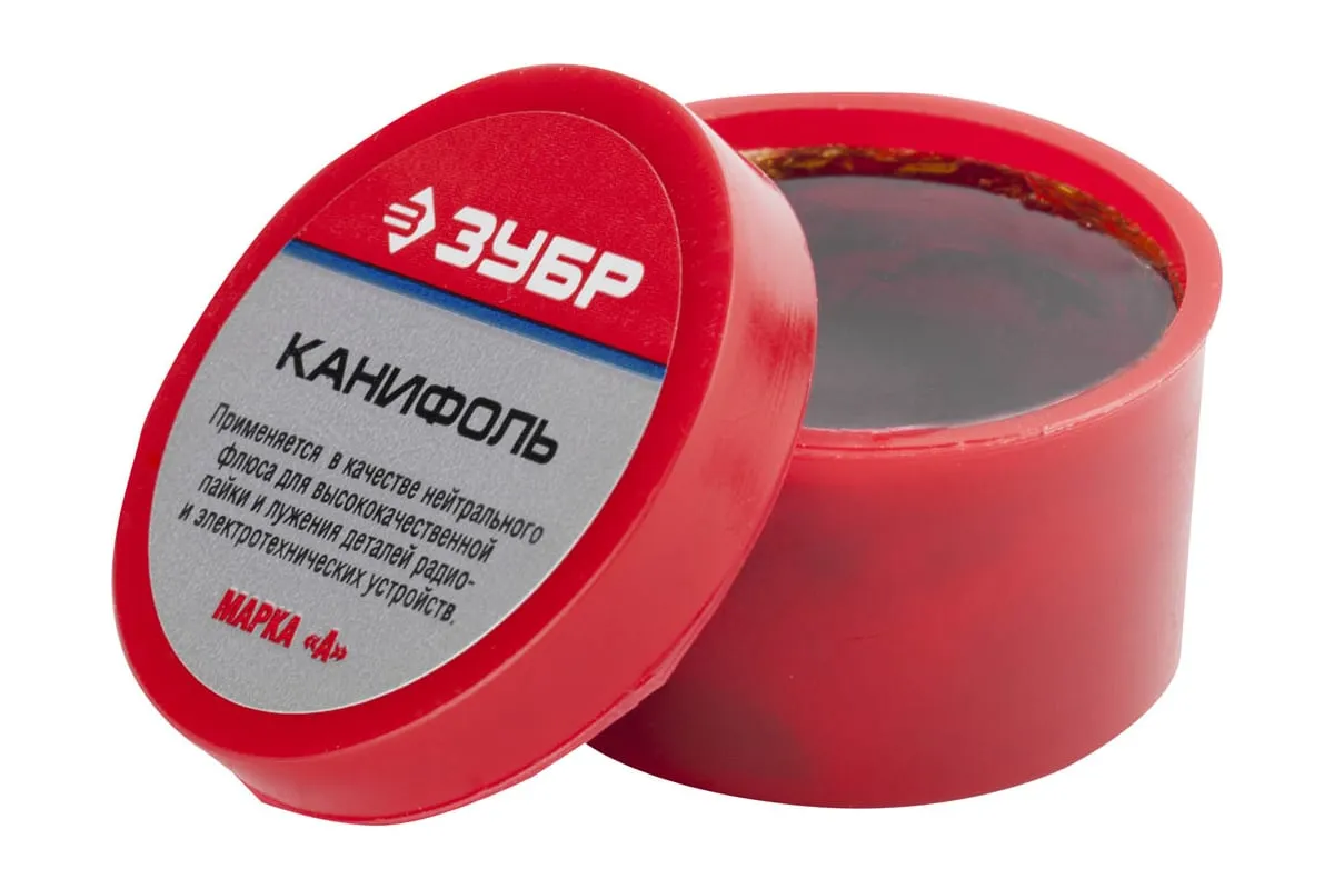 Канифоль (20 г) для паяльных работ Зубр 55470-020 применяется для высококачественной пайки и лужения радио- и электротехнических устройств. Флюсы (канифоль) предназначены для удаления окислов с поверхности под пайку, снижения поверхностного натяжения, улучшения растекания жидкого припоя и защиты от действия окружающей среды. Во время пайки они защищают от окисления поверхность нагреваемого металла и расплавленный припой. Это способствует улучшению качества пайки.