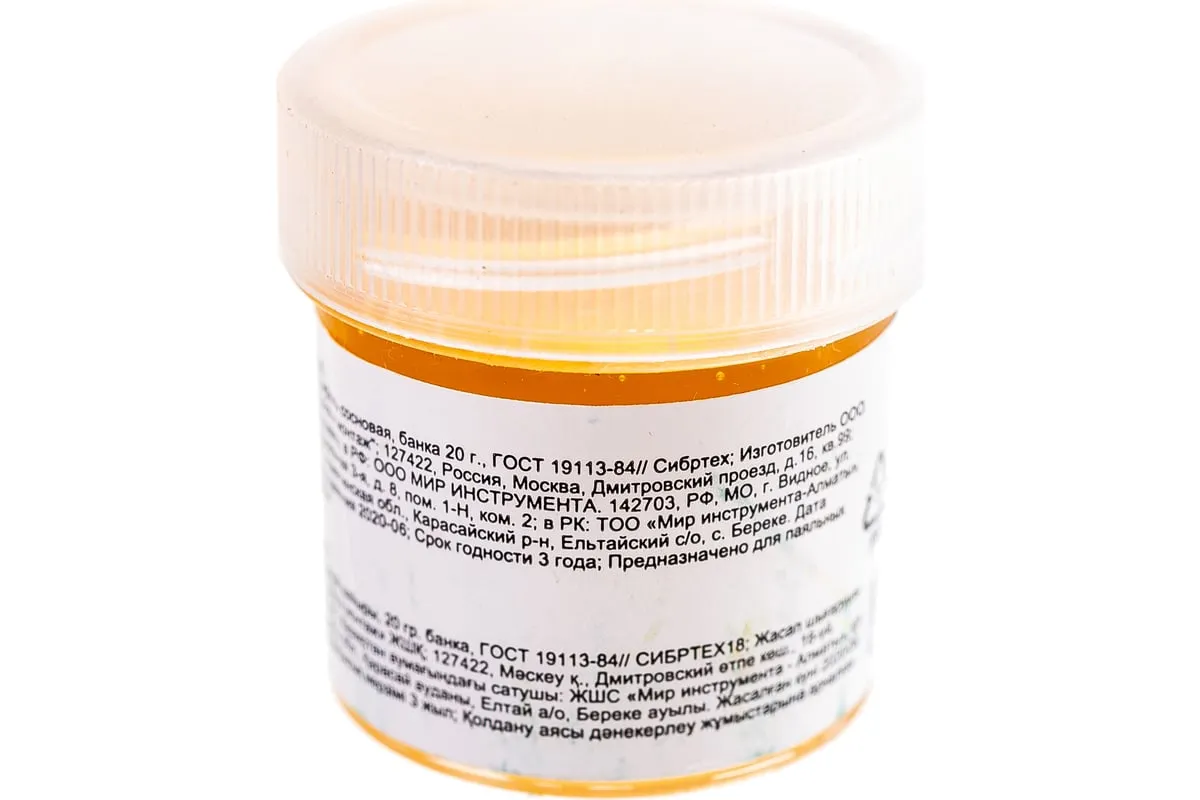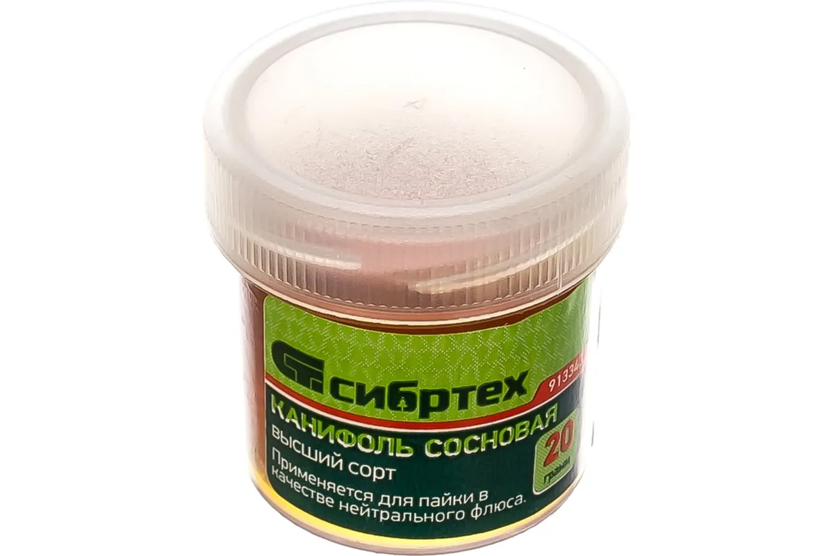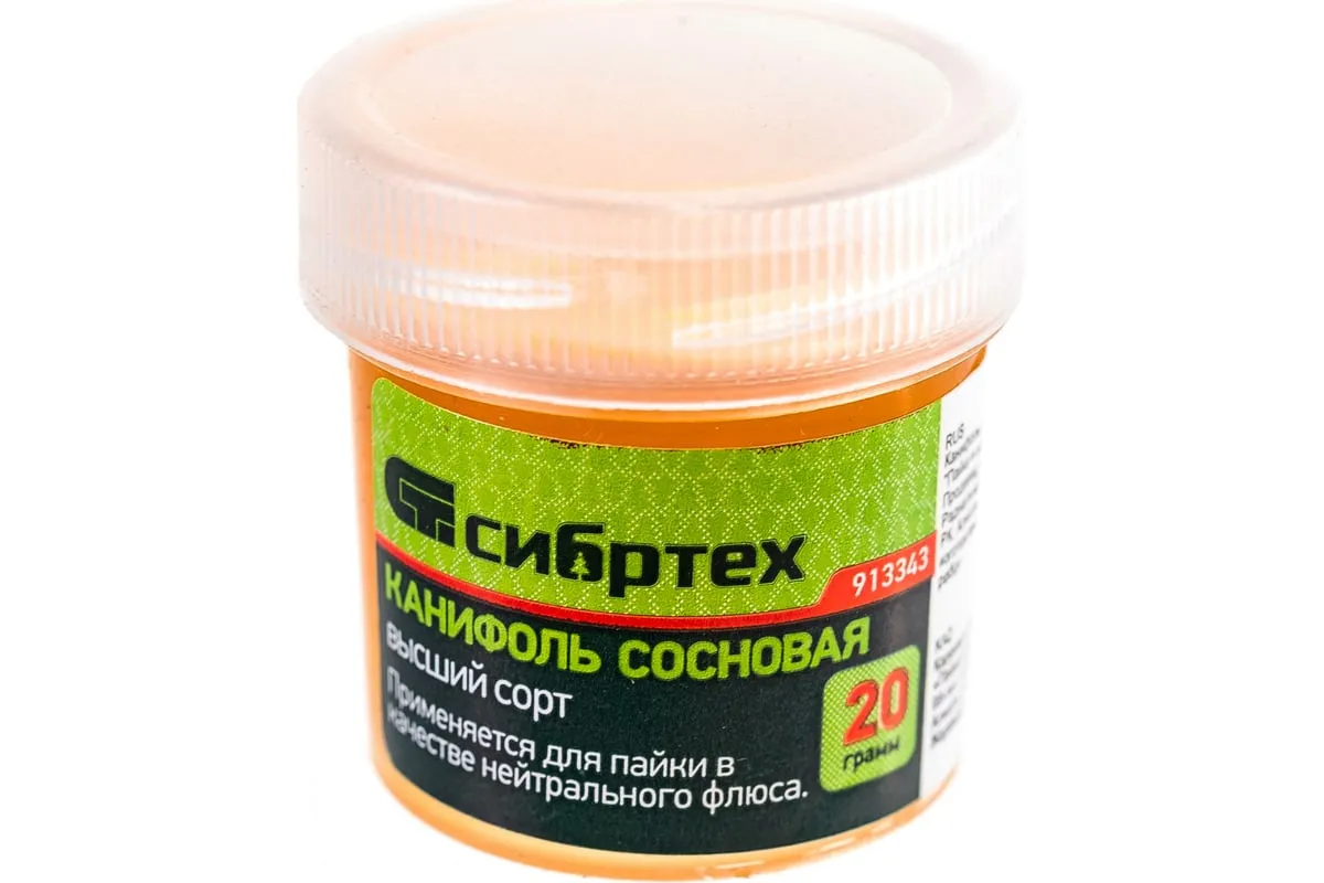 Применяется для пайки в качестве нейтрального флюса и для облуживания наконечника паяльника перед началом паяльных работ.Прозрачная пластиковая банка.Вес 20 гр.Высший сорт.Нейтральный флюс.Составсосновая смола.
