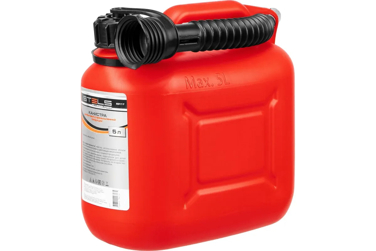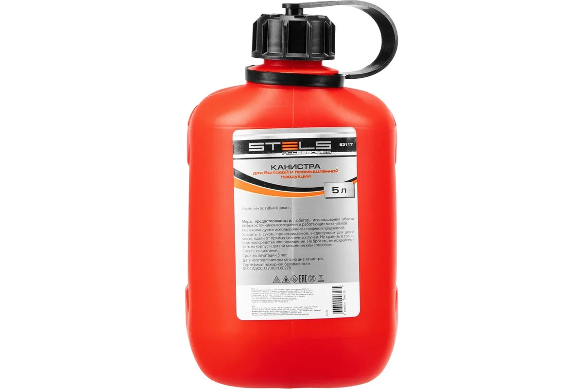 Пластиковая канистра Stels 53117 объемом 5 литров, вертикальная, предназначена для хранения и транспортировки жидкостей, что делает ее незаменимой в различных отраслях промышленности и быта.