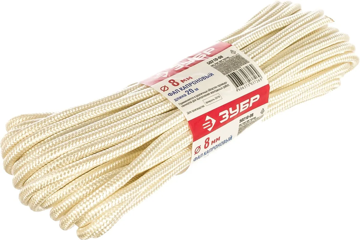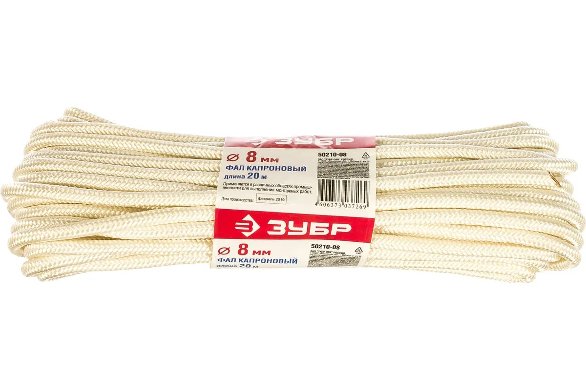 Капроновый фал Зубр 50210-08 используется в производственном процессе, в домашнем быту, сельском хозяйстве и т.д. Материал - капроновые нити, переплетенные между собой для наибольшей прочности при использовании. Характеристики: