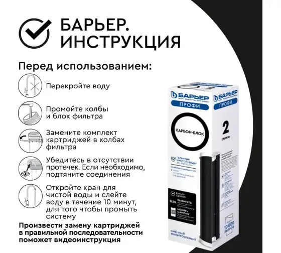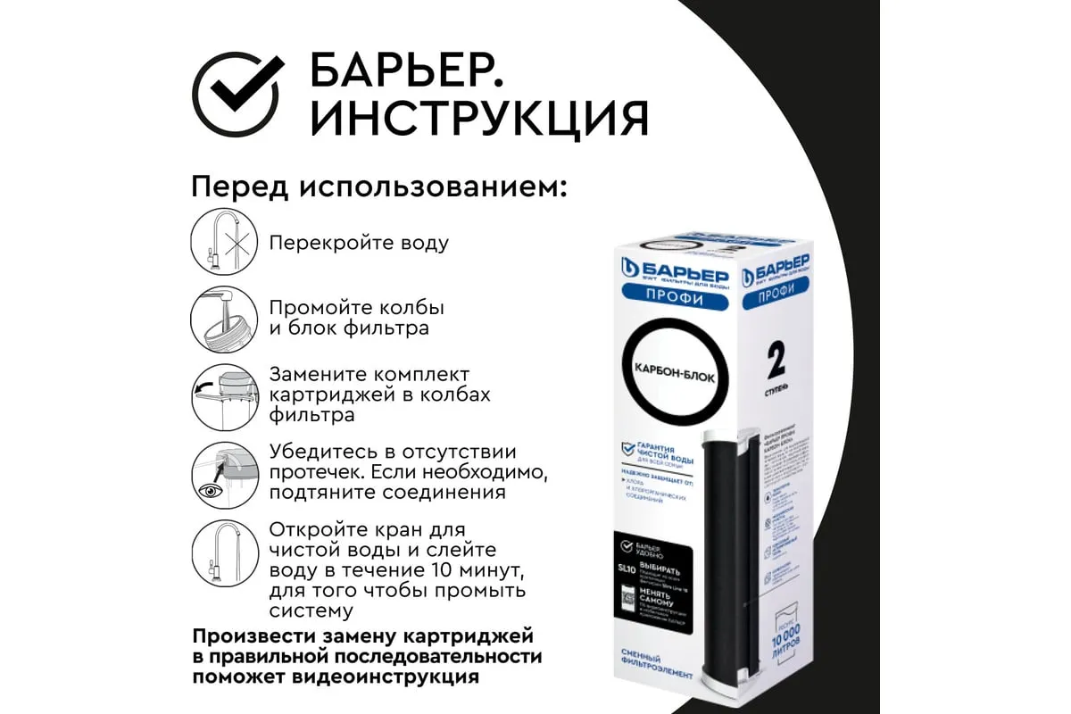 БАРЬЕР ПРОФИ Карбон-блок - картридж для доочистки воды от хлора и хлорорганики, фенольных соединений и механических примесей. Улучшает вкусовые качества и запах воды.
