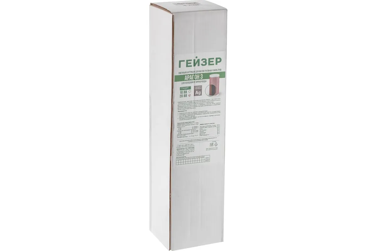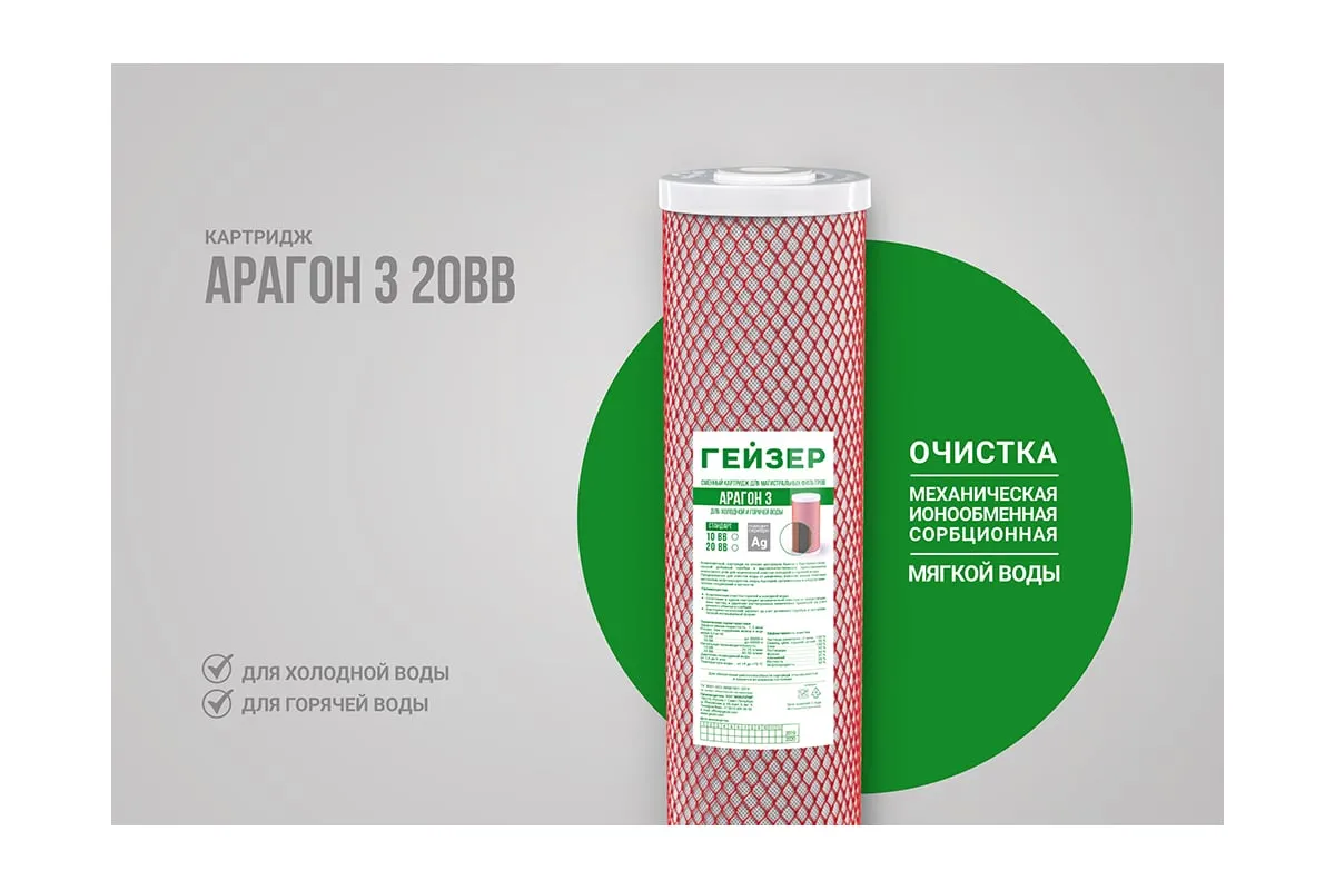 Картридж Арагон-3 20ВВ Гейзер 30056 используется для комплексной очистки горячей и холодной воды в магистральных фильтрах Гейзер Тайфун, а также в любых других корпусах стандарта 20ВВ. Картридж полностью удаляет из воды примеси хлора, органические соединения, соли жесткости, железо, марганец, тяжелые металлы, бактерии. Функция антисброса позволяет не пропускать загрязненную воду, что наглядно проявляется уменьшением напора воды. Картридж состоит из материала Арагон-Ж, применяемого для жесткой воды, и высококачественного активированного прессованного угля.