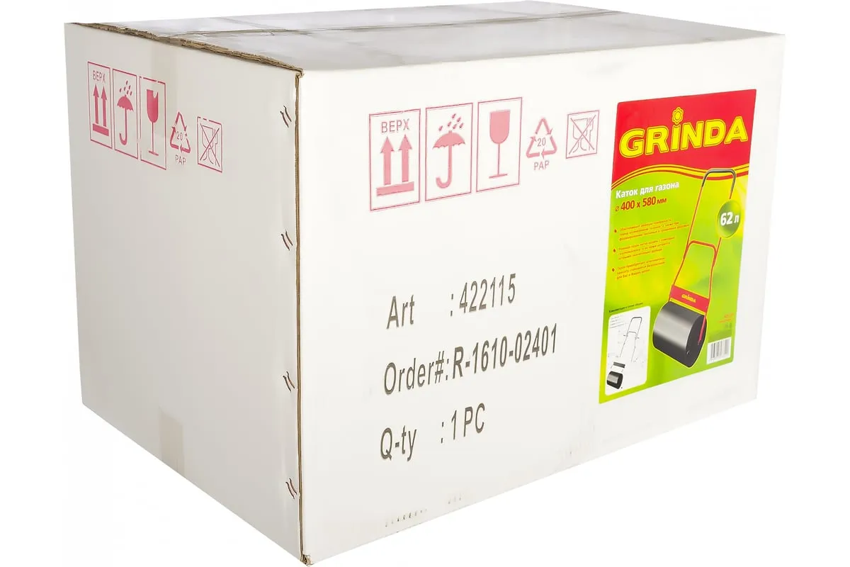 Каток для газона 62л Grinda 422115 при помощи ручки приводится в движение. Имеет цилиндрическую емкость объемом 62 литра, которая наполняется либо песком, либо водой.Закручивающаяся пробкавходит в комплект поставки. Приспособление предназначено для уплотнения почвы перед посевом семян, укатывания газона, применяется при формировании гравийных и песчаных дорожек.