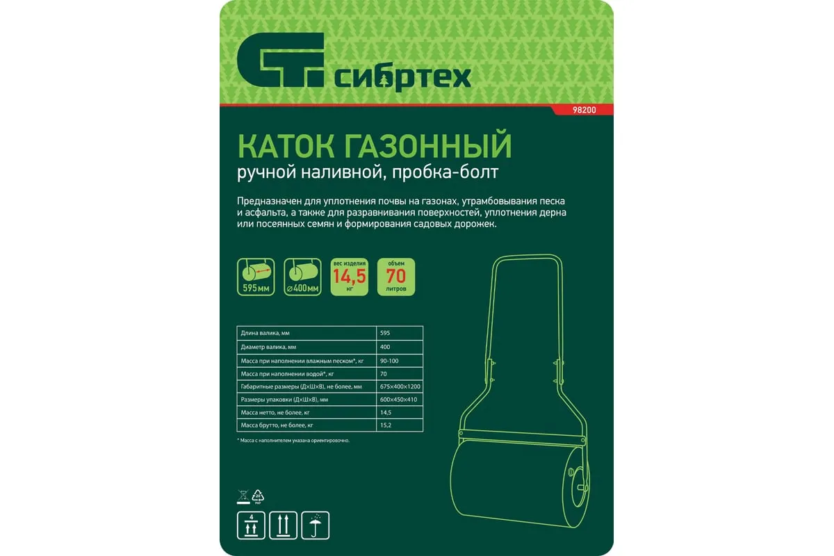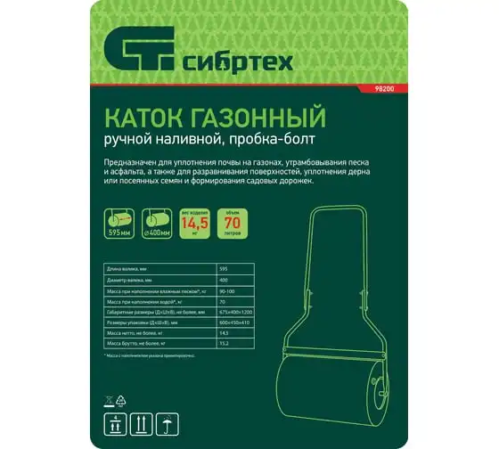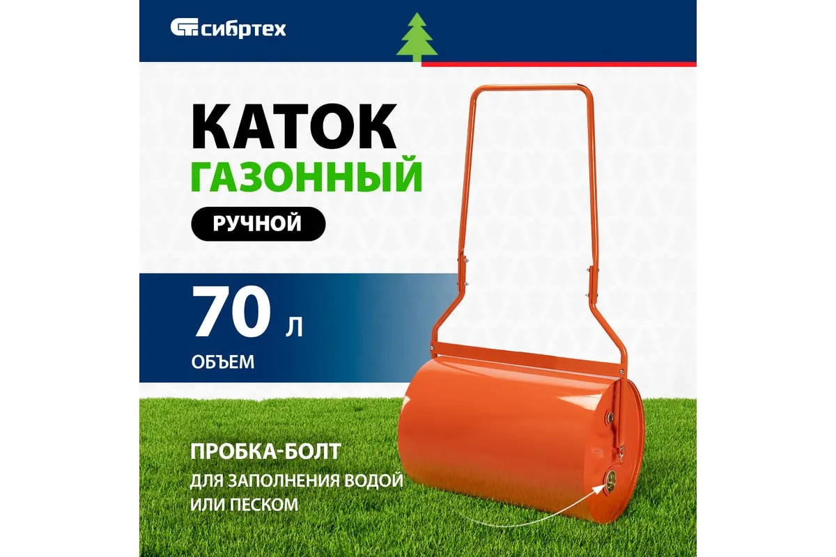 Наливной газонный каток Сибртех 98200 объемом 70 л, с пробкой-болтом, позволяет получить аккуратную лужайку на придомовой территории. Широкая рабочая часть уплотняет и выравнивает газон до и после настила и стрижки, обеспечивая необходимые для быстрого роста травы условия. Также каток можно применять для прессования асфальта, слоя песка перед укладкой плитки, формирования садовых дорожек и решения других задач. Преимущества