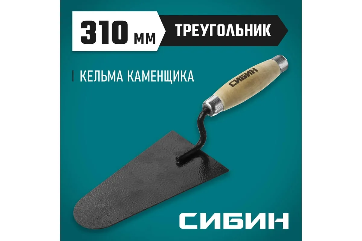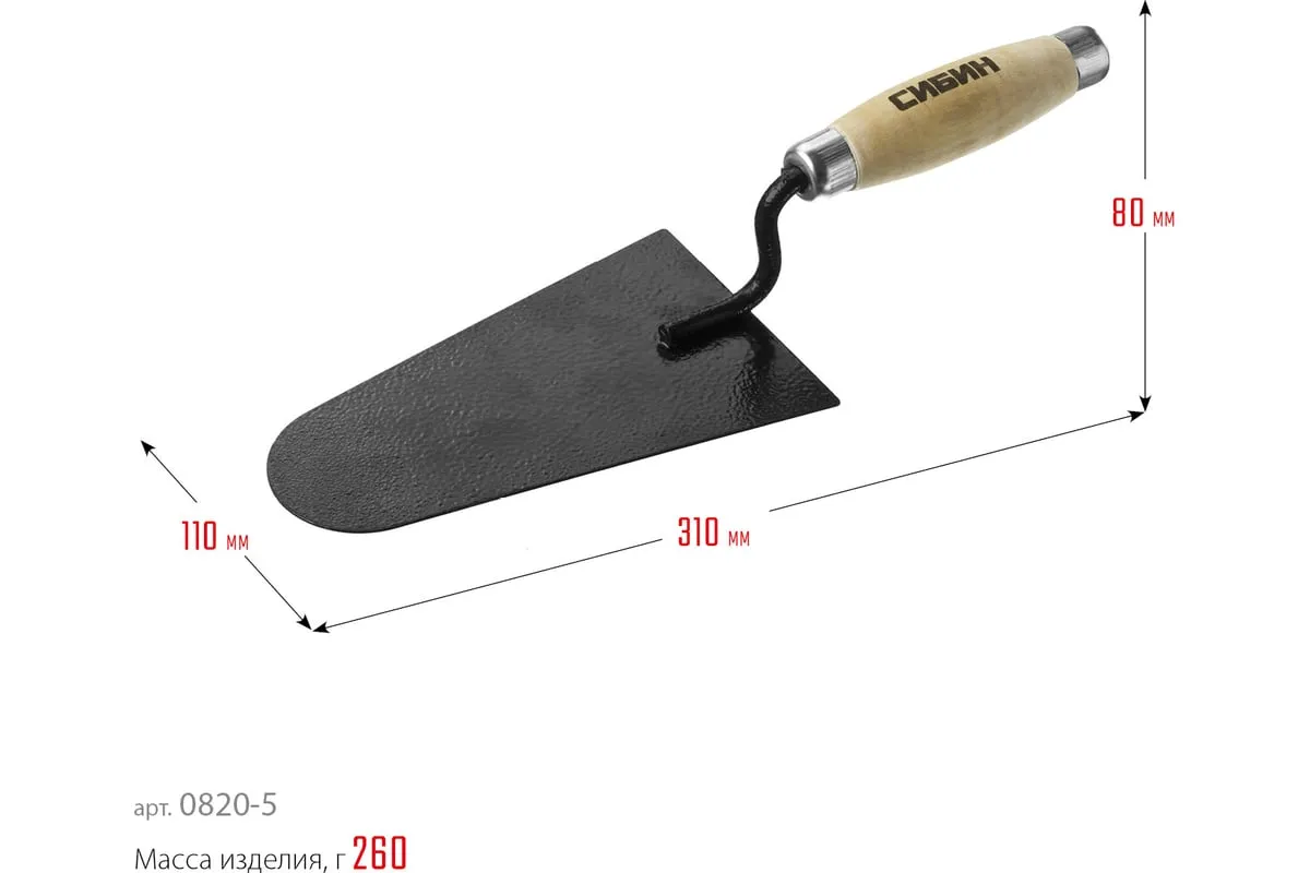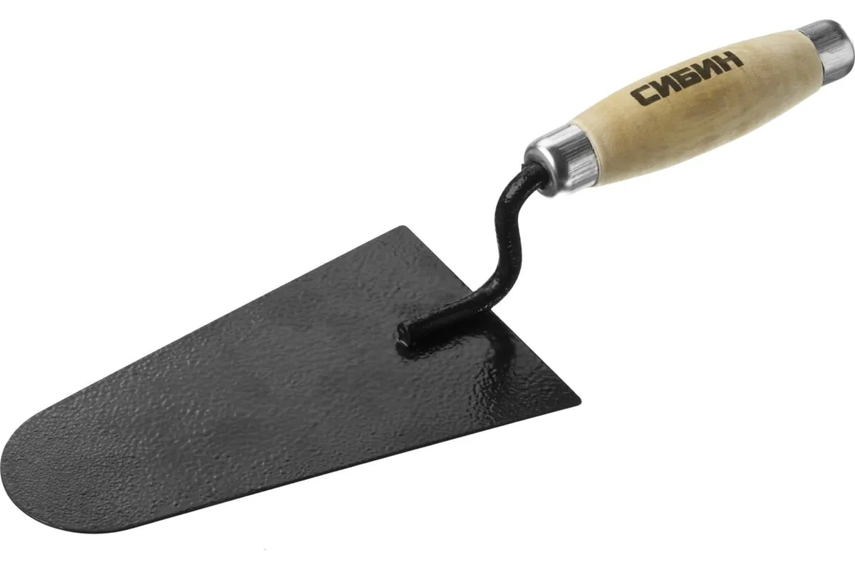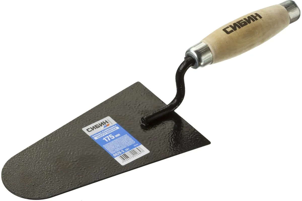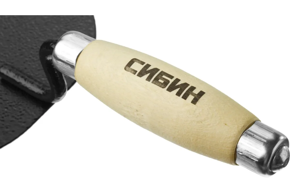 Кельма каменщика с деревянной усиленной ручкой СИБИН КК 0820-5_z01 - инструмент для нанесения раствора, подрезки в швах лишнего раствора в процессе кладки кирпичей. Полотно изготовлено из конструкционной стали и имеет форму закругленная трапеция. На торце деревянной рукоятки расположен оцинкованный боек.