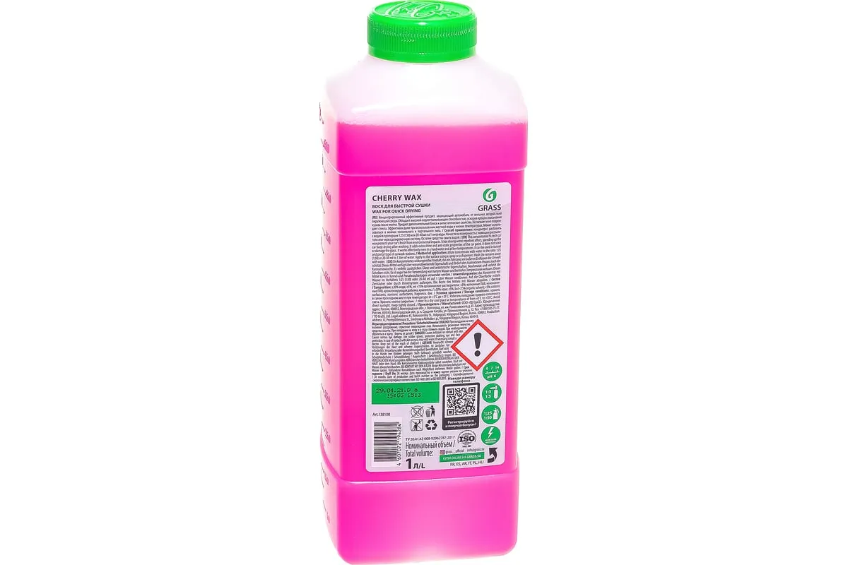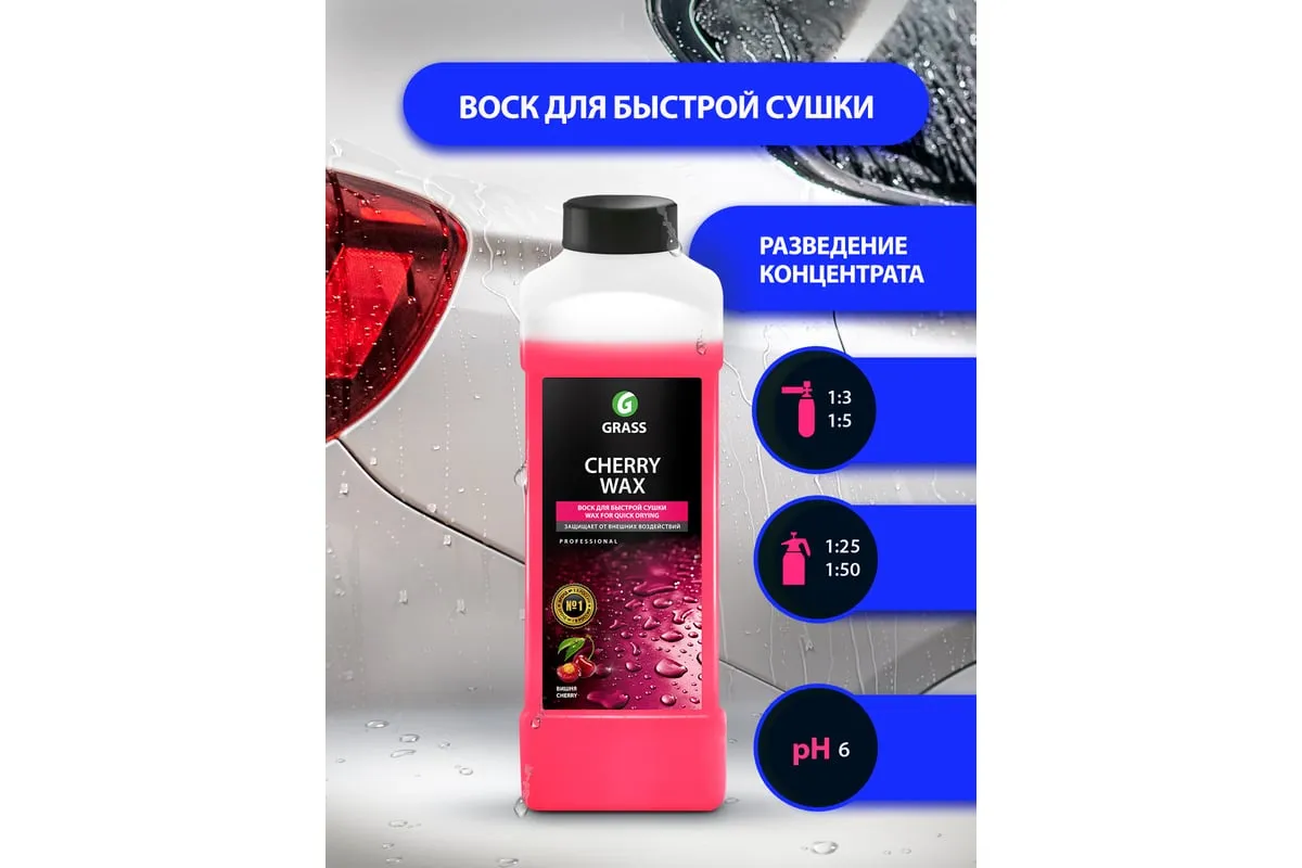 Холодный воск 1 л Grass Cherry Wax 138100 представляет собой концентрированное средство, применяемое для ухода за ЛКП автомобиля. Он защищает покрытие кузова от образования коррозии и влияния окружающей среды. Придает поверхности глянцевый блеск, а также обеспечивает длительные водоотталкивающие и антистатические свойства. Воск не теряет своих особенностей даже при использовании жесткой воды. Подходит для эксплуатации в любое время года. Концентрация - от 20 до 40 мл на литр воды.