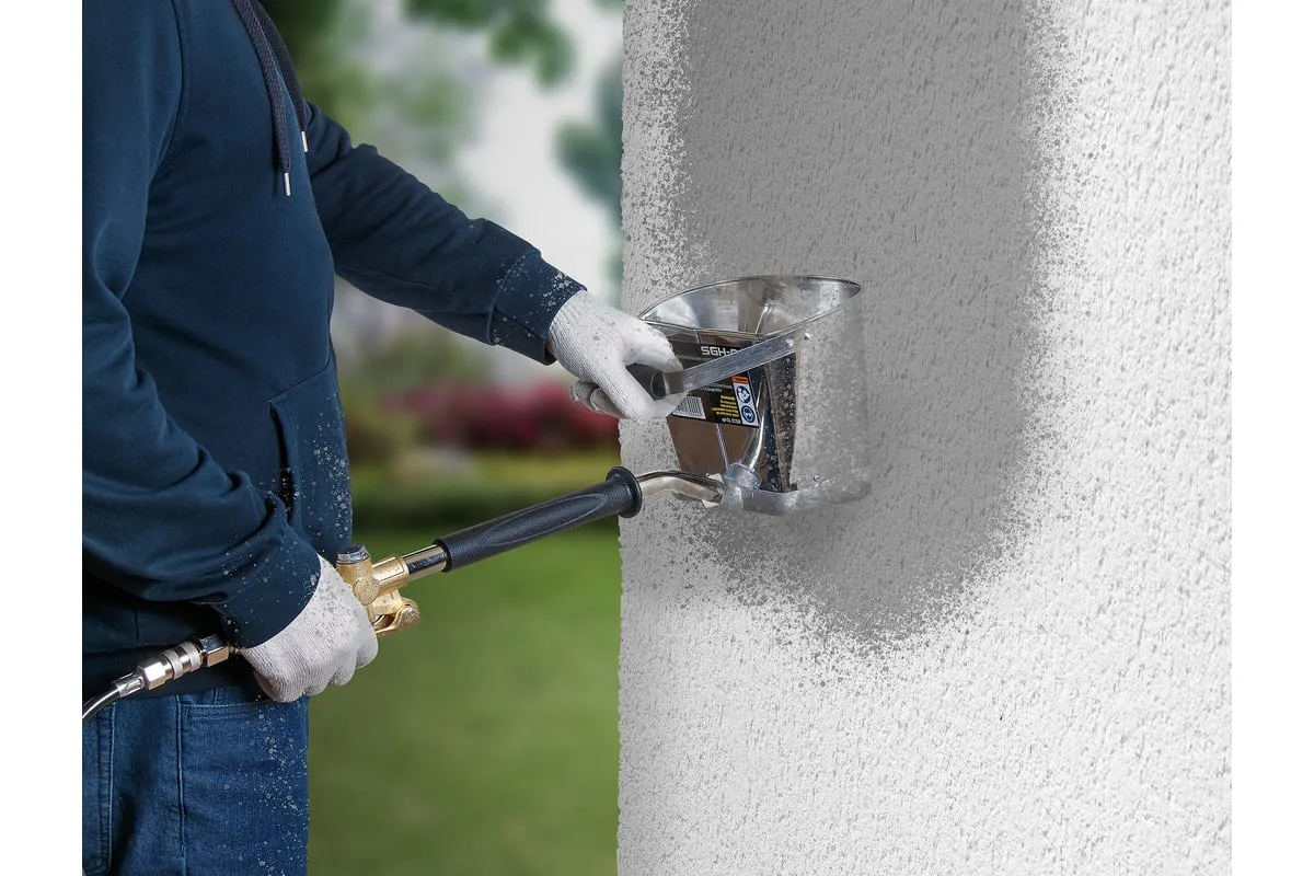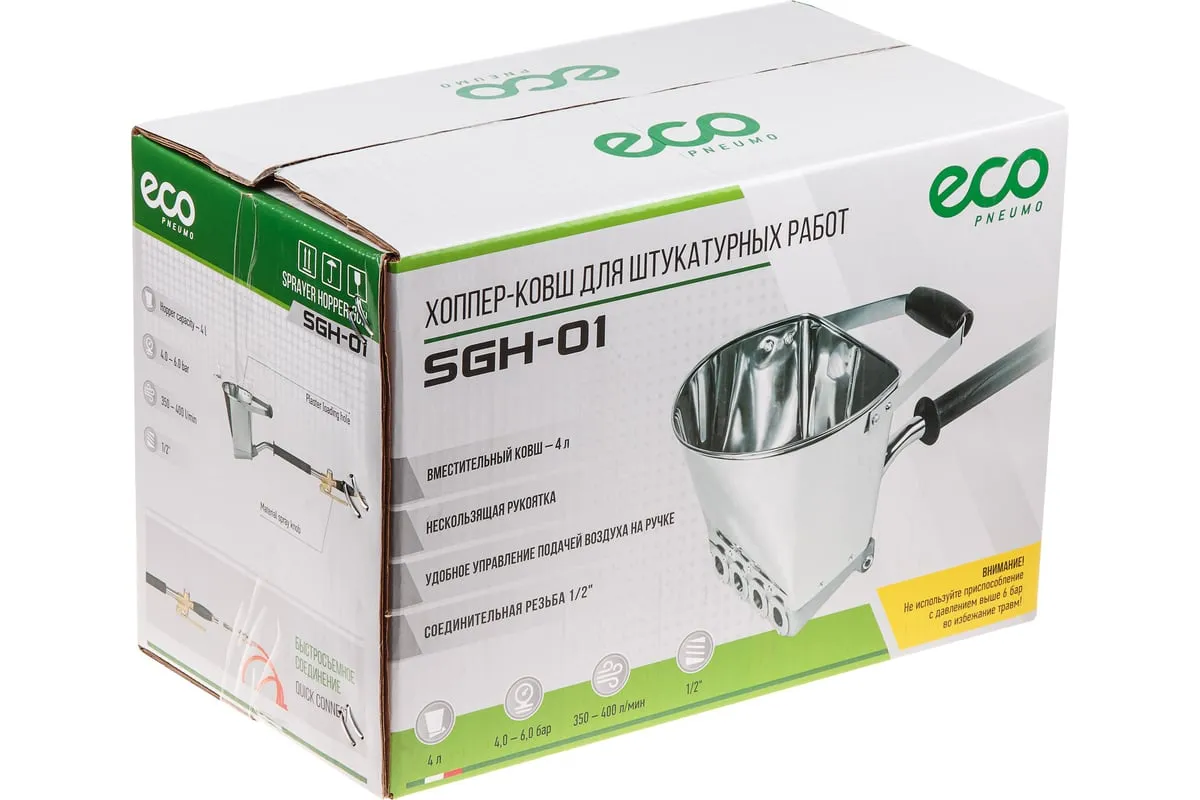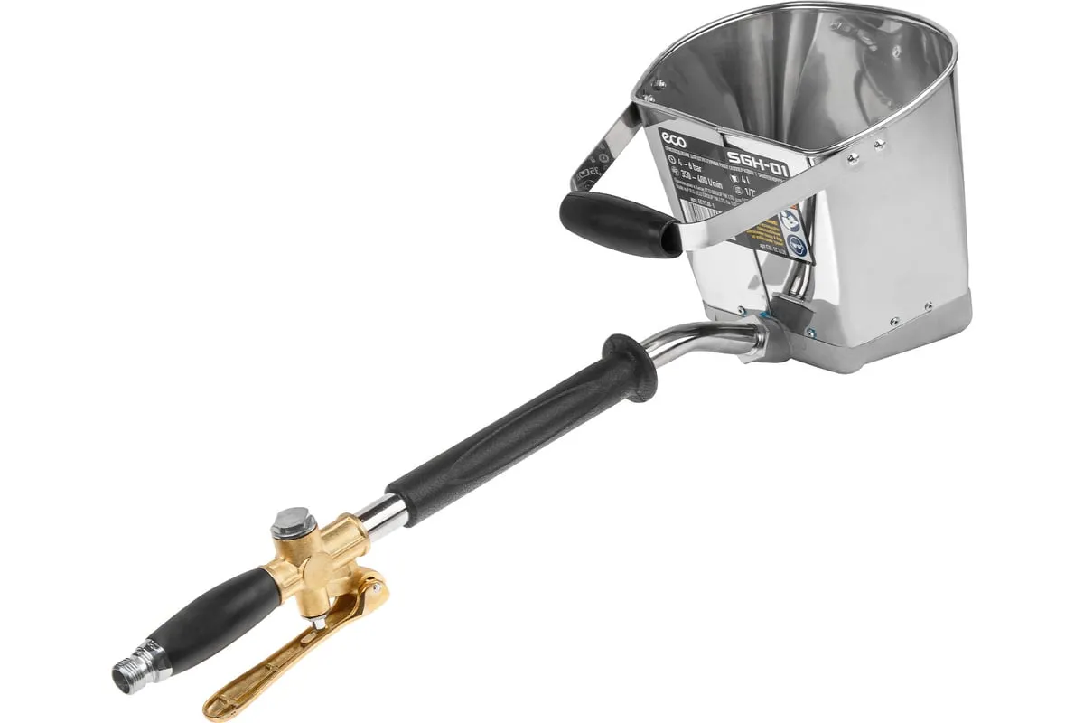 Хоппер-ковш ECO SGH-01 EC1538-1 предназначен для нанесения строительных смесей (штукатурки, бетона, глины) на поверхность бетонных или железобетонных конструкций под давлением сжатого воздуха, что дает плотное взаимодействие наносимого состава с поверхностью, заполнение трещин, раковин и пор, а также значительно ускоряет нанесение смесей по сравнению с ручным способом.