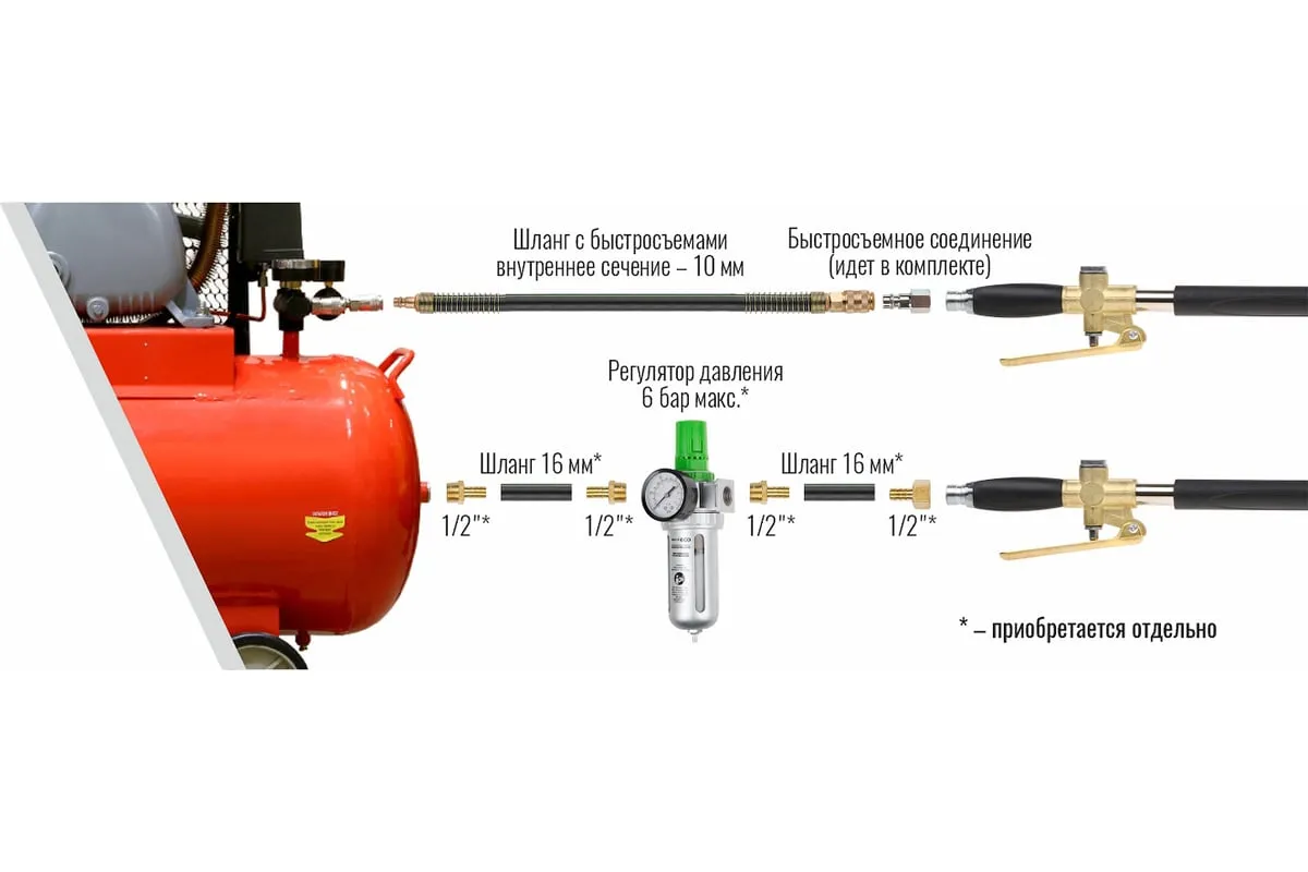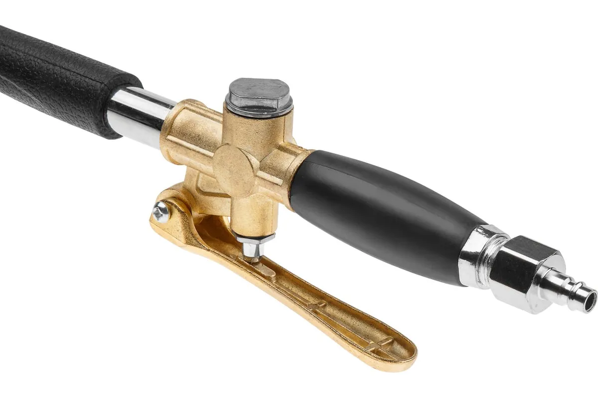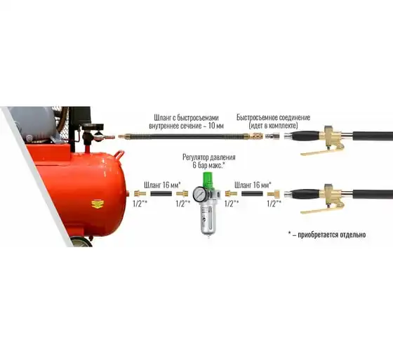 В комплекте имеется быстросъемный штуцер для удобства подключения к стандартным шлангам, но для достижения максимальной производительности рекомендуется использовать соединение "елочка" и шланг с внутренним сечением 16 мм. Рабочее давление: 4-6 бар.