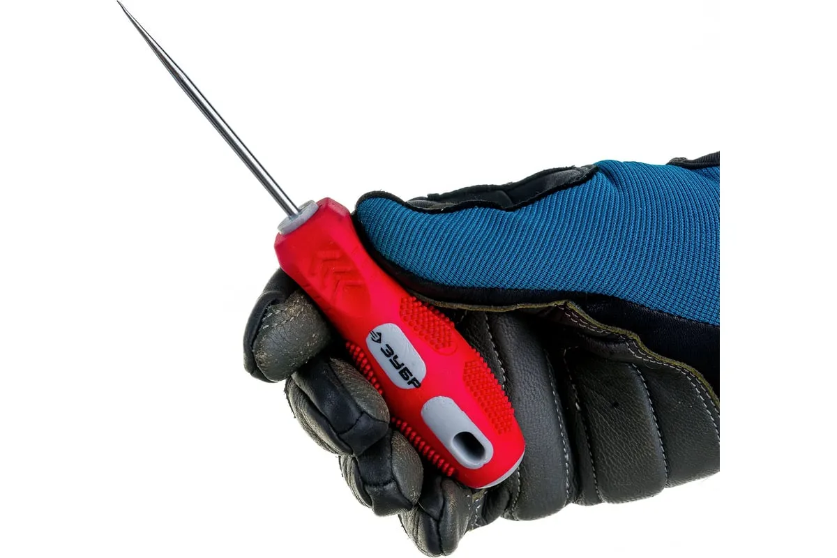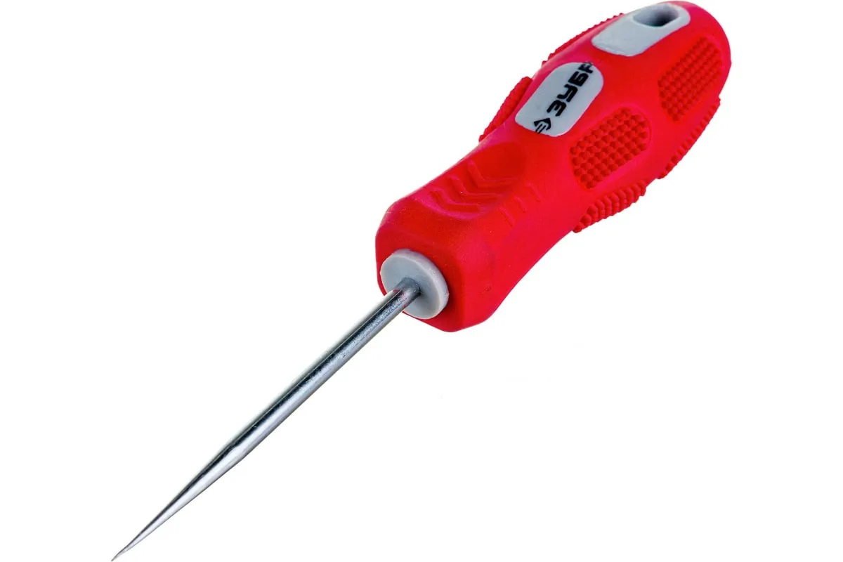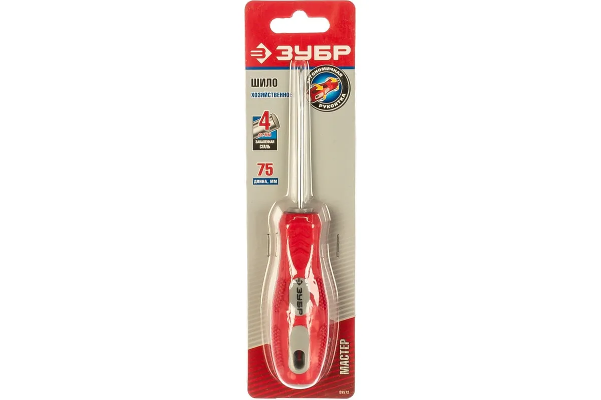 Хозяйственное шило двухкомпонентная рукоятка, 75 мм ЗУБР "МАСТЕР" 09572 подойдет для прокалывания плотных материалов, ремонта обуви. Жало выполнено из прочной углеродистой стали С45, устойчивой к деформациям.