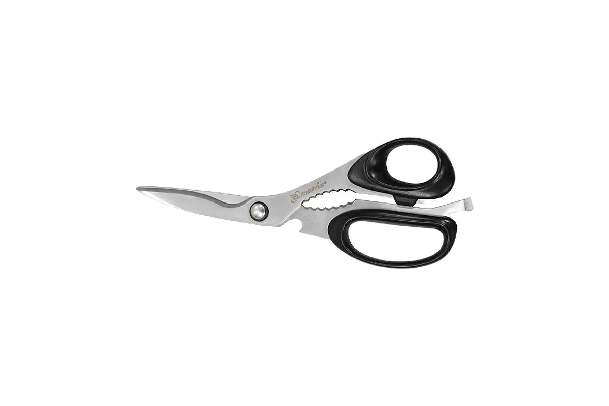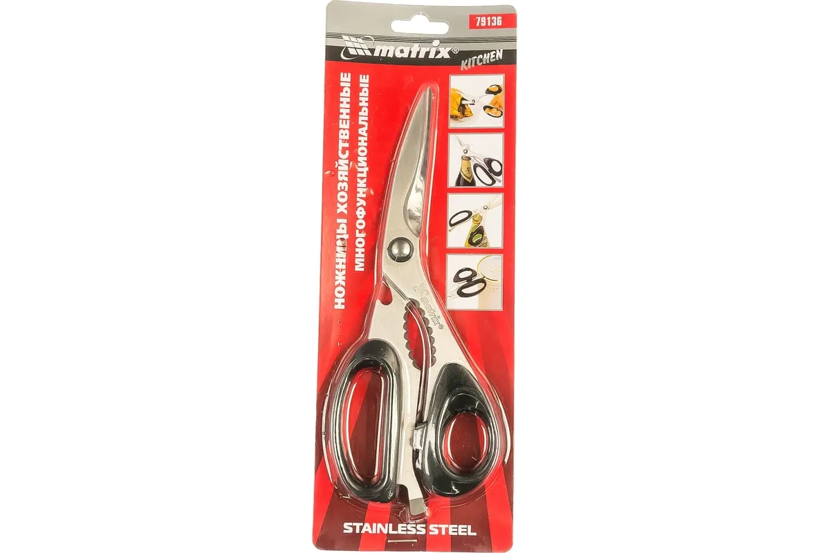 Хозяйственные ножницы MATRIX 79136 многофункциональное приспособление. С помощью таких ножниц можно разрезать птицу или рыбу, открывать закручивающиеся бутылки, имеют функцию отвертки и открывалки. Лезвия выполнены из прочной стали. Эргономичные рукоятки из пластика обеспечивают надежный захват.