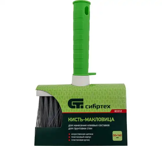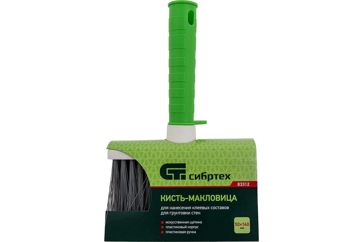 Кисть-макловица Сибртех 83312 толщиной 50 мм и шириной 140 мм, с искусственной щетиной, пластиковым корпусом и пластиковой ручкой, используется для нанесения на поверхности грунтовки, водно-дисперсионной краски, побелки, обойного клея, морилки. Подходит для обработки участков большой площади. Искусственная щетина с расщепленными на концах ворсинками хорошо набирает и удерживает лакокрасочные материалы, не деформируется в ходе работы.