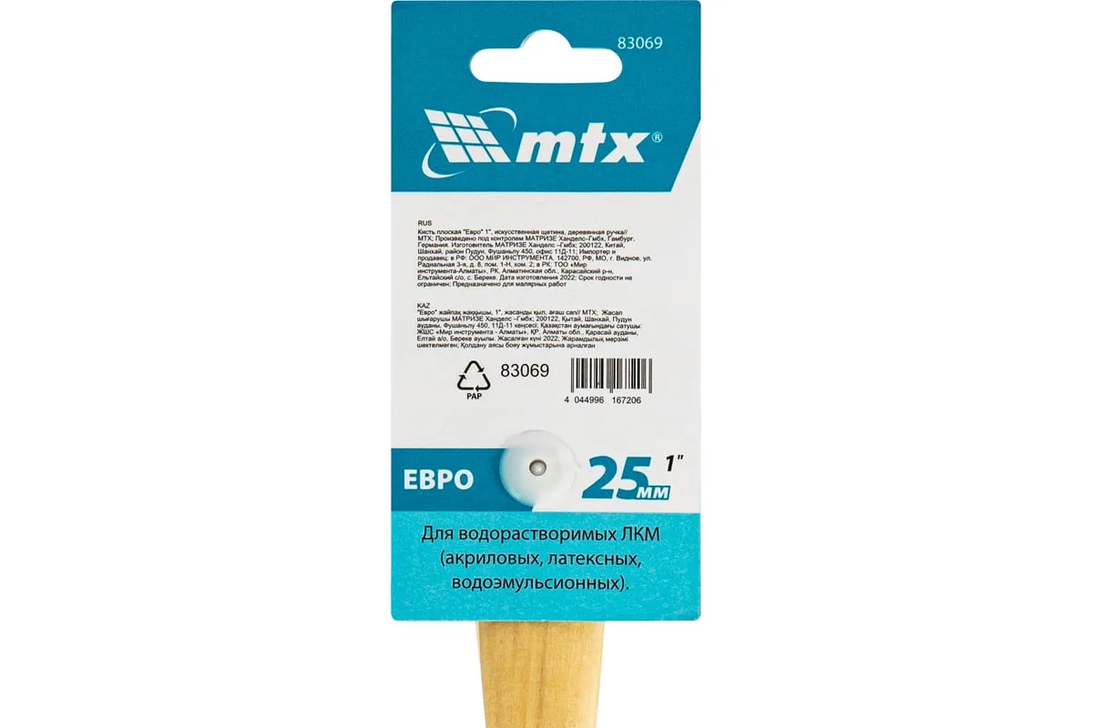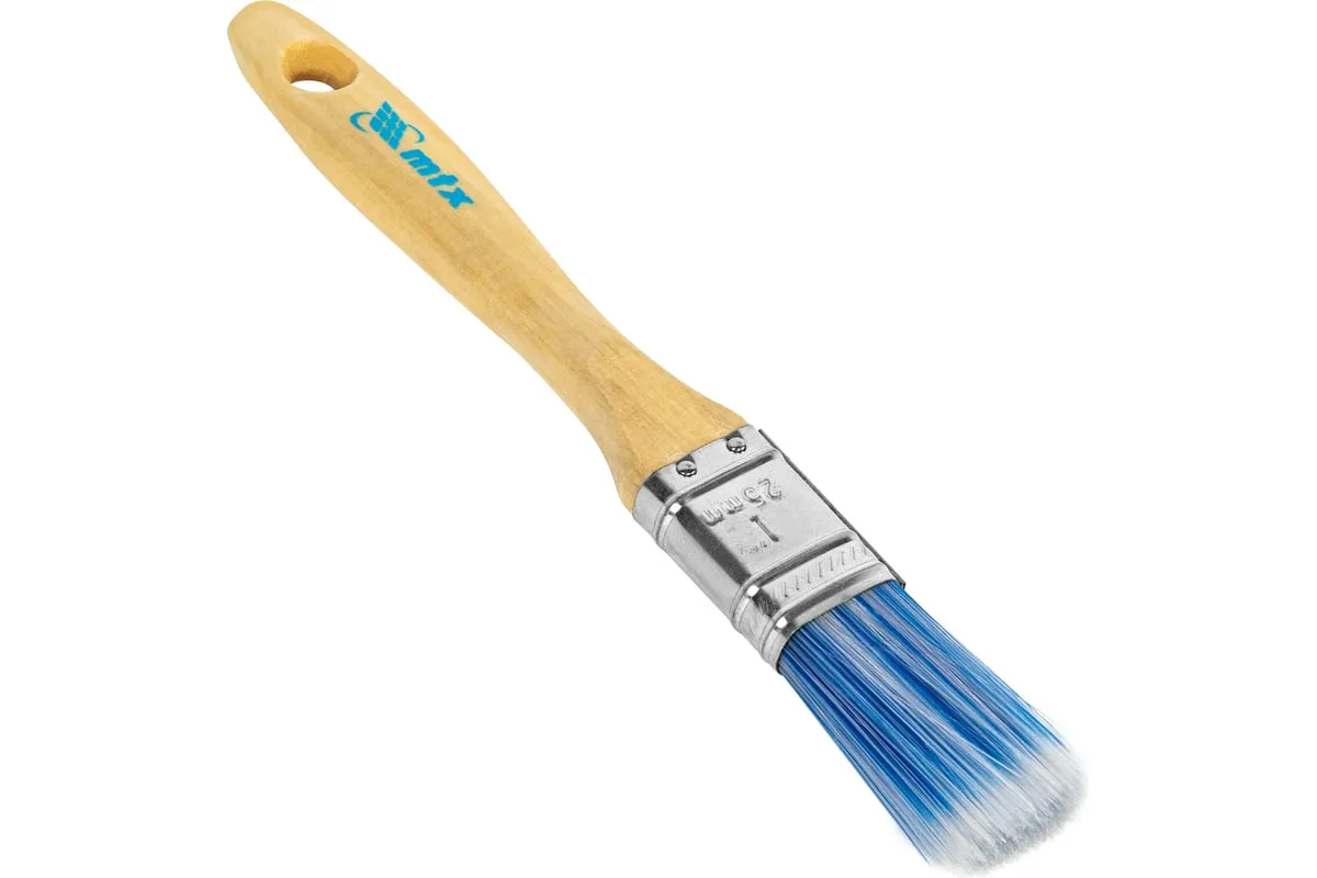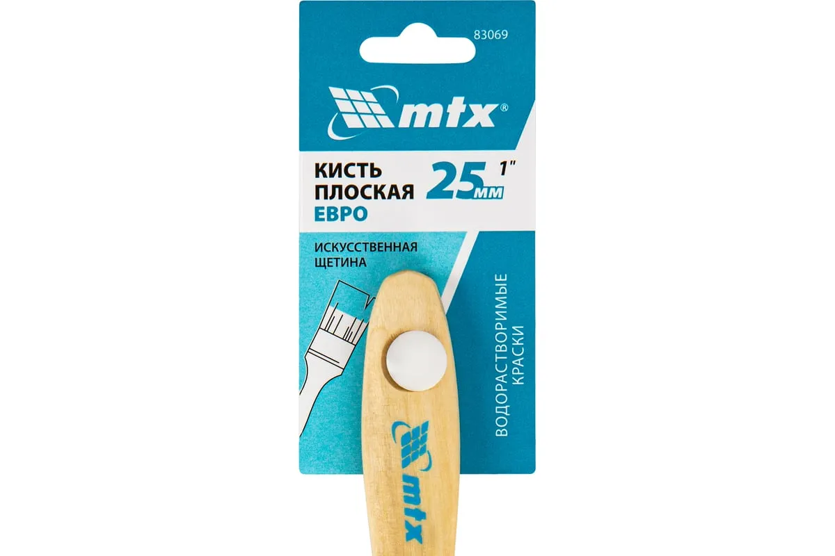 Плоская кисть MTX «Евро» 83069 шириной 1", с искусственной щетиной и деревянной ручкой, предназначена для малярных работ. Оптимальна для работы с водорастворимыми ЛКМ (акриловыми, латексными, водоэмульсионными), удобна для обработки узких и труднодоступных мест. Кисть подходит для профессионального использования.