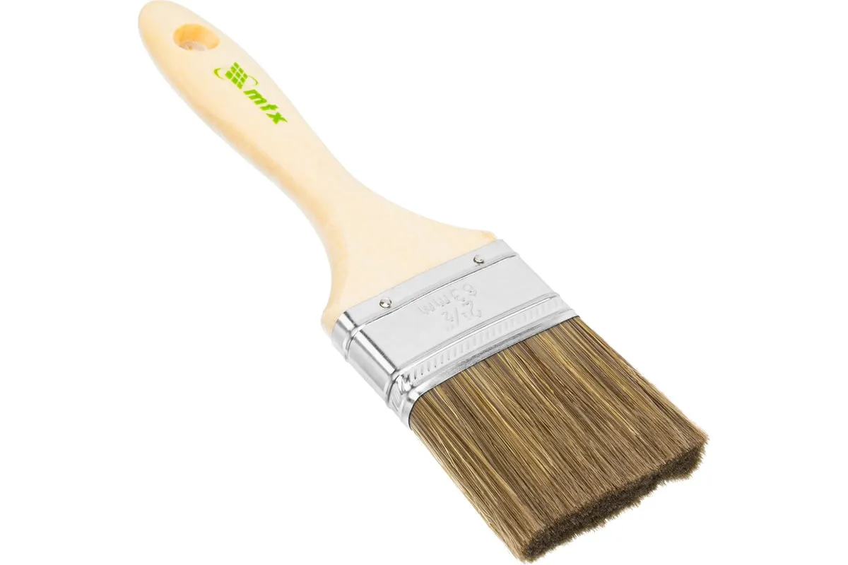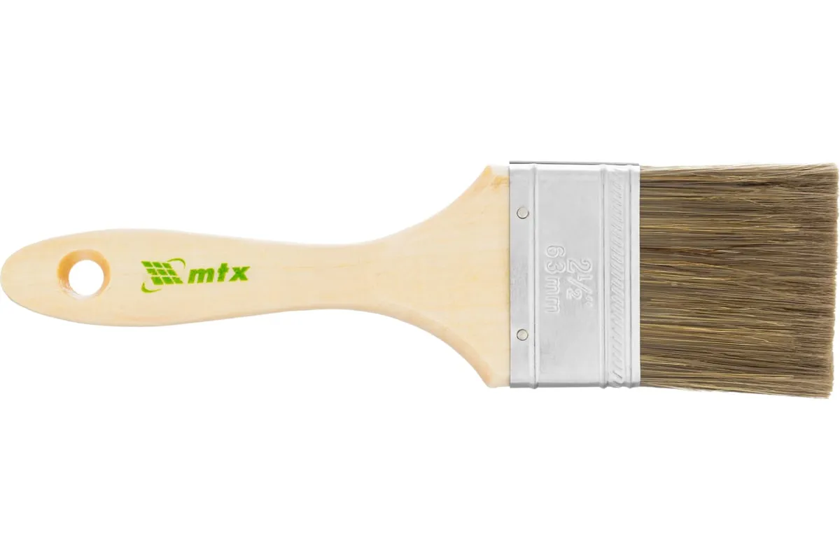 Плоская кисть MTX «Евро» 83080 шириной 2,5", с деревянной ручкой, имеет смешанную щетину и оптимальна для нанесения средств защиты древесины (пропитки, грунтовки, антисептиков, морилки). Сочетает все