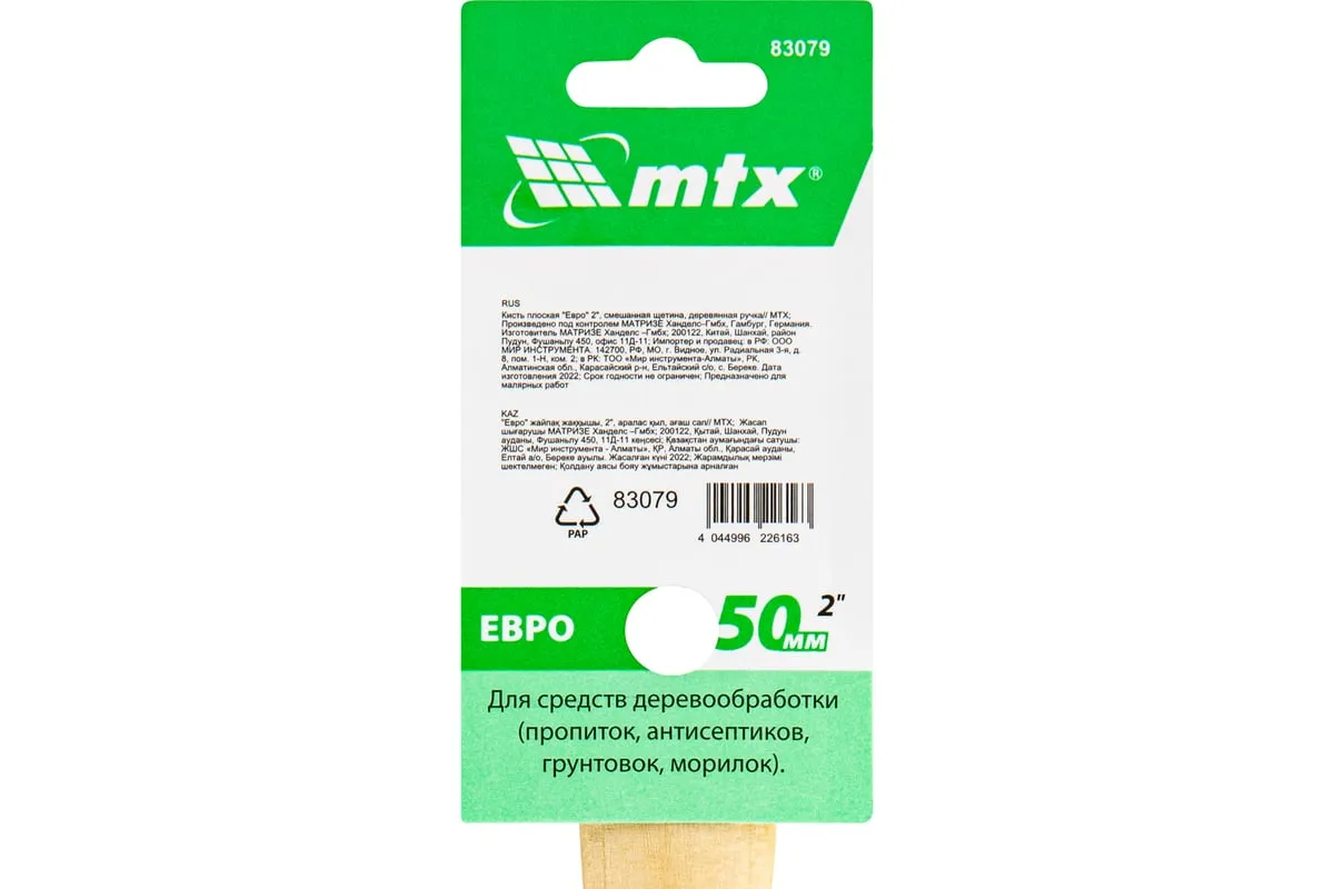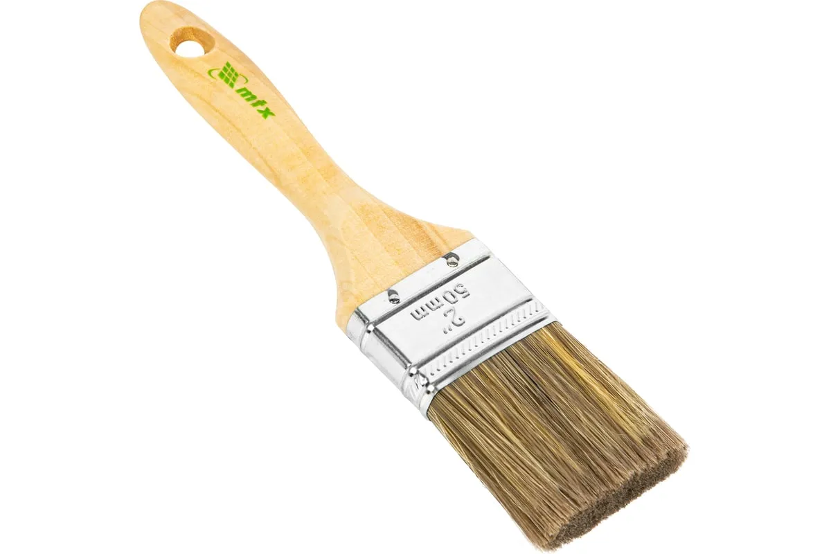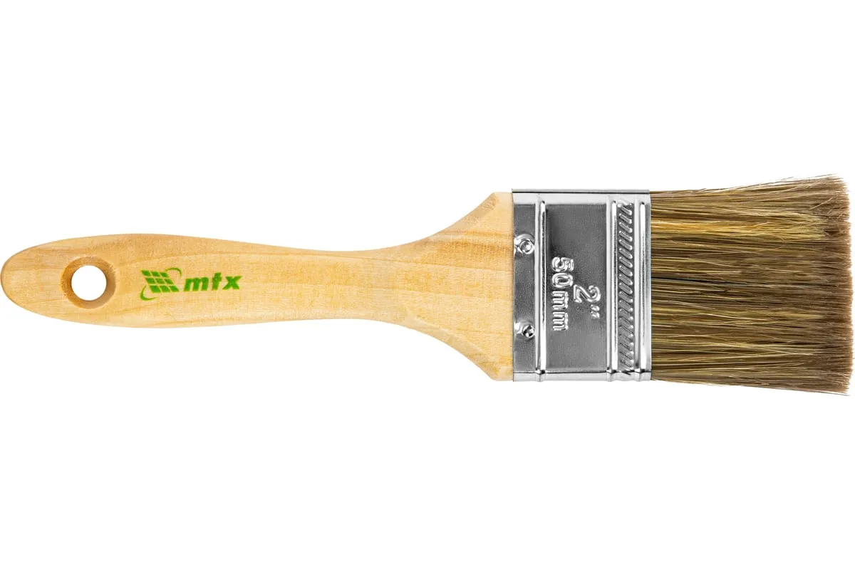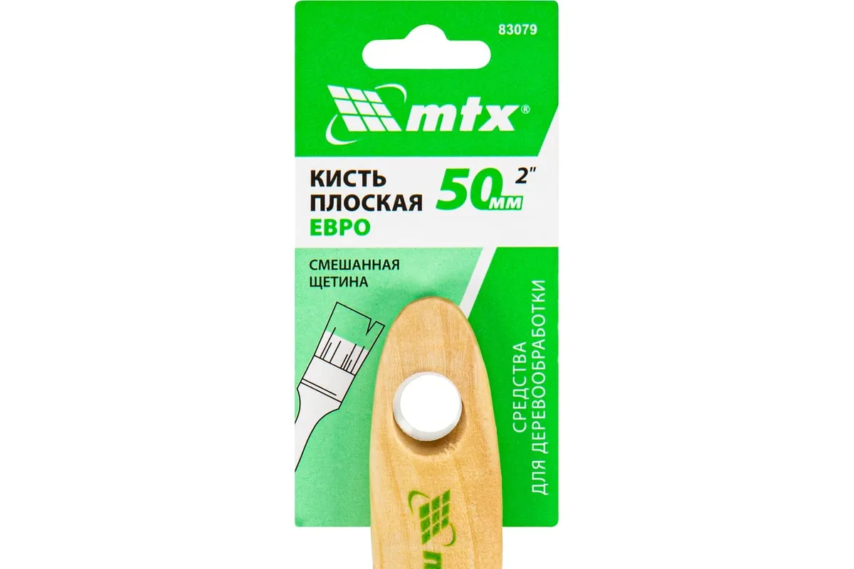 Плоская кисть MTX «Евро» 83079 шириной 2", с деревянной ручкой, имеет смешанную щетину и оптимальна для нанесения средств защиты древесины (пропитки, грунтовки, антисептиков, морилки). Сочетает все преимущества искусственной и натуральной щетины благодаря оптимальной комбинации натуральных и искусственных волокон. Обладает высокими краскообменными качествами: благодаря натуральной щетине в составе кисть хорошо впитывает и отдает краску. Инструмент подходит для профессионального использования.