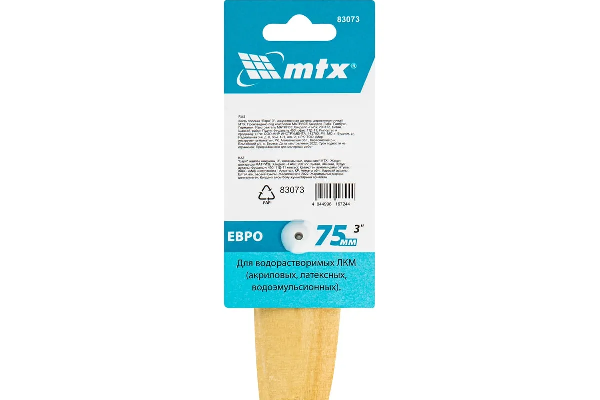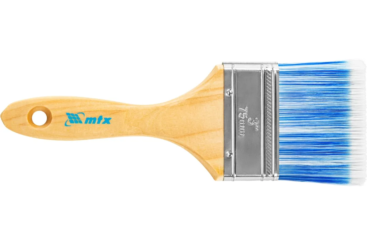 Плоская кисть MTX «Евро» 83073 шириной 3", с искусственной щетиной и деревянной ручкой, предназначена для малярных работ. Оптимальна для работы с водорастворимыми ЛКМ (акриловыми, латексными, водоэмульсионными), удобна для обработки участков небольшой площади. Кисть подходит для профессионального использования.