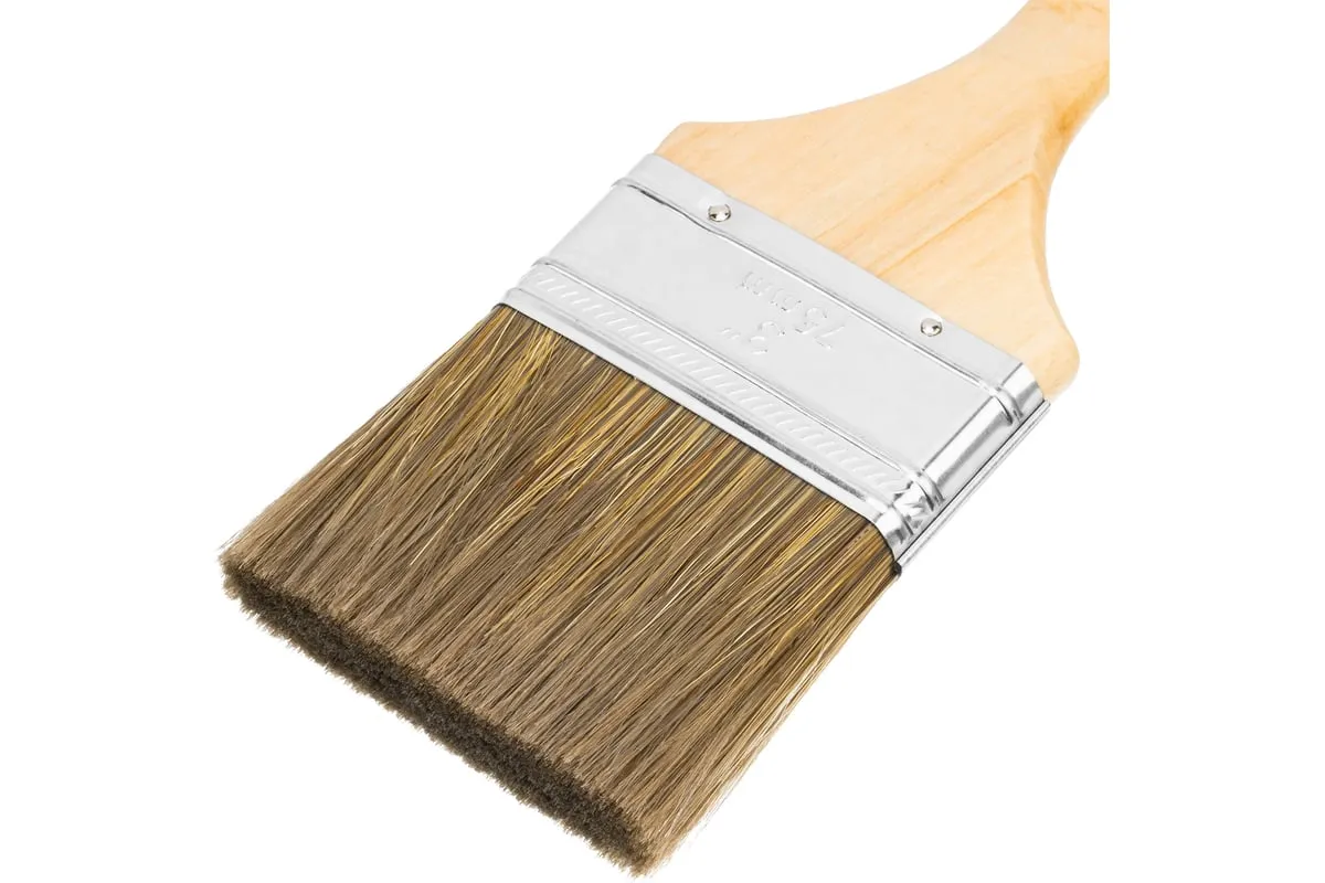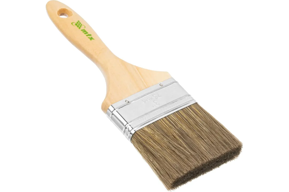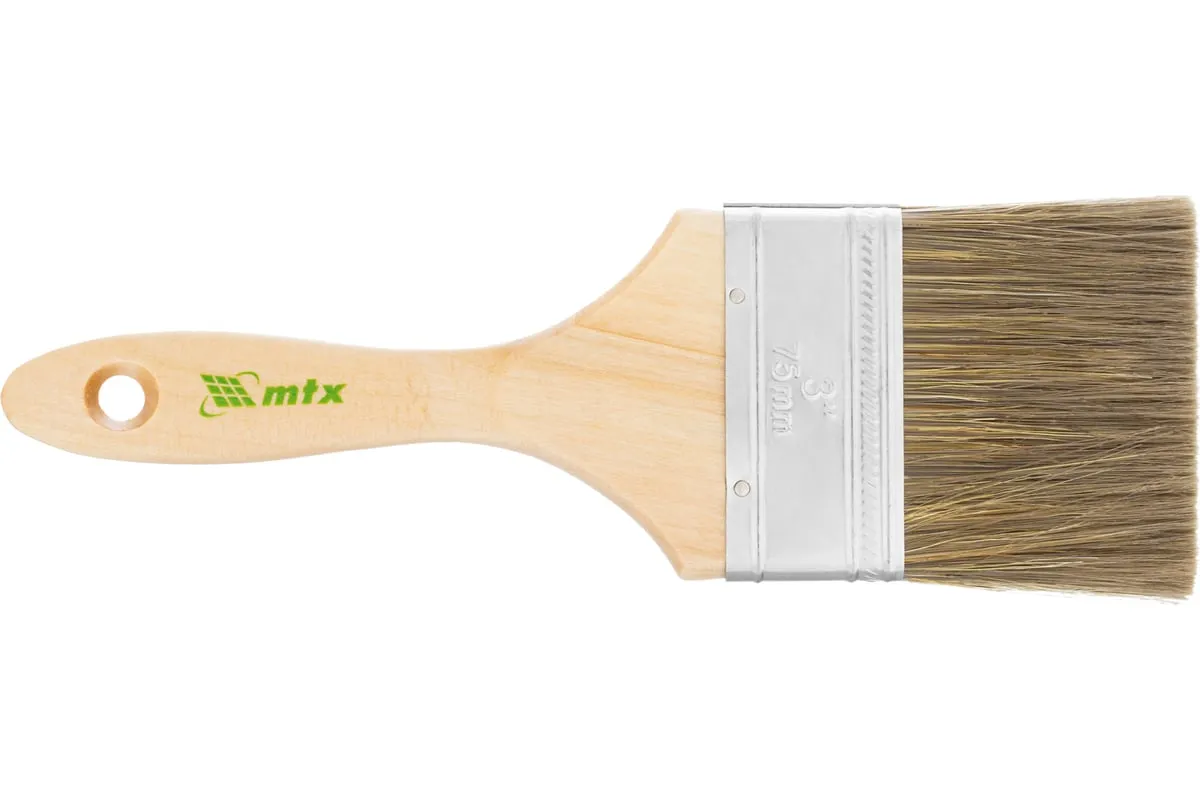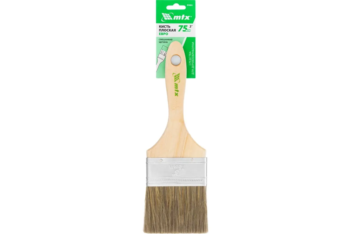 Плоская кисть MTX «Евро» 83081 шириной 3", с деревянной ручкой, имеет смешанную щетину и оптимальна для нанесения средств защиты древесины (пропитки, грунтовки, антисептиков, морилки). Сочетает все преимущества искусственной и натуральной щетины благодаря оптимальной комбинации натуральных и искусственных волокон. Обладает высокими краскообменными качествами: благодаря натуральной щетине в составе кисть хорошо впитывает и отдает краску. Инструмент подходит для профессионального использования.