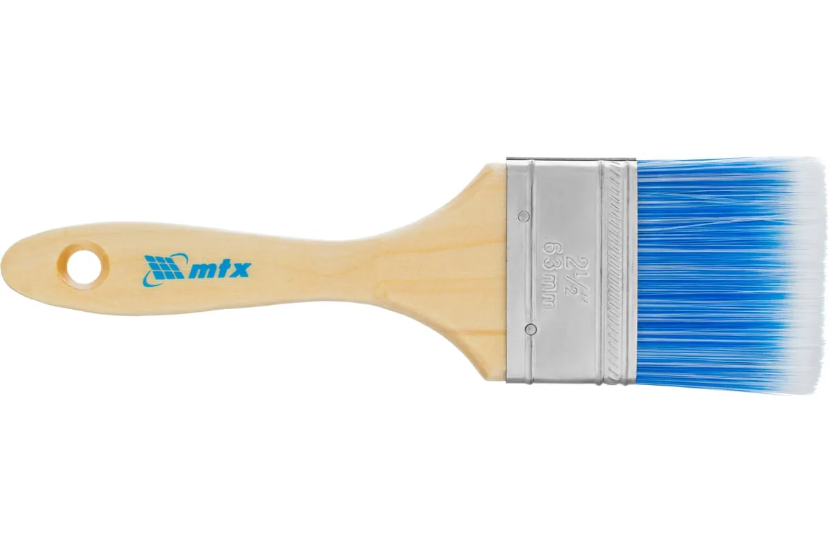 Плоская кисть MTX «Евро» 83072 шириной 2,5", с искусственной щетиной и деревянной ручкой, предназначена для малярных работ. Оптимальна для работы с водорастворимыми ЛКМ (акриловыми, латексными, водоэмульсионными), удобна для обработки участков небольшой площади. Кисть подходит для профессионального использования.