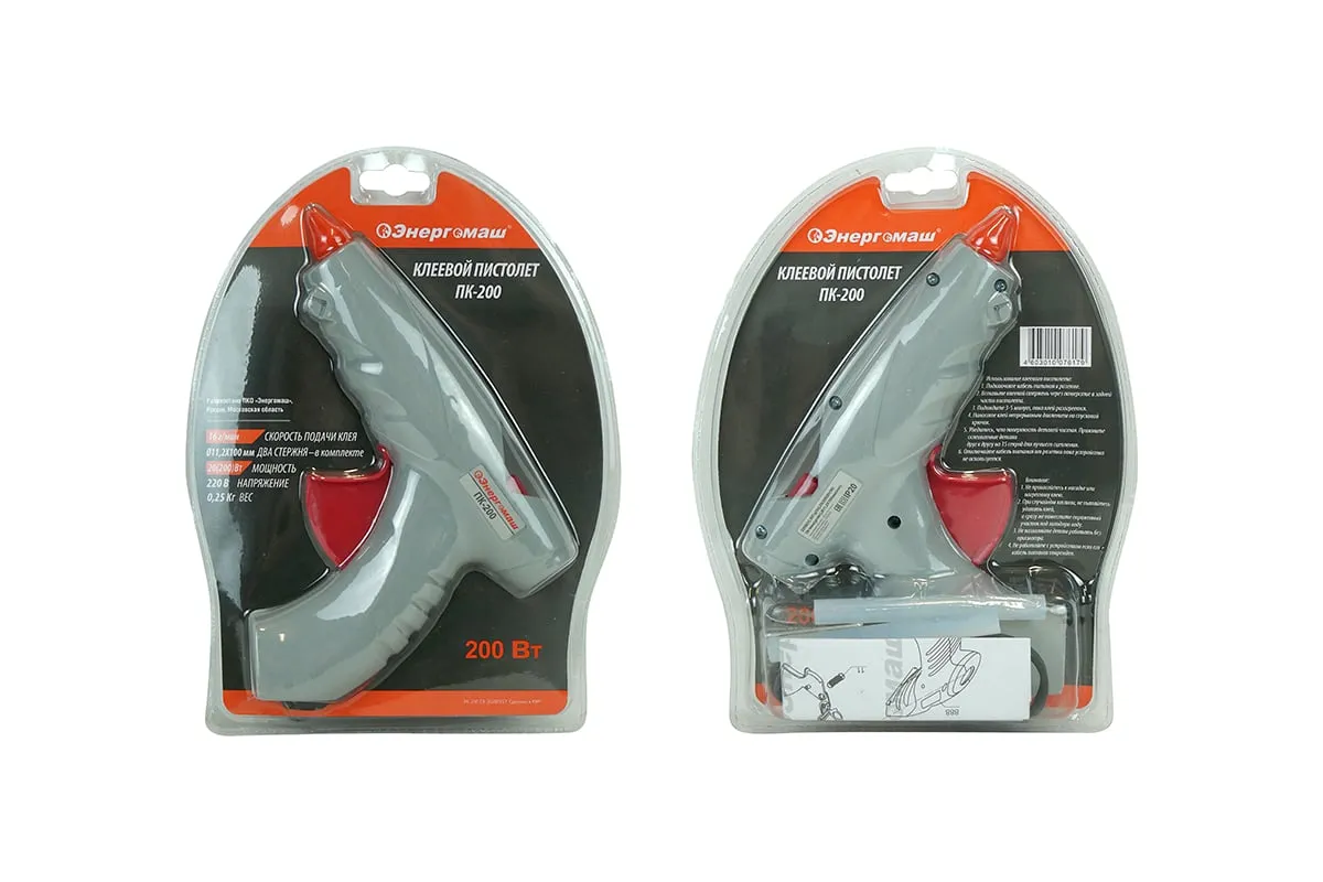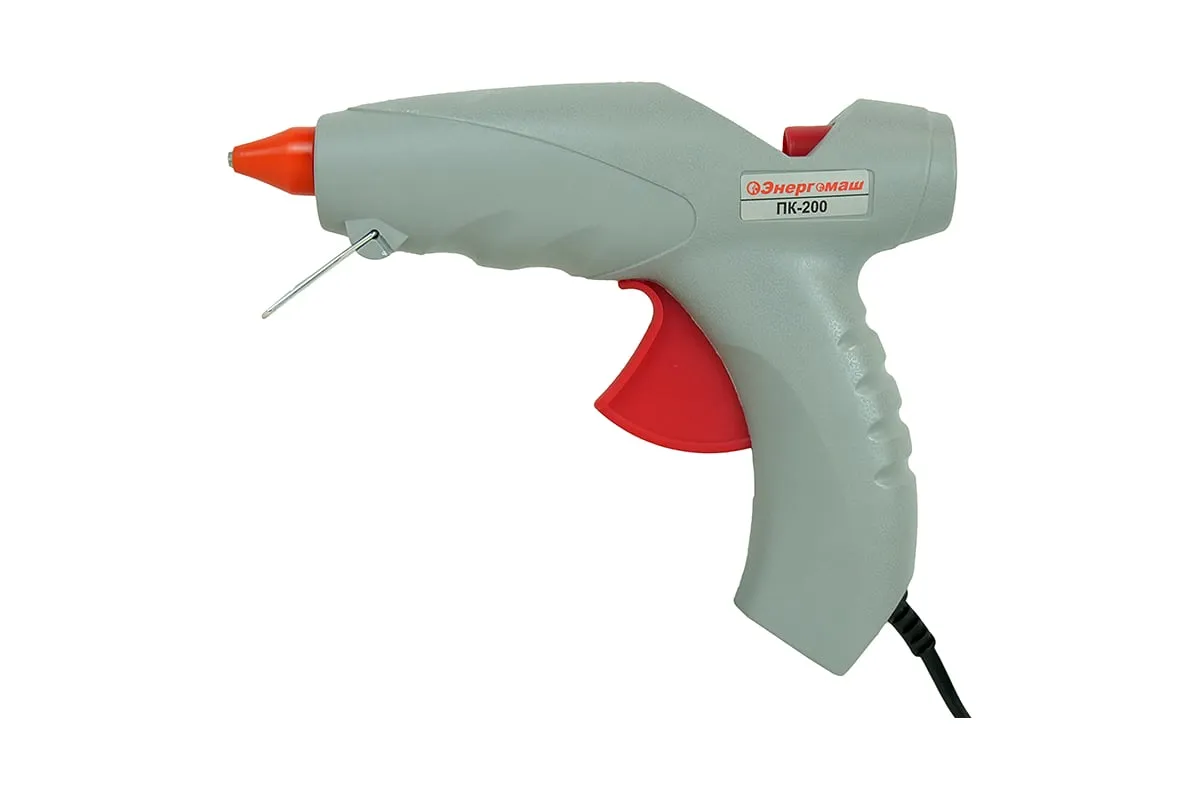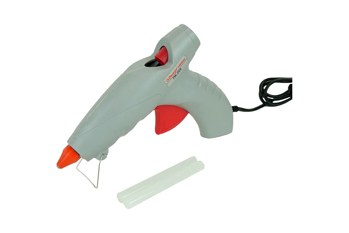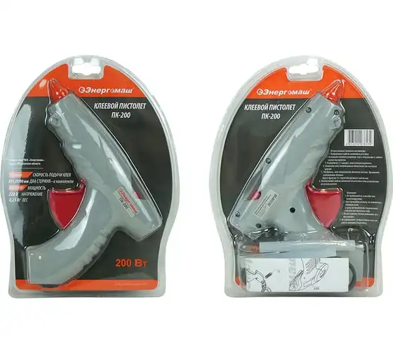 Клеевой пистолет Энергомаш 200 Вт ПК-200 обеспечивает аккуратные результаты нанесения клея и быструю фиксацию изделий. Хорошо склеивает пластмассу, бумагу, картон, искусственную кожу и т.д.