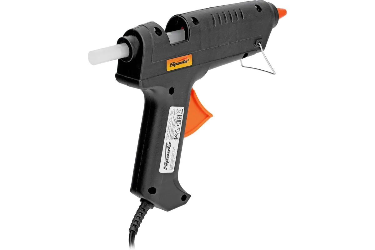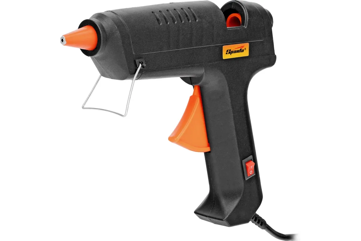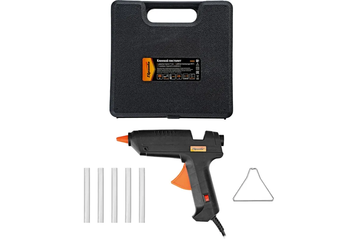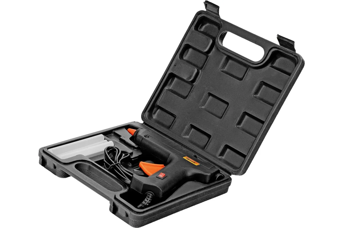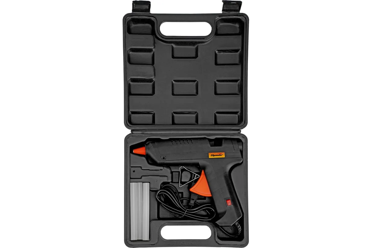 Клеевой пистолет с выключателем Sparta 93020 мощностью 80 Вт и производительностью 10 г/мин совместим со стержнями диаметром 11 мм и поставляется в кейсе. Пригодится для проведения несложных бытовых работ: склеивания бумаги, древесины, пластика и других материалов. Время нагрева до максимальной температуры не превышает 5,5 минут. Пистолет незаменим для частных мастеров, которые занимаются мелким ремонтом, упаковкой, сборкой различных моделей и рукоделием.