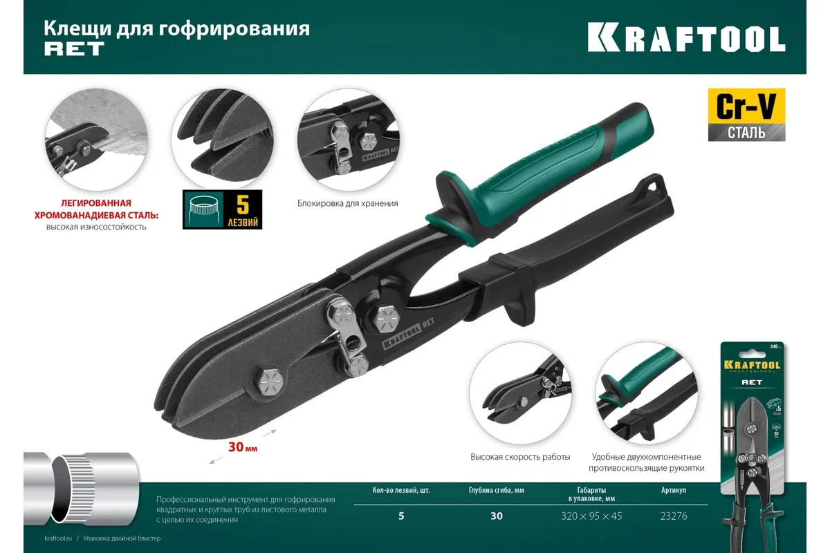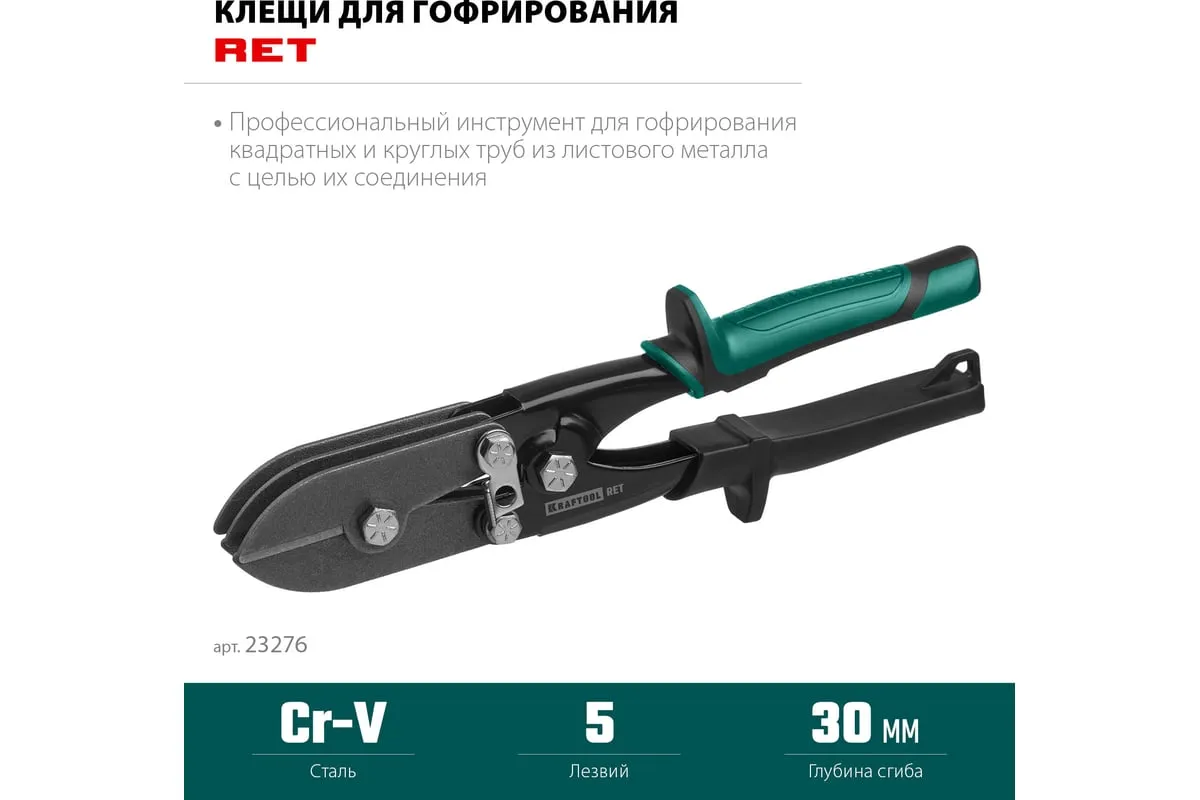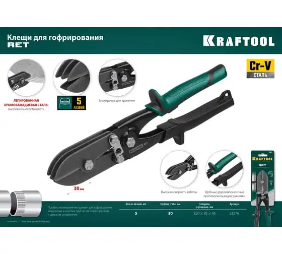 Клещи для гофрирования KRAFTOOL 23276, предназначены для гофрирования квадратных и круглых труб из листового металла с целью их соединения. Имеют 5 лезвий. Изготовлены из высококачественной легированной хромованадиевой стали. что обеспечивает высокую износостойкость.