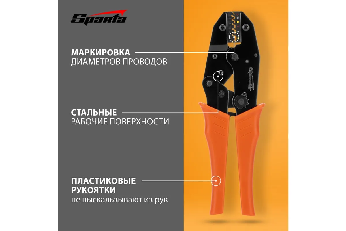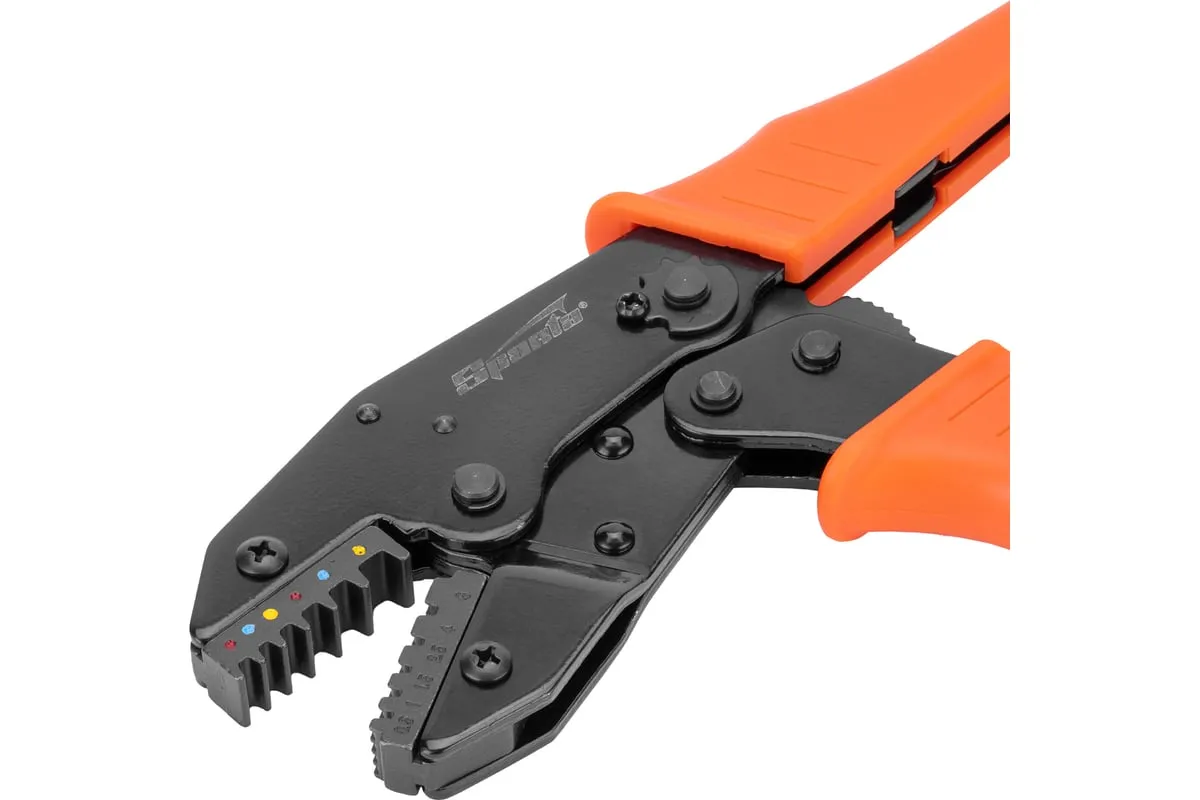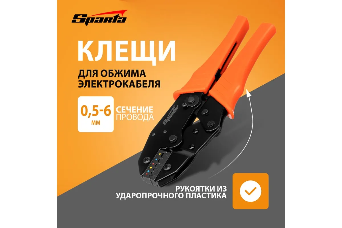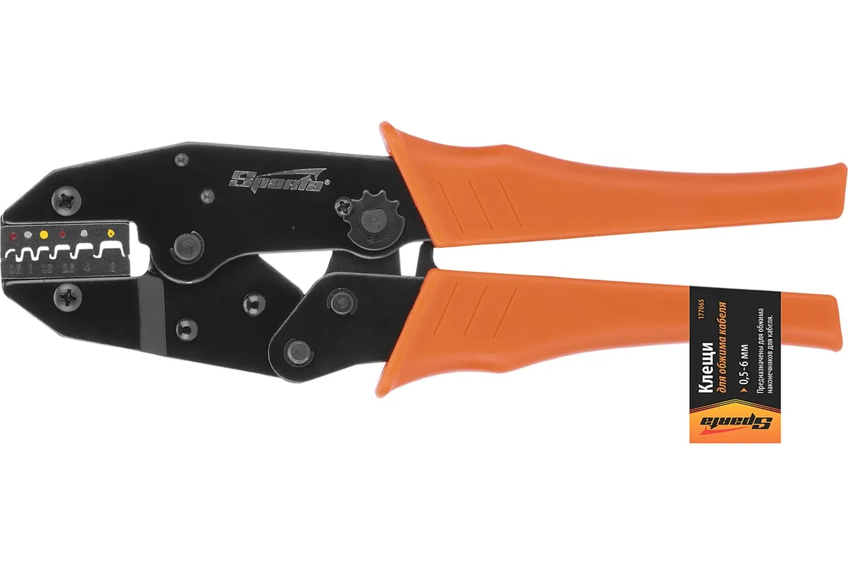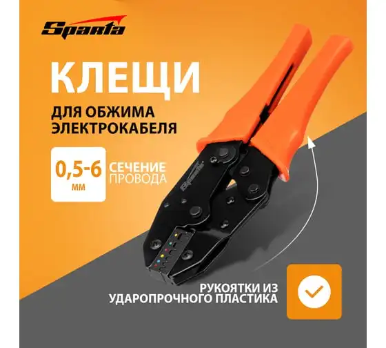 Клещи для обжима электрокабеля 0,5–6 мм SPARTA 177065 предназначены для снятия мягкой изоляции с проводов и обжима стандартных контактных клемм для проводов и высоковольтных проводов зажигания. Рабочие поверхности клещей изготовлены из стали и окрашены. Рукоятки изготовлены из ударопрочного пластика.