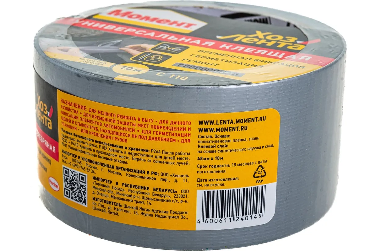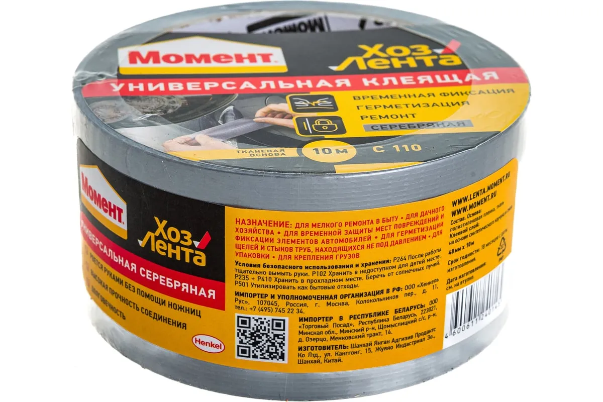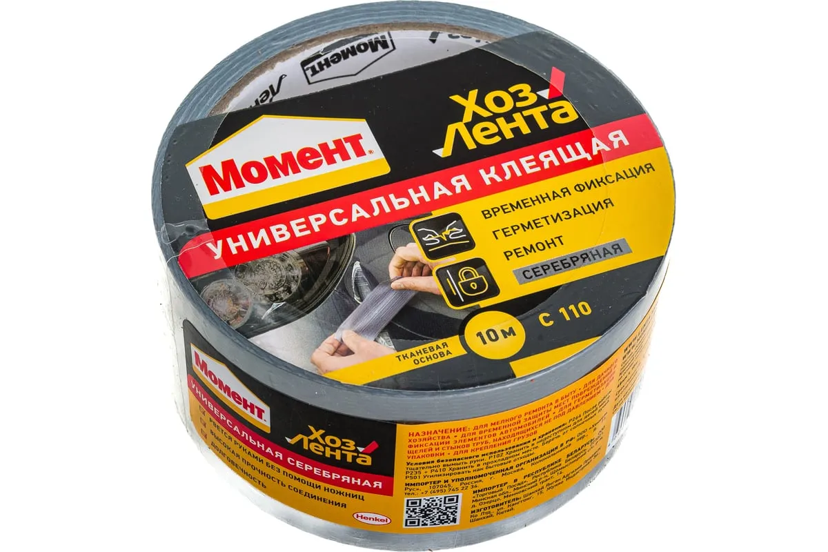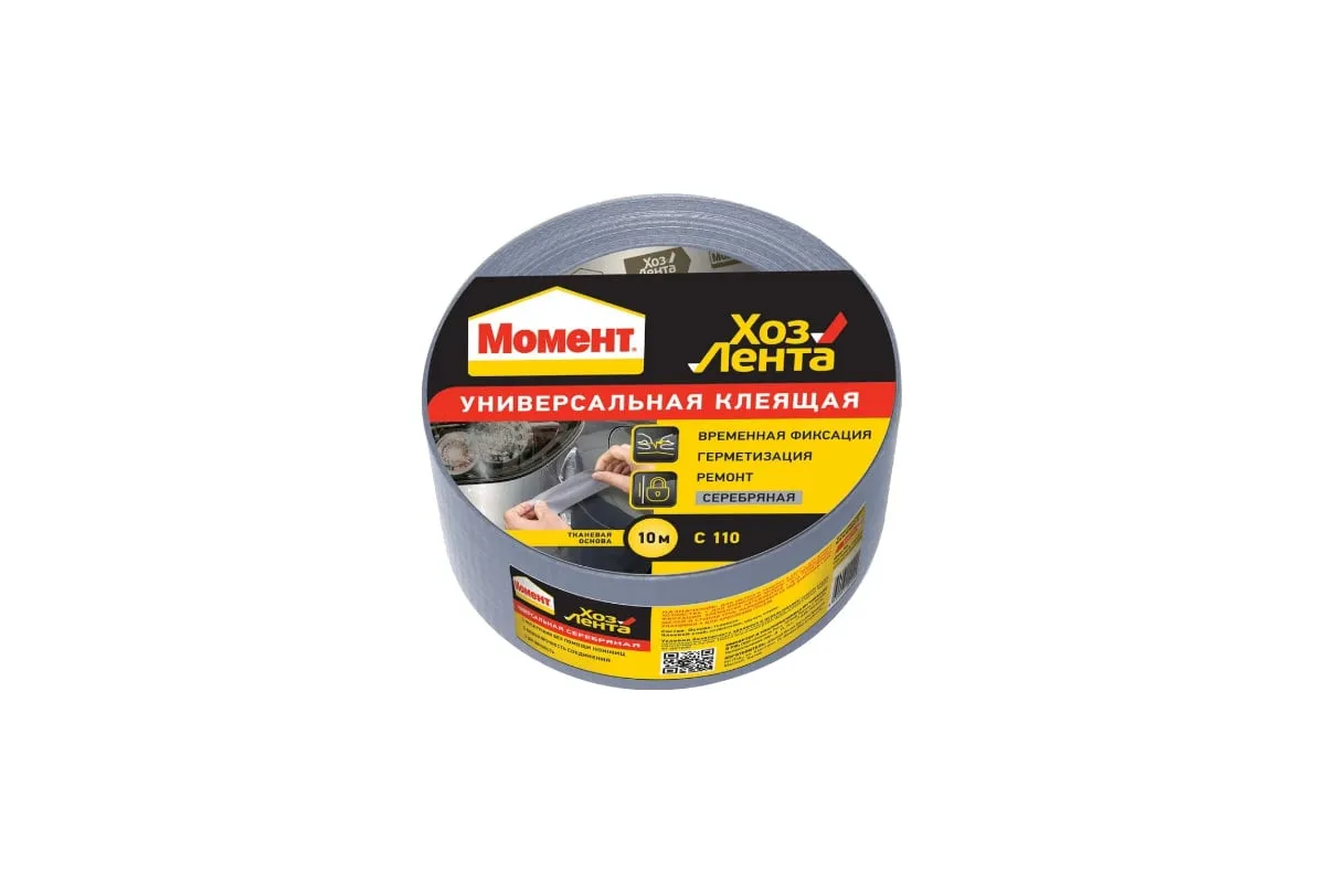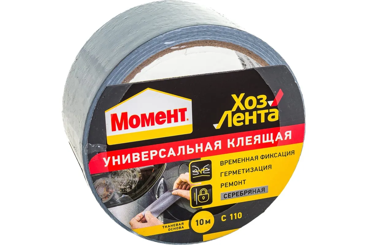 Хозлента Момент 1161082 имеет серебристый цвет и адгезивную систему на тканевой основе. Лента удобна в использовании и легко рвется руками. Ее применяют для временного ремонта изделий, для упаковки, герметизации и изоляции. Необходимо хранить при температуре от -5ºС до +40ºС. Срок годности — 18 месяцев.