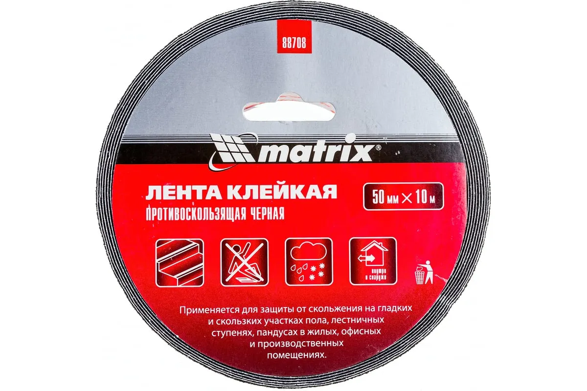 Клейкая противоскользящая лента Matrix 88708 черного цвета, шириной 50 мм и длиной 10 м, позволяет снизить риск получения травм на лестницах, кафеле и других скользких поверхностях. Пригодится в помещениях с большой посещаемостью: общественных зданиях, многоквартирных домах, бассейнах и др. Благодаря прочному клеевому составу лента крепится на любые поверхности: ламинат, кафель и т. д. Ленту следует монтировать при температуре выше +12 ℃ на предварительно очищенную сухую поверхность.