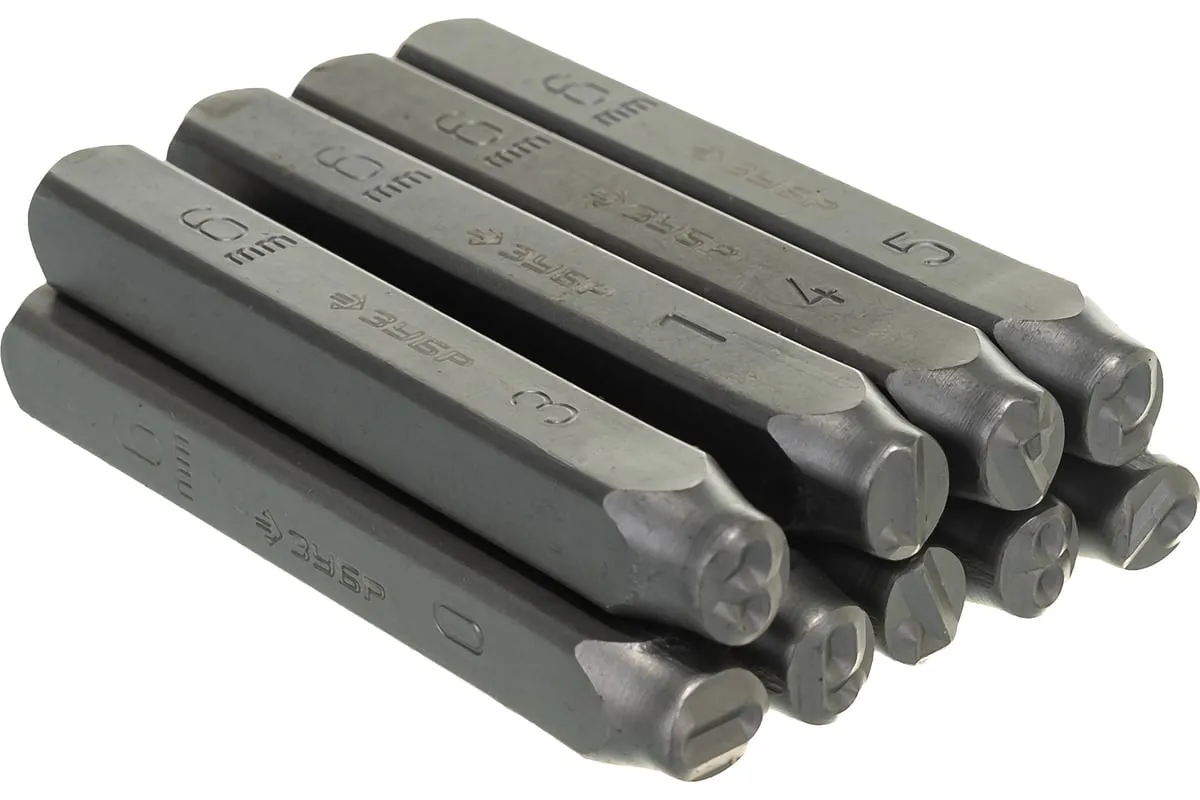 Клейма ЭКСПЕРТ Зубр 21501-06_z01 предназначены для нанесения штампов в виде арабских цифр на различные поверхности. Изготовлены из высококачественной легированной хромом инструментальной стали и имеют никелированное покрытие. Характеристики:
