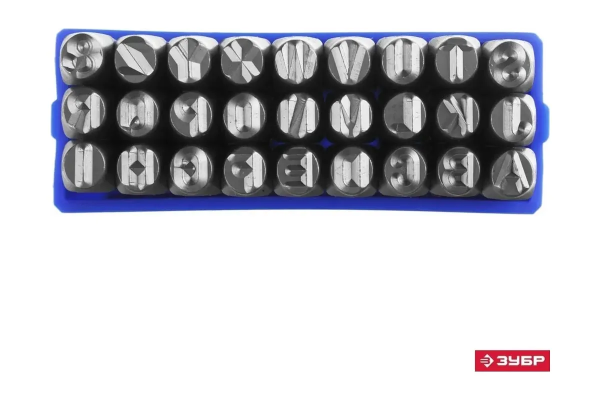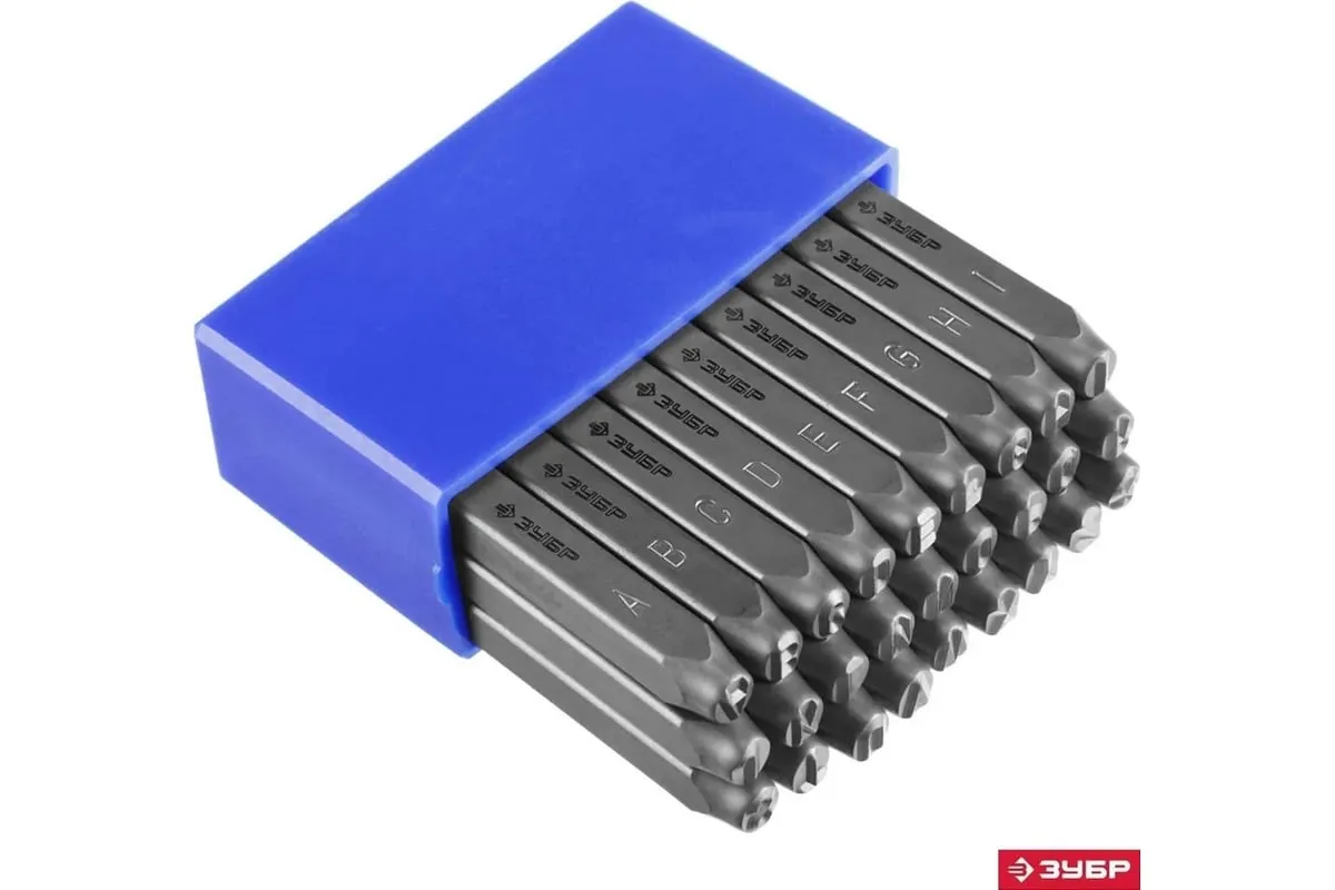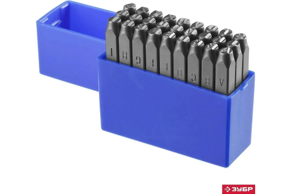 Клейма буквенные латинские, шрифт 6мм ЗУБР Профессионал 21505-06_z01 со специальным никелированным покрытием обладают повышенным ресурсом. Применяются в промышленности, коммунальном секторе, профессионалных и личных мастерских. Предназначены для нанесения штампов в виде буквенных символов на различные поверхности.