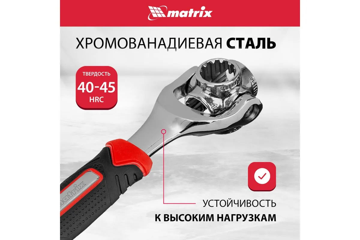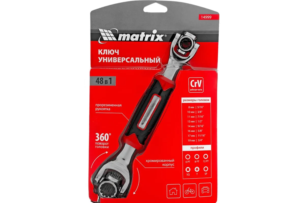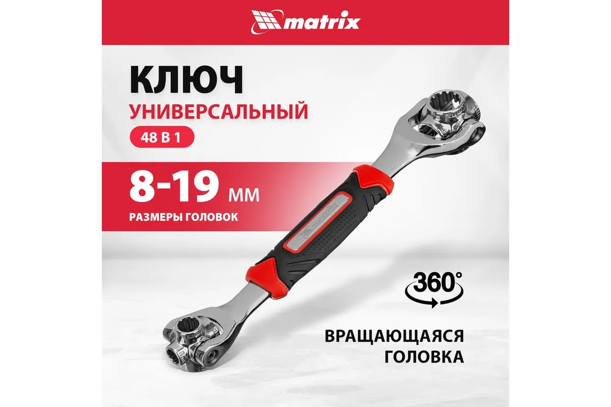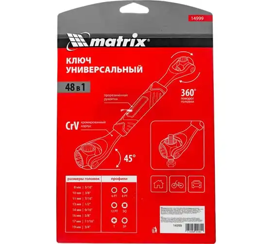 Ключ универсальный 48 в 1 Matrix 14999 из стали CrV имеет 8 размеров головок: 8 мм, 10 мм, 11 мм, 13 мм, 14 мм, 16 мм, 17 мм, 19 мм. Подходит для различных профилей: 6-гранных, 8-гранных, 12-гранных, Square, Torx, Spline. Предназначен для монтажа и демонтажа болтовых соединений. Поворот головки на 360° и угол наклона 45° позволяют работать в труднодоступных местах. Конструкция головки позволяет закручивать и откручивать крепежи на высоких шпильках.