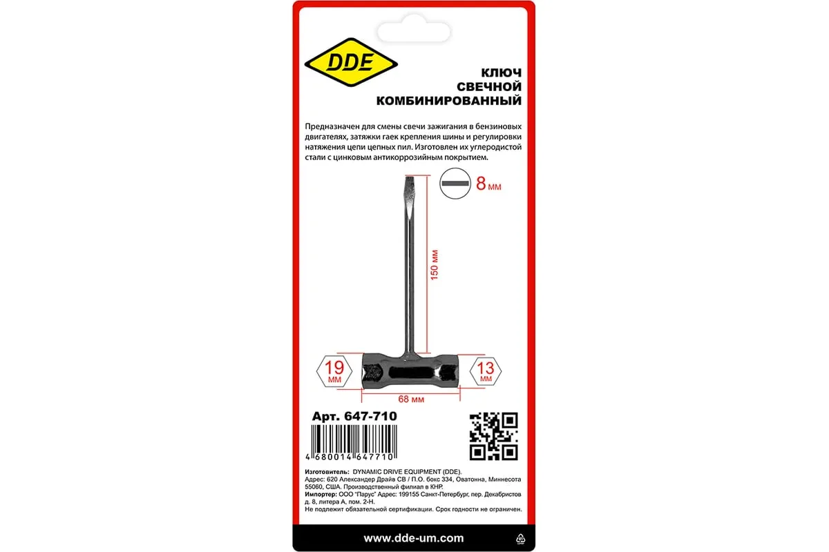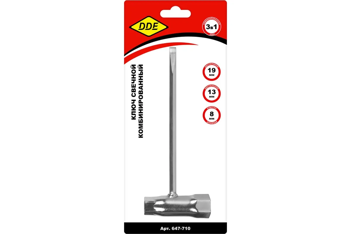Ключ свечной комбинированный 13х19 мм Husqvarna DDE 647-710 необходим при работе с бензоинструментом - пилами, триммерами и другими устройствами. Позволяет без труда сменить свечи зажигания, пильную цепь, затянуть гайки и винты.