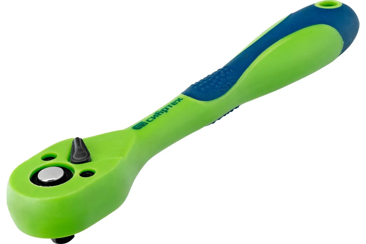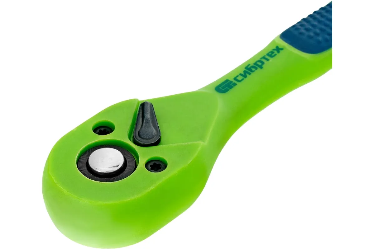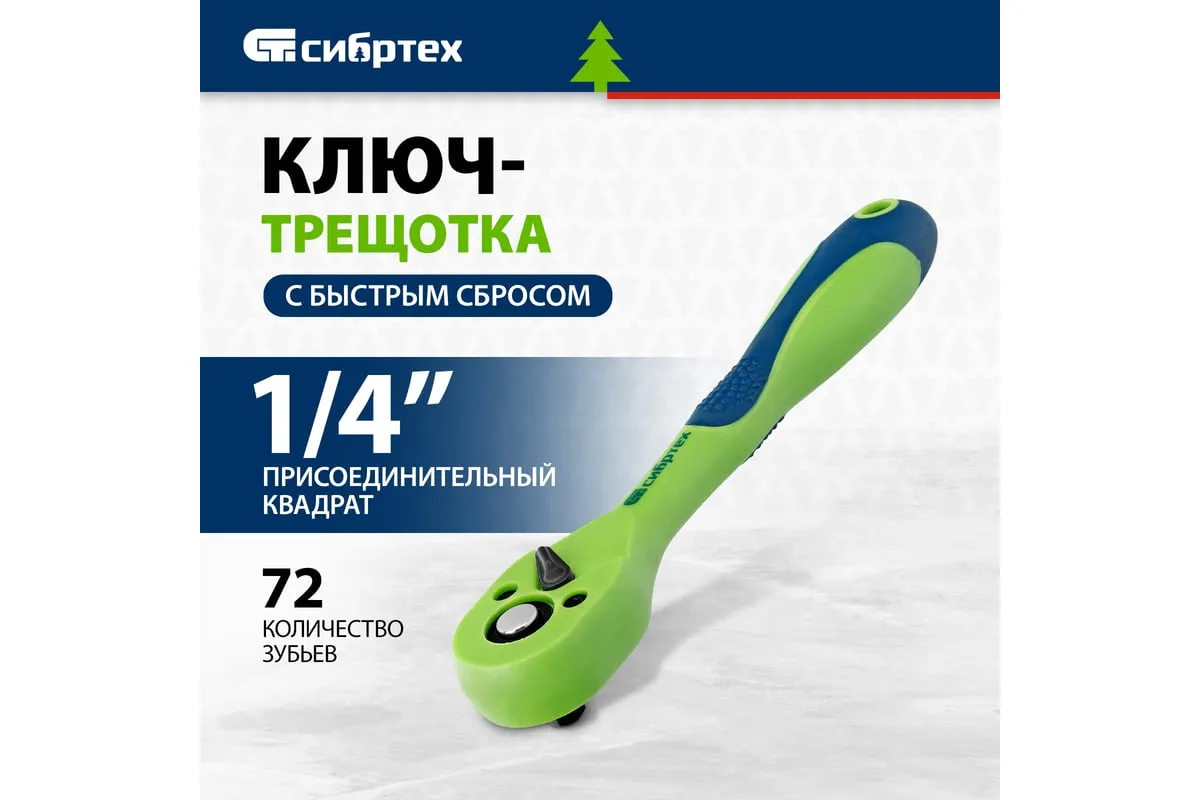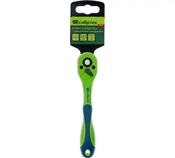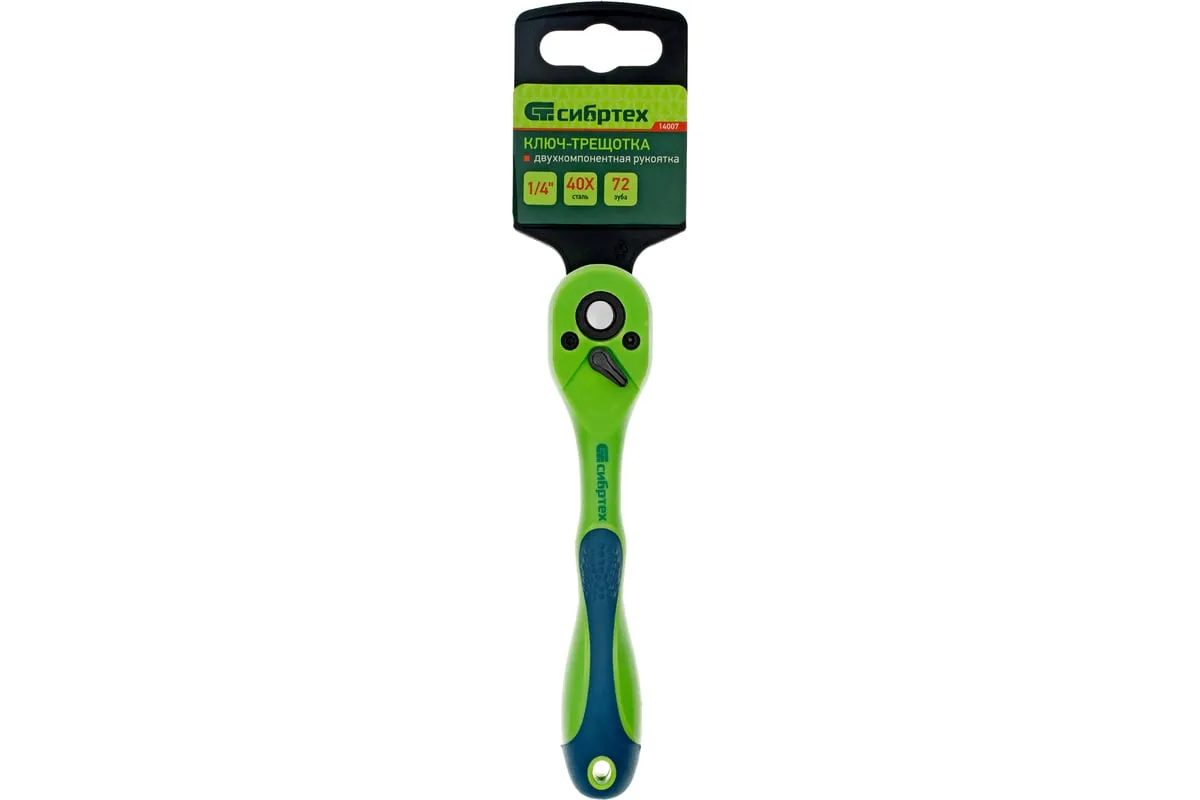 Ключ-трещотка Сибртех 14007 с двухкомпонентной рукояткой и присоединительным квадратом 1/4" используется с торцевыми головками, имеющими посадочное гнездо соответствующего размера. Предназначен для закручивания и раскручивания резьбовых соединений. Храповой механизм с 72 зубцами обеспечивает плавное вращение. Ключ применяется для ремонта автомобилей, техники и оборудования, а также пригодится дома или на даче.