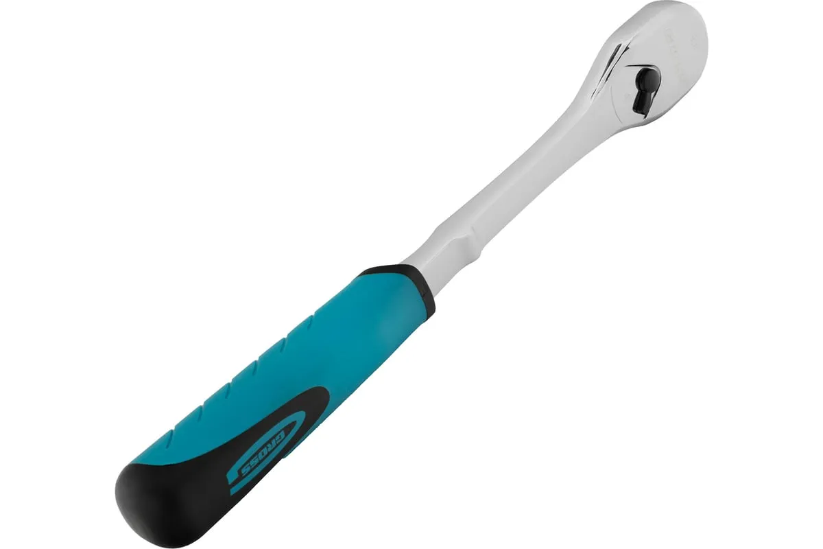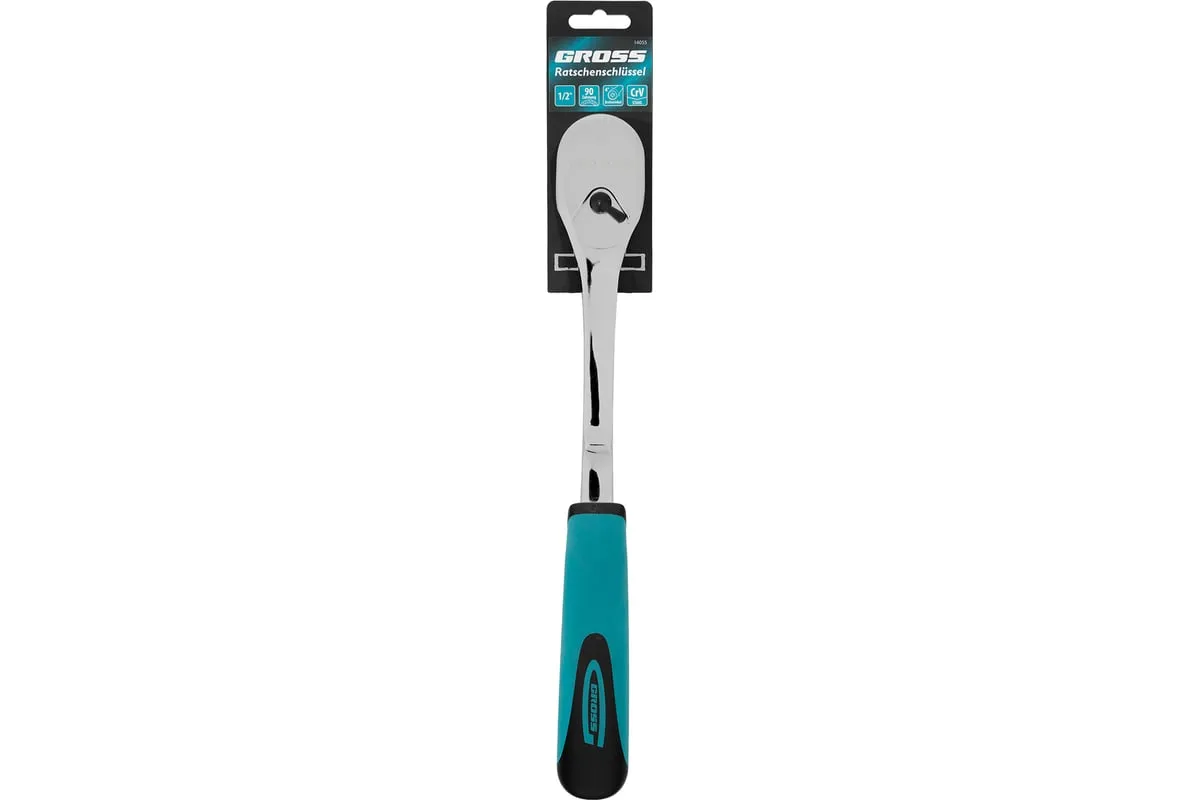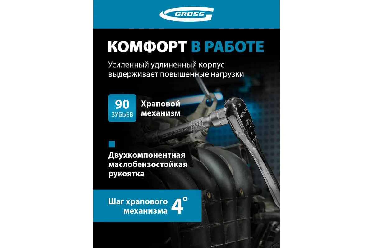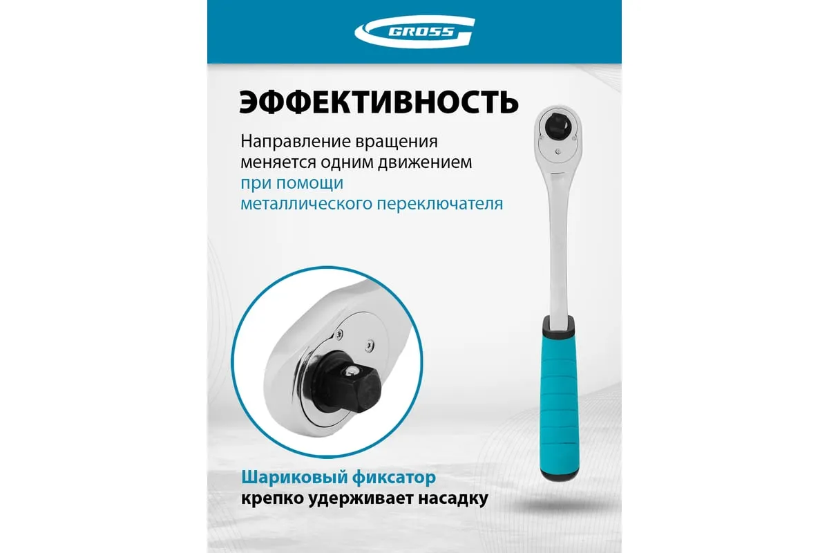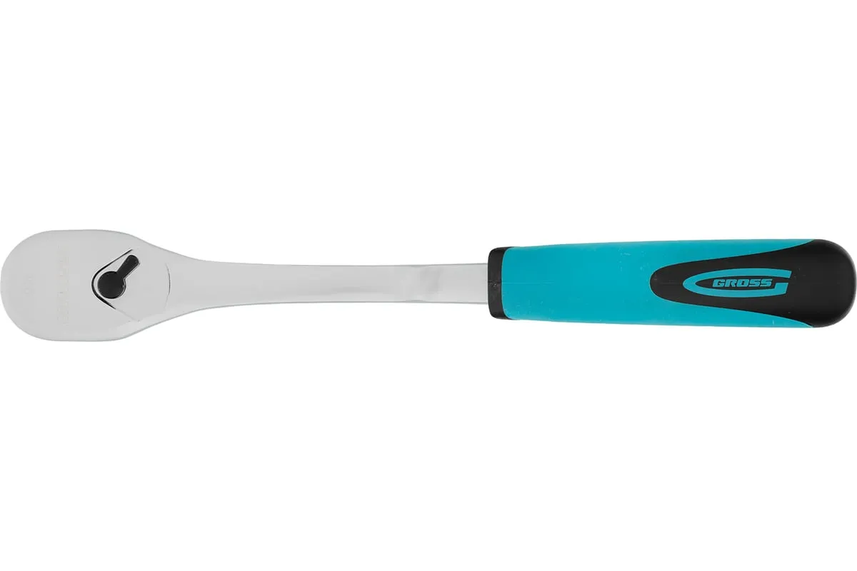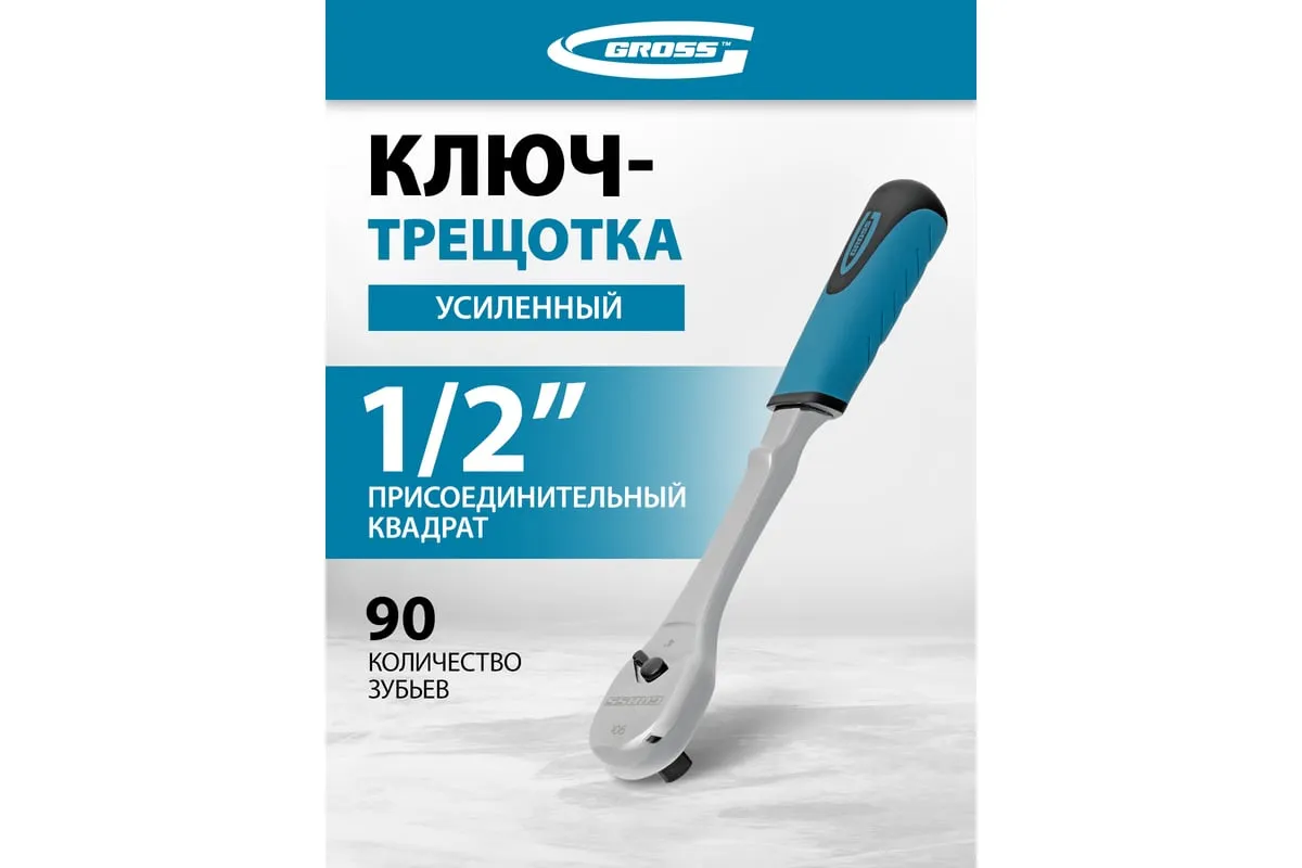 Усиленный ключ-трещотка Gross 14055 с присоединительным квадратом 1/2" оснащен храповым механизмом с 90 зубьями.