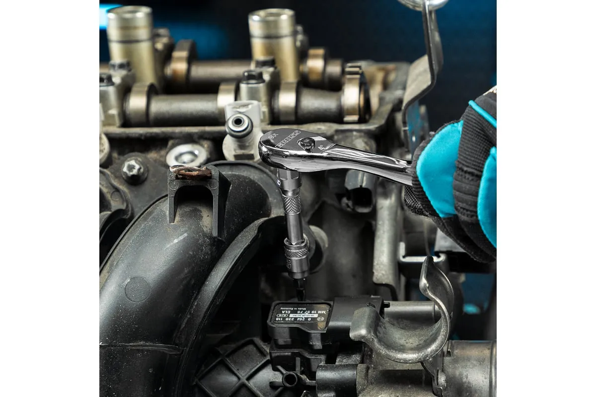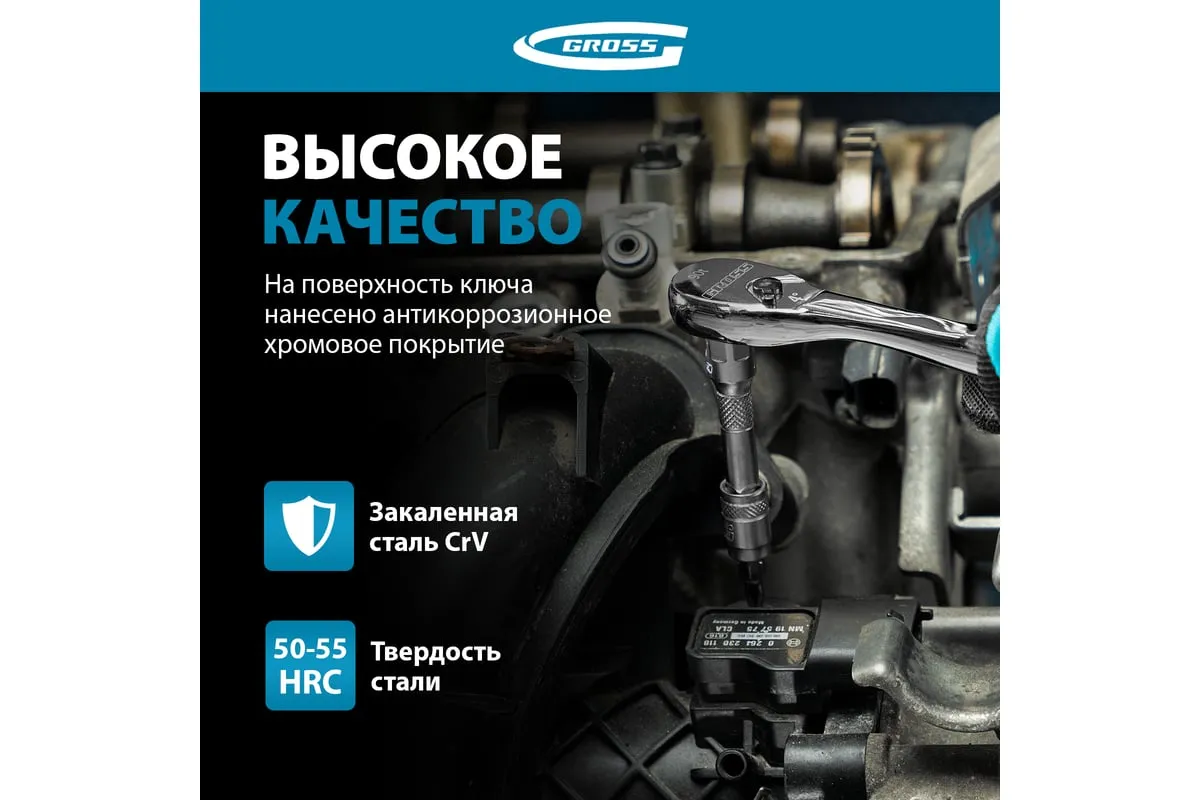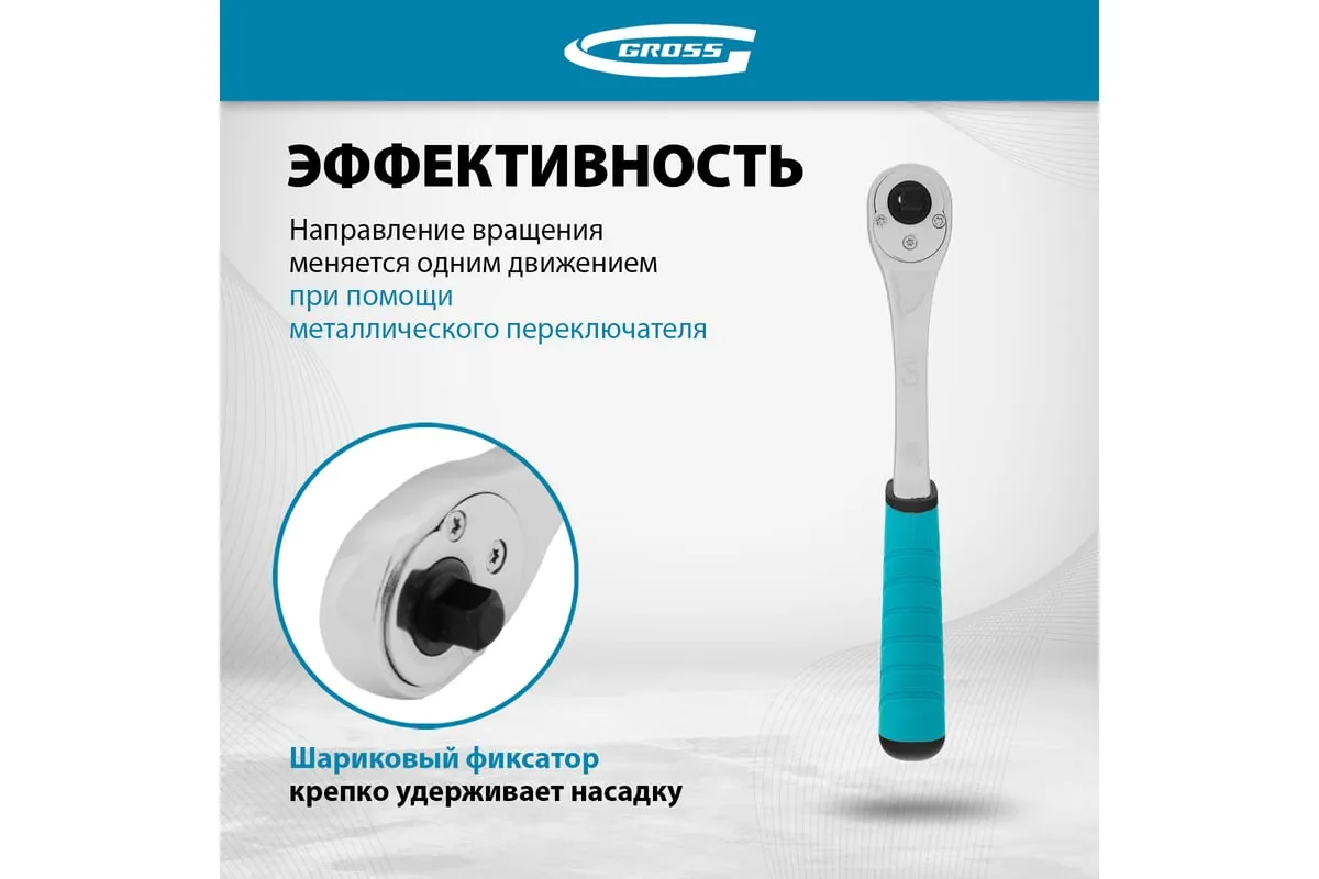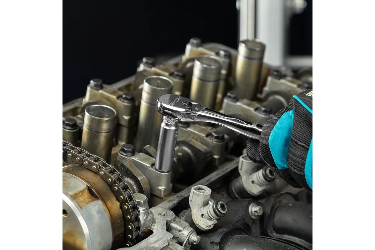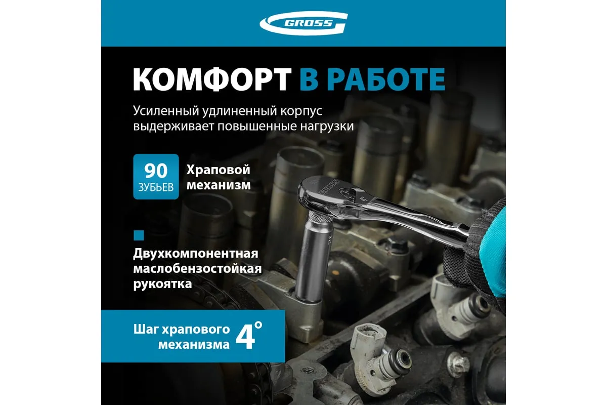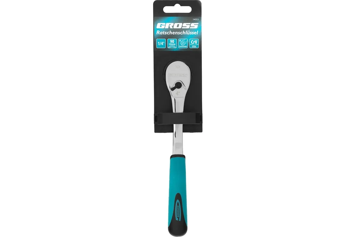 Усиленный ключ-трещотка Gross 14053 с присоединительным квадратом 1/4" оснащен храповым механизмом с 90 зубьями. Предназначен для установки торцевых головок, а также адаптеров и удлинителей с посадочным отверстием соответствующего размера. Шаг храпового механизма составляет 4°, поэтому инструмент оптимален для использования в труднодоступных местах. Будет полезен в сервисном центре, на СТО, а также пригодится дома или в поездке.