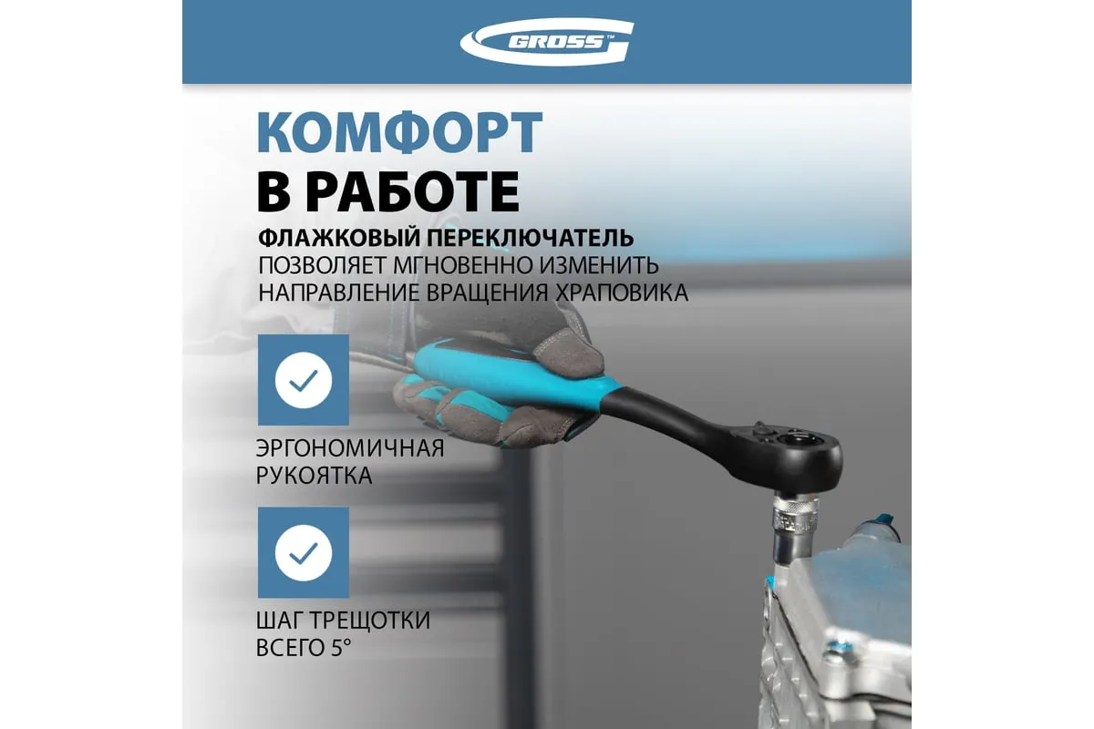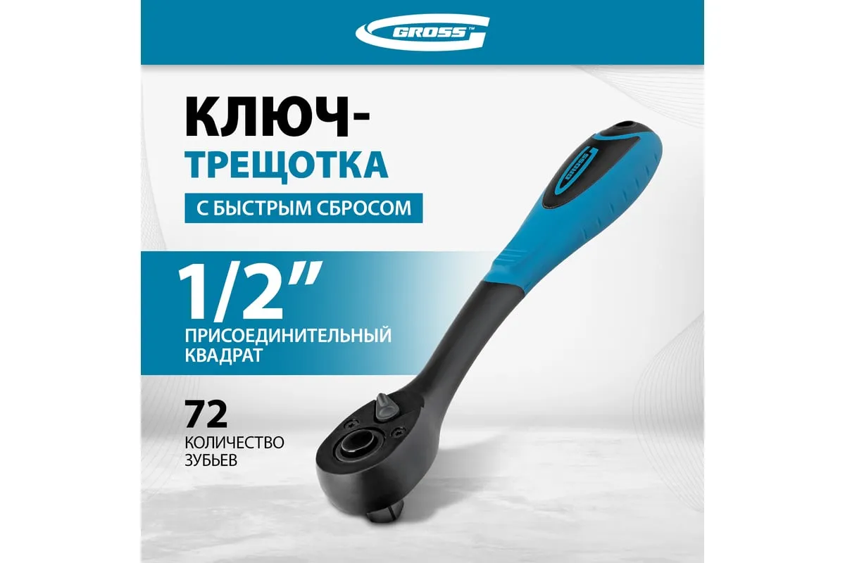 Ключ-трещотка Gross Comfort 14082 из стали CrV, с 2-компонентной рукояткой, присоединительным квадратом 1/2 дюйма и функцией быстрого сброса, оснащен храповым механизмом с 72 зубцами для быстрого и плавного закручивания/откручивания резьбовых крепежей. Удобен для работы в ограниченном пространстве, т.к. шаг трещотки составляет всего 5 градусов. Трещоточный ключ используется в сервисных центрах, авторемонтных мастерских, будет полезен при монтаже оборудования, также пригодится дома, в гараже или на даче.