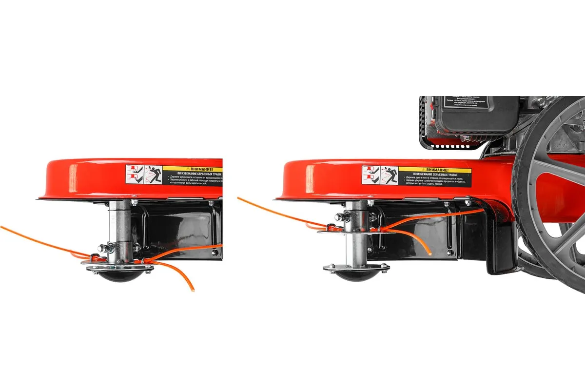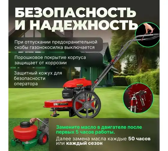 Имеет прочный стальной корпус и бесступенчатую установку высоты кошения.