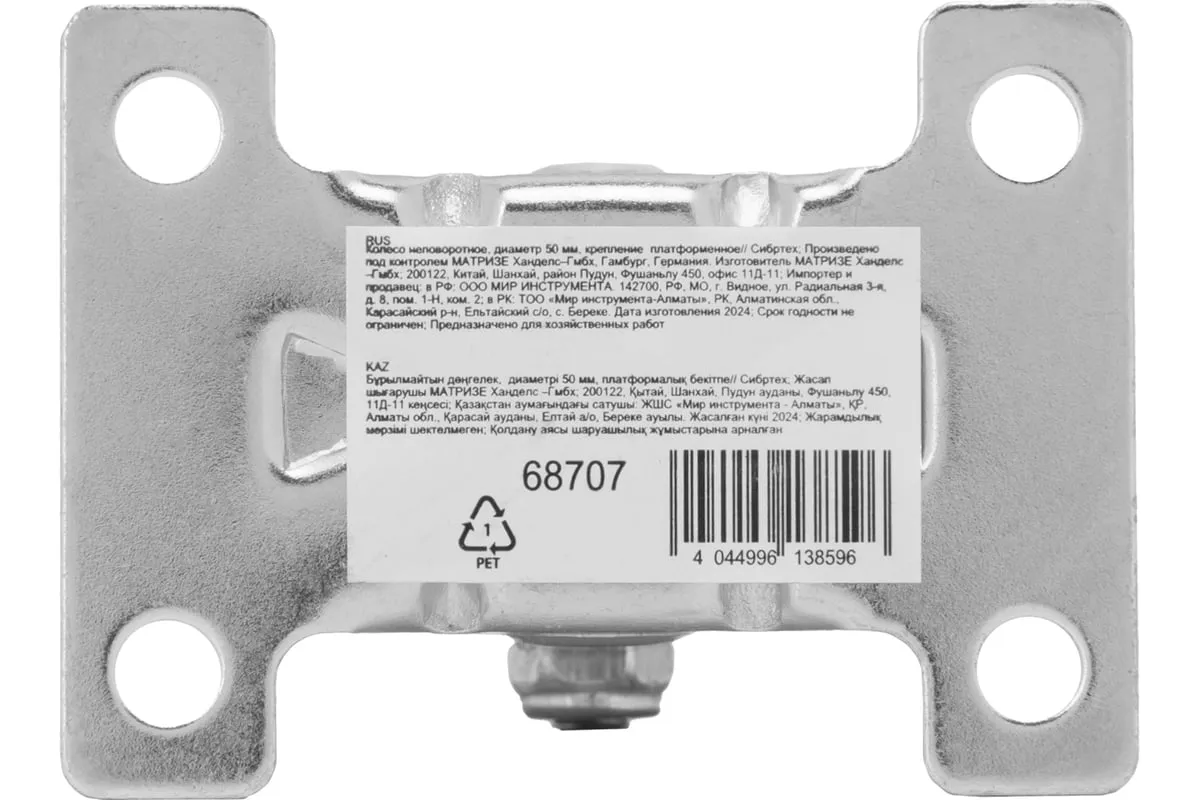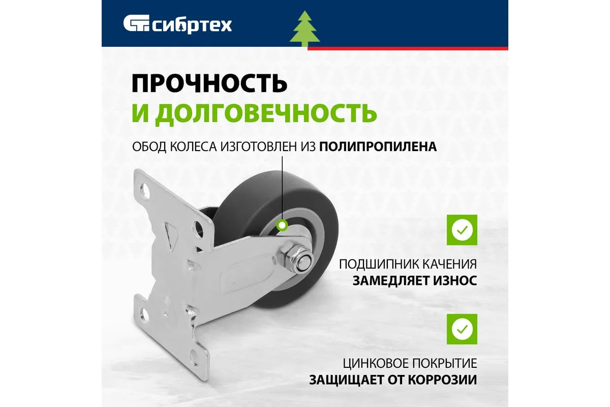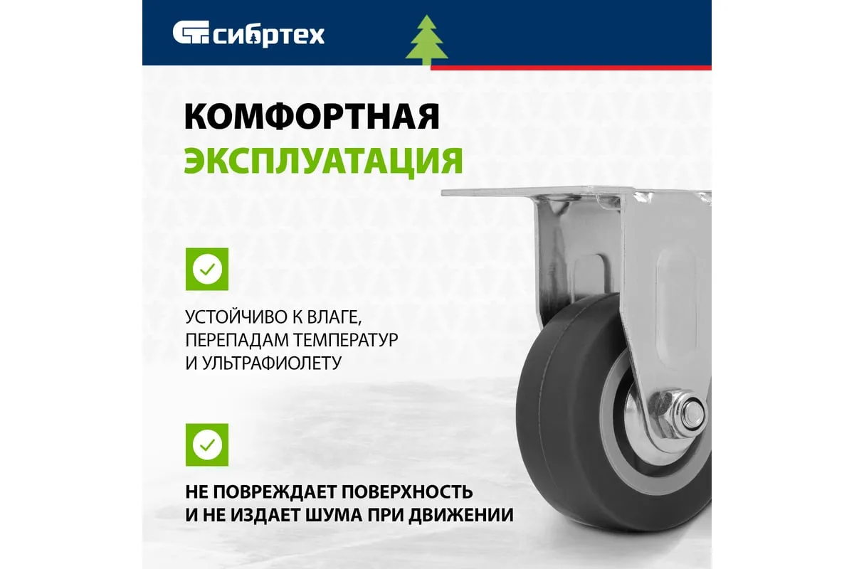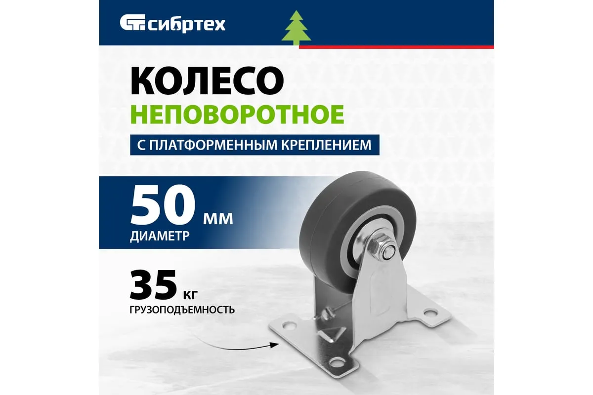 Колесо неповоротное d-50мм крепление платформенное СИБРТЕХ 68707 устанавливается на ручные тележки с высокой грузоподъемностью. Изготовлено из качественных материалов, прослужат долгое время. Данное колесо подходит для использования при температурах от -25 °С до +50 °С.