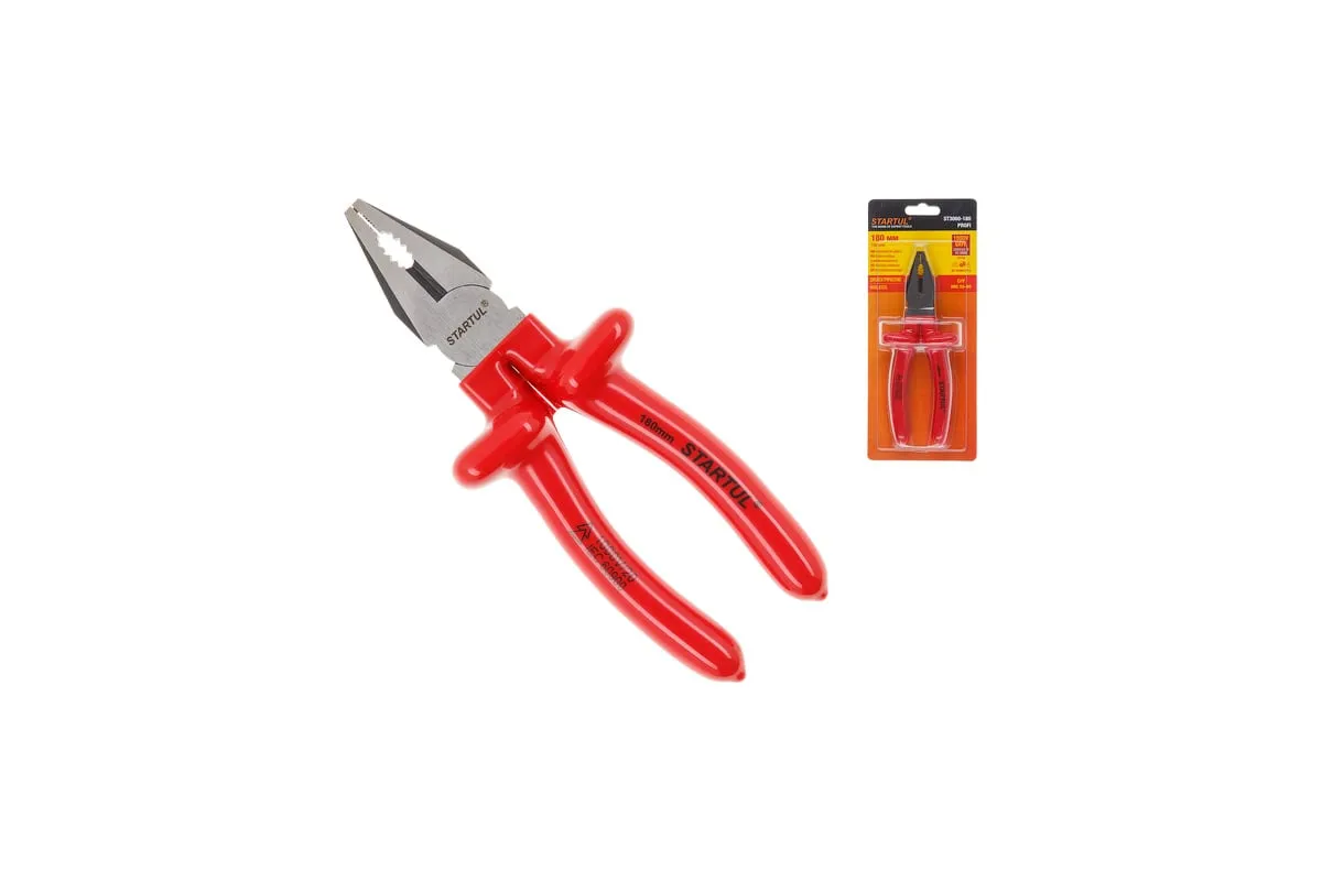 Комбинированные диэлектрические плоскогубцы STARTUL Profi 180 мм ST3060-180 предназначены для выполнения электромонтажных работ под напряжением до 1000 В. Рабочая часть выполнена из качественной хромованадиевой стали, что обеспечивает прочность и долговечность. Никелированное покрытие защищает инструмент от коррозии. Рукоятки выполнены из двухслойной диэлектрической пластизоли и имеют защитные выступы, препятствующие контакту руки с объектом, находящимся под напряжением. Инструмент соответствует электротехническим нормам безопасности Германского союза электротехников - VDE (Veiband Deutscher Electrotechniker).