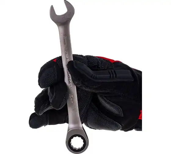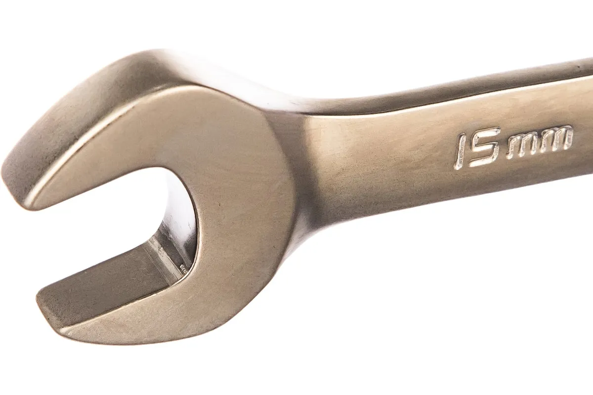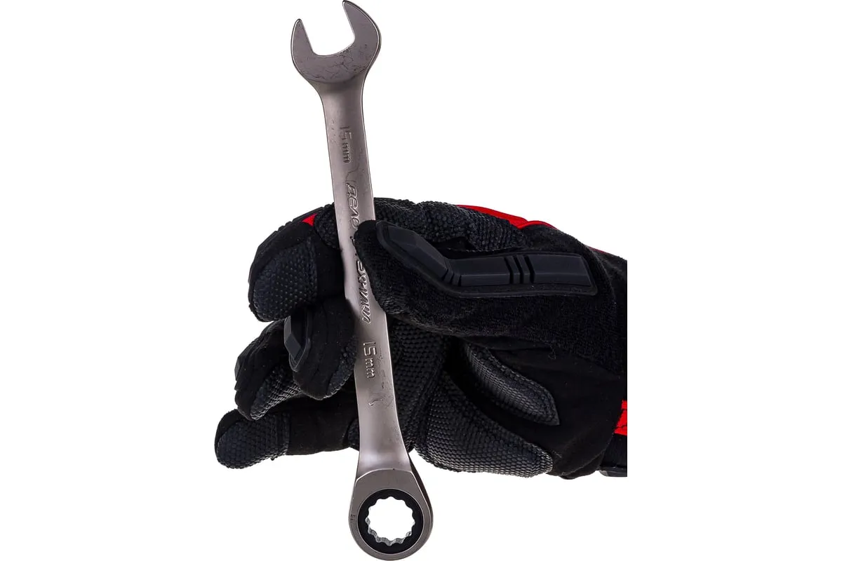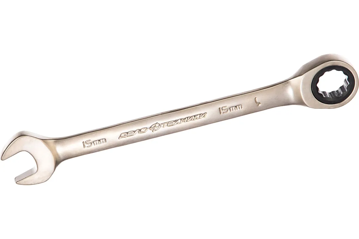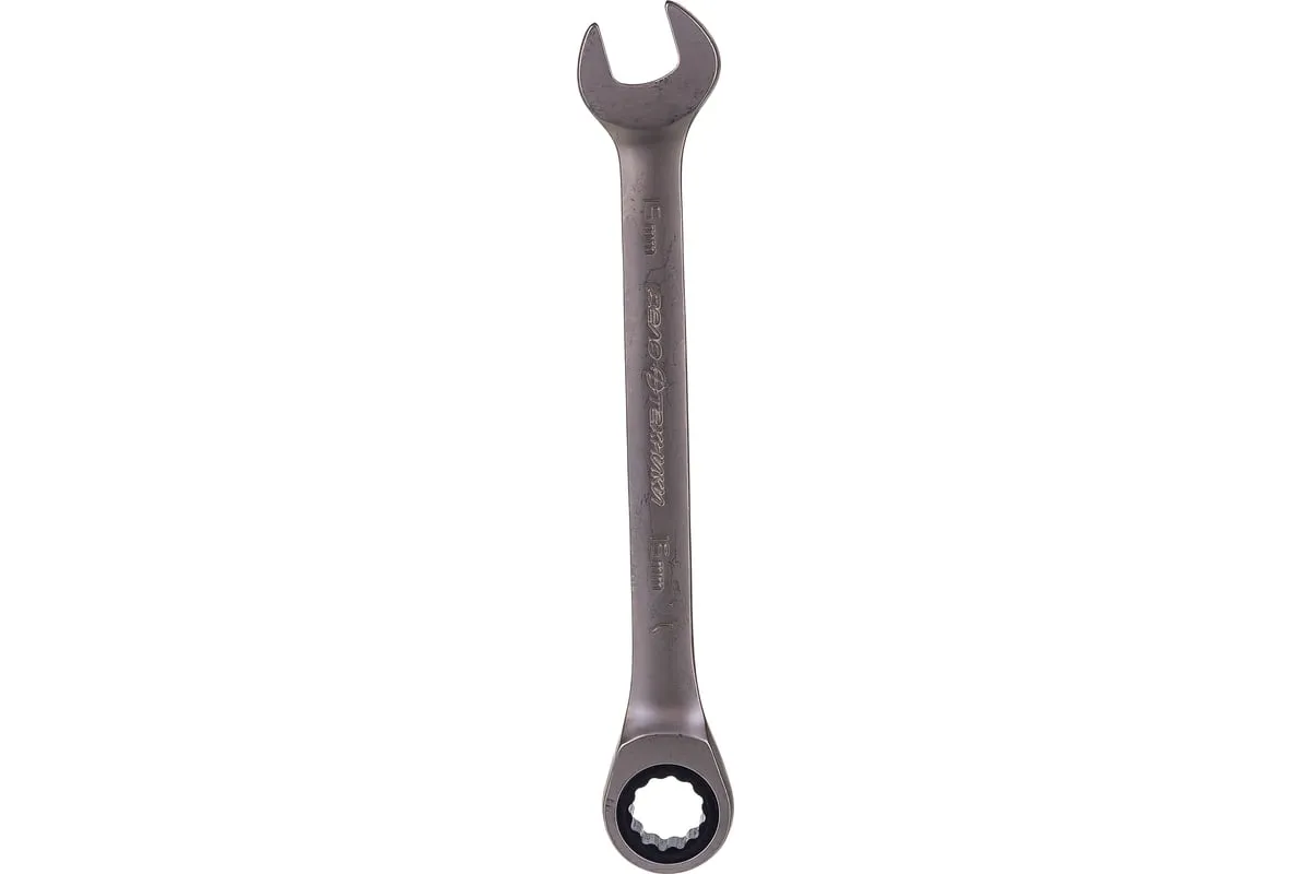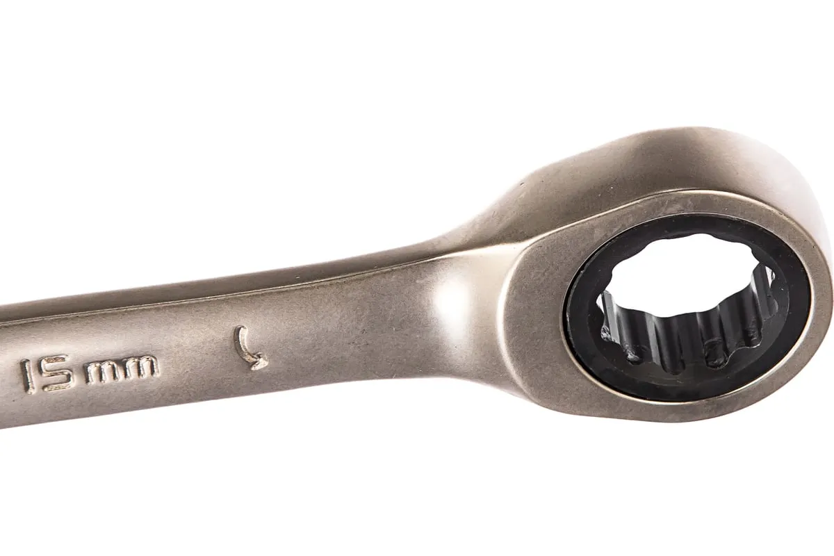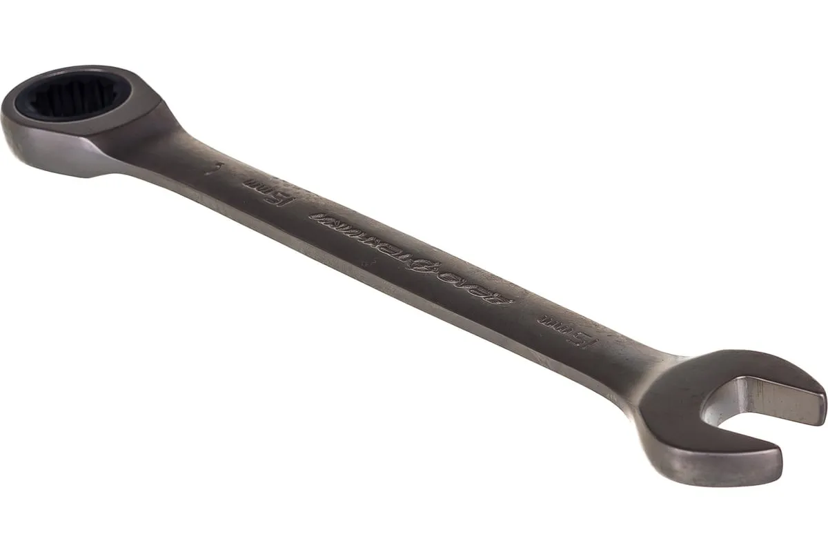 Комбинированный трещоточный ключ 15 мм ДТ 100/5 Дело Техники 515015 изготовлен из хромванадиевой стали, которая обладает повышенной твердостью и стойкостью к интенсивным нагрузкам. Инструмент предназначен для работы с крепежом и резьбовыми соединениями. С одной стороны изделия расположена рожковая головка, с другой - трещотка с 72-зубцовым механизмом.