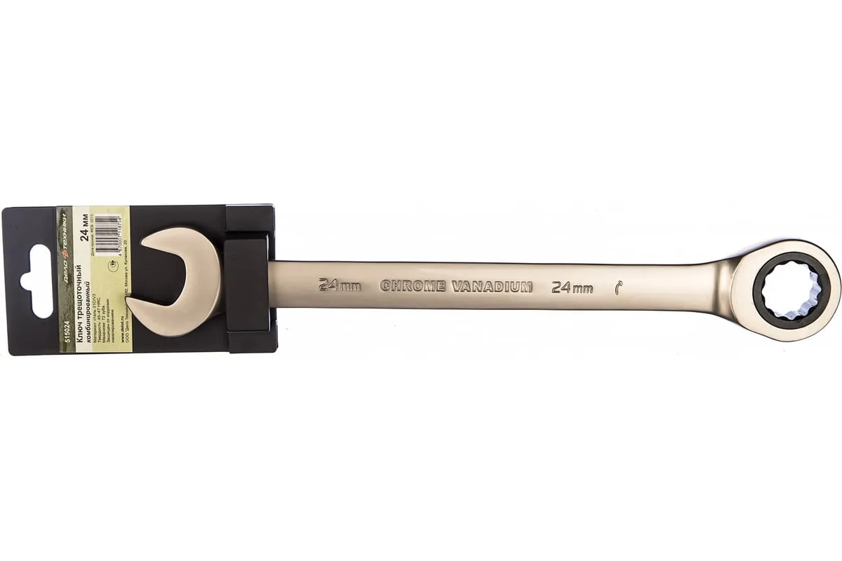 Комбинированный трещоточный ключ 24 мм ДТ 50/5 Дело Техники 515024 предназначен для монтажа и демонтажа крепежных соединений. Простой в применении ручной инструмент, который изготовлен из хромванадиевой стали, стойкой к интенсивным нагрузкам. Состоит из рожковой головки и трещотки с 72-зубцовым механизмом.