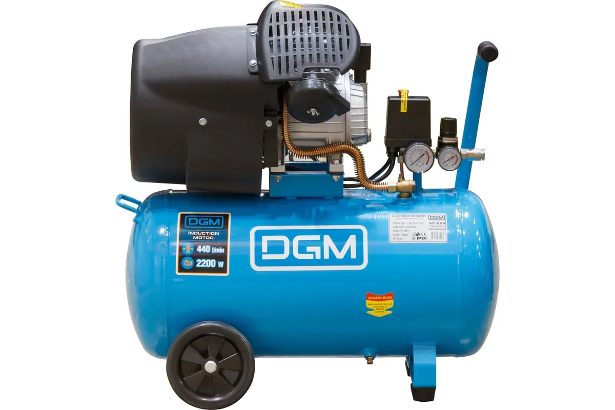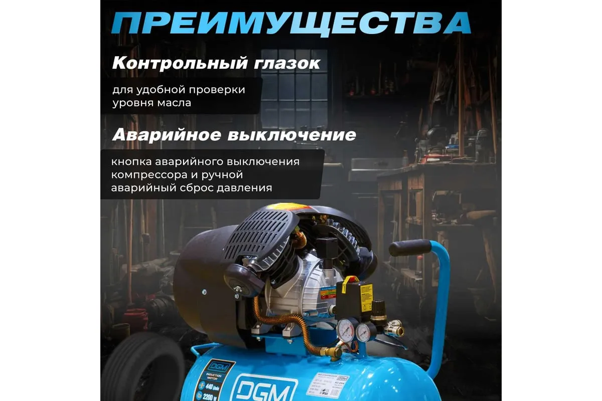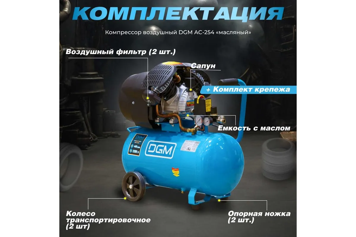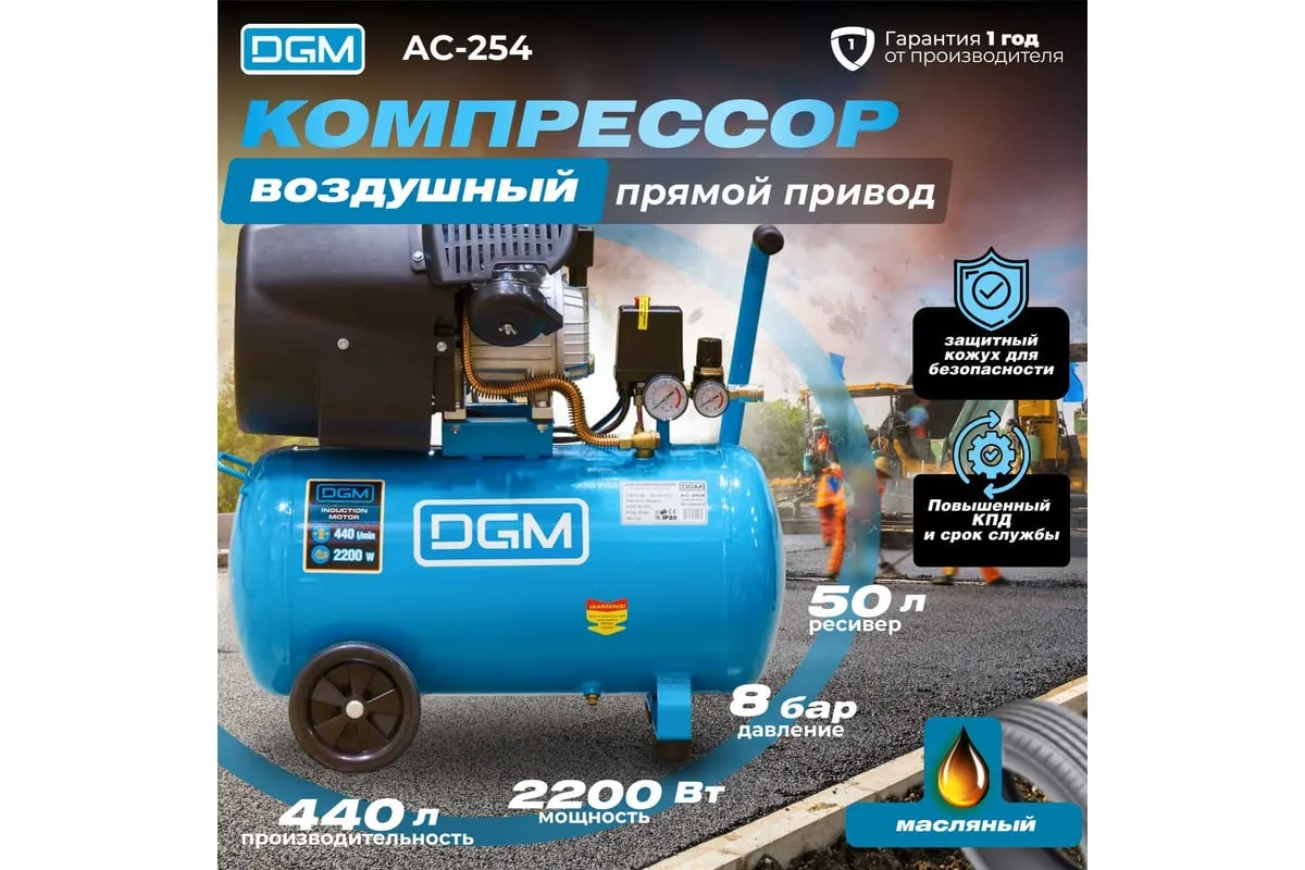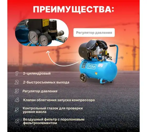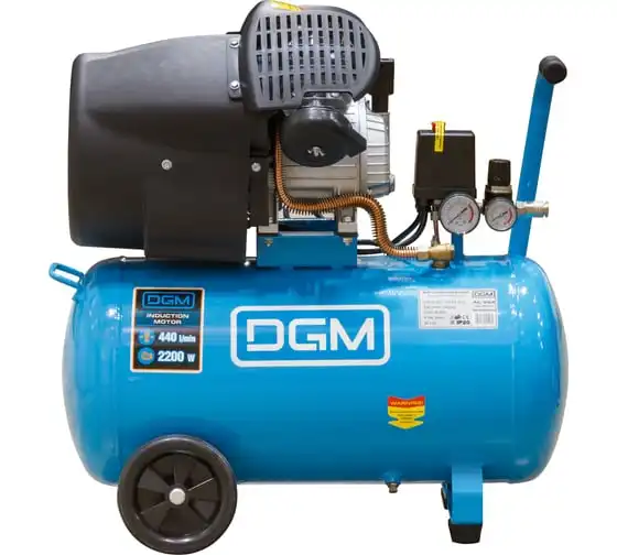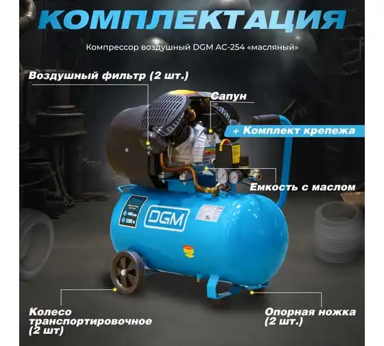 Компрессор DGM AC-254 представляет собой мощный инструмент для производства сжатого воздуха. Особенностью конструкции является наличие колес. Компрессор можно перемещать по горизонтальной поверхности с минимальным усилием. Также для этого установлена тяговая рукоятка. Двойной манометр позволяет отслеживать уровень давления на выходе с компрессора и входе в инструмент. Дополнительно можно установить фильтр для очистки от масла -увеличит ресурс подключаемого оборудования. Высокая мощность и внушительная вместимость ресивера обеспечивают стабильную работу в любых условиях. Если требуется кратковременная подкачка, то необязательно запускать двигатель. Достаточно запасов воздуха из ресивера.